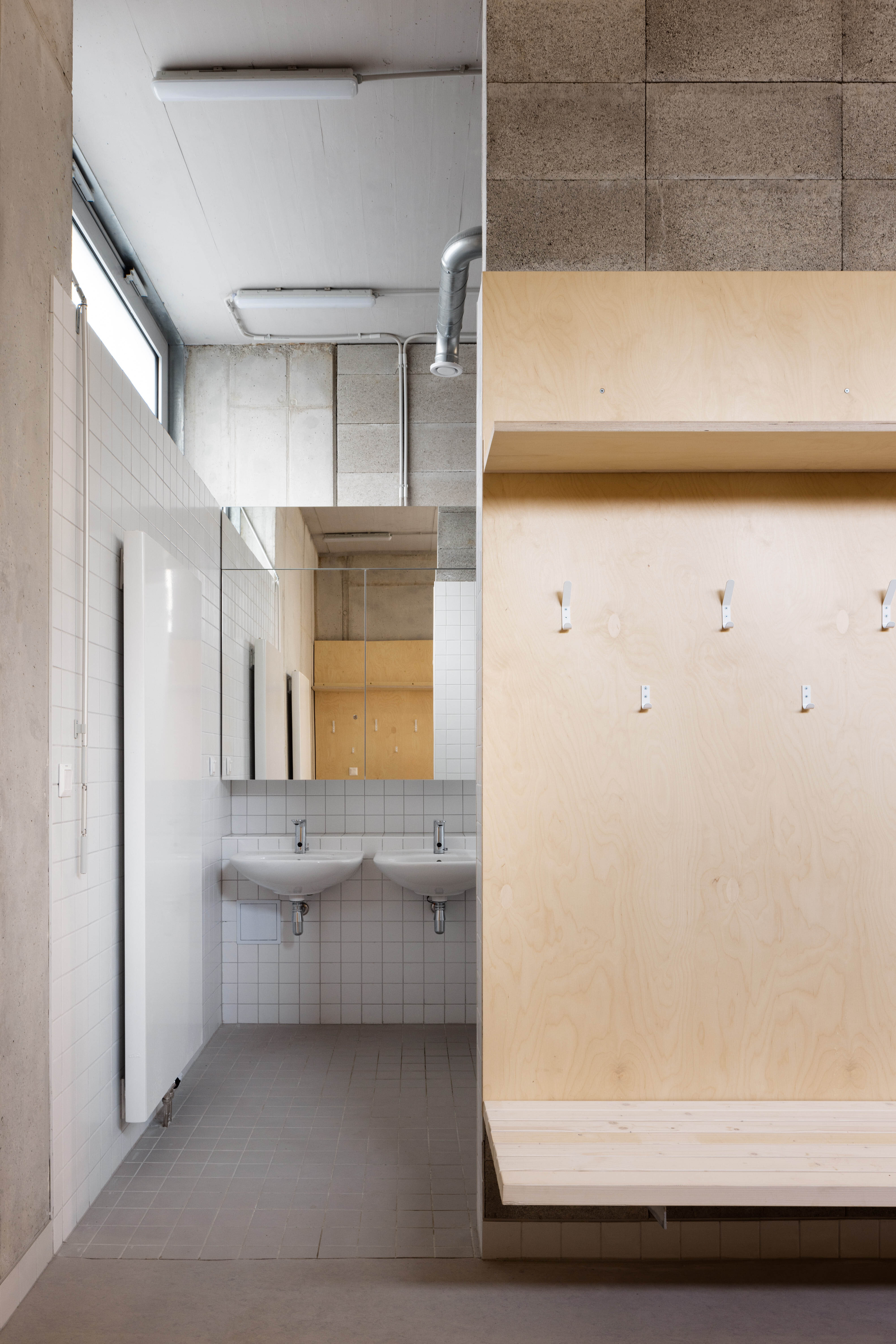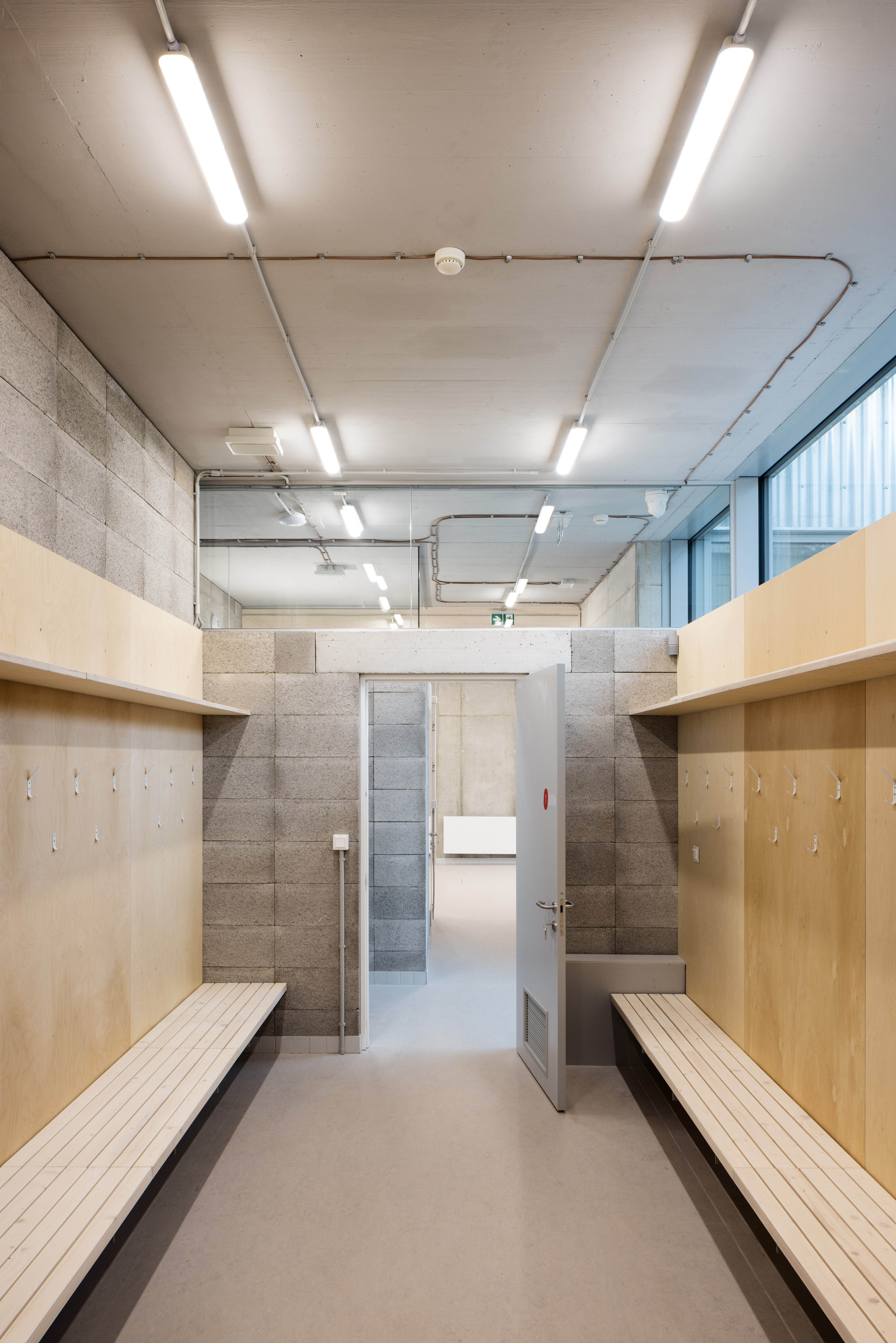 V interiéri sa uplatňuje estetika surových konštrukčných materiálov, doplnených o mäkké, akusticky pohltivé povrchy. Aj tu cíťiť dôraz na trvácnosť a funkčnú stránku architektúry.