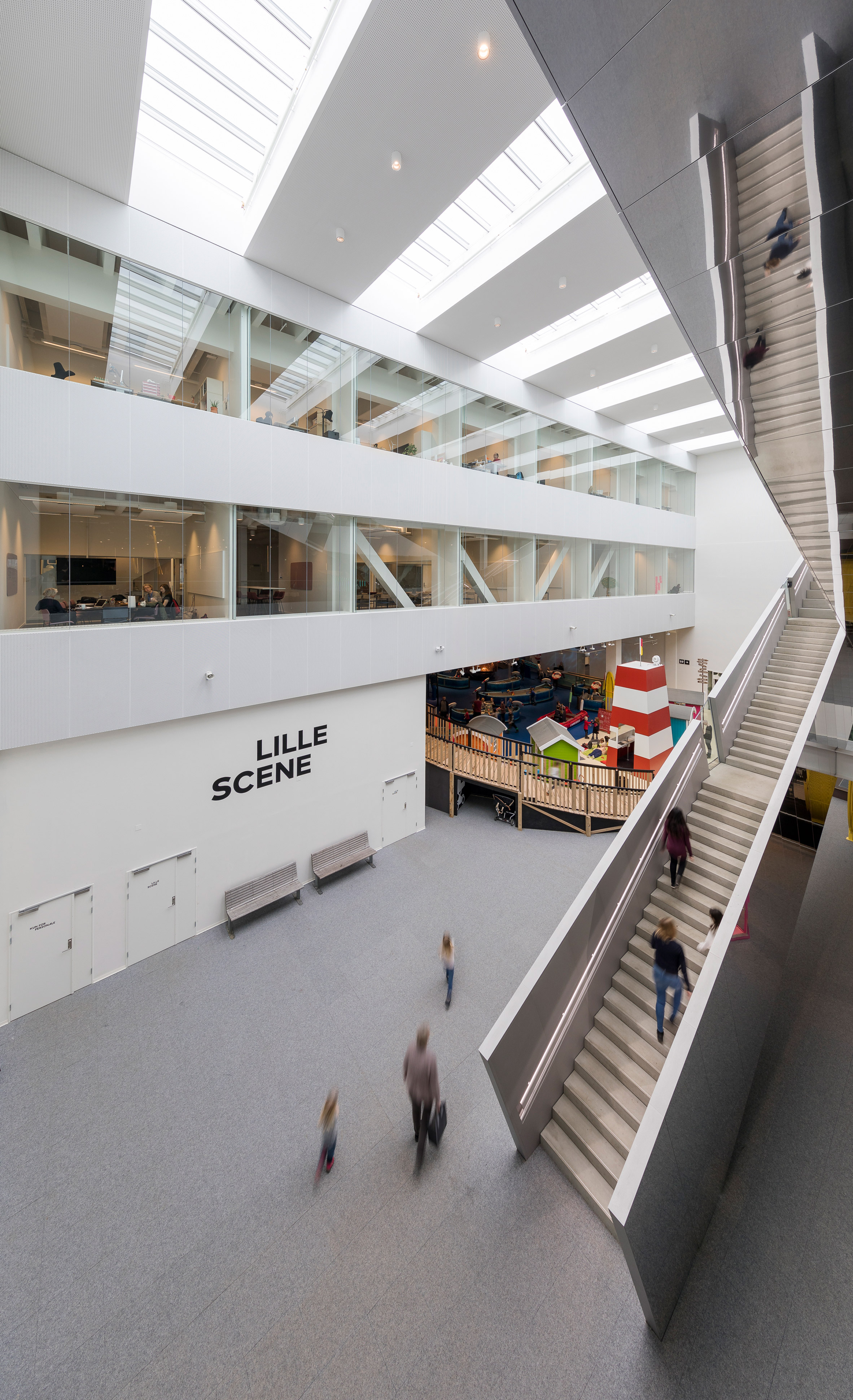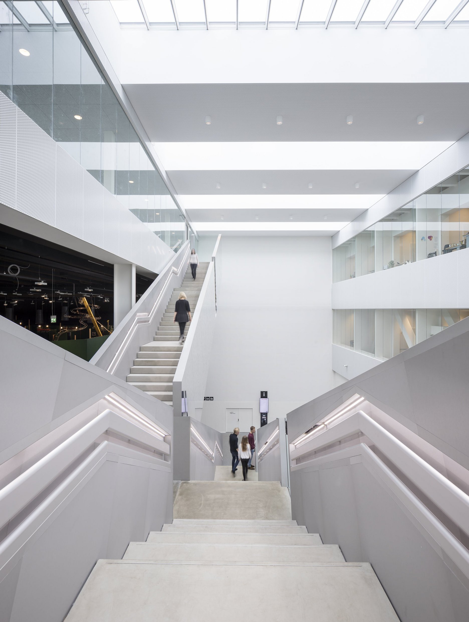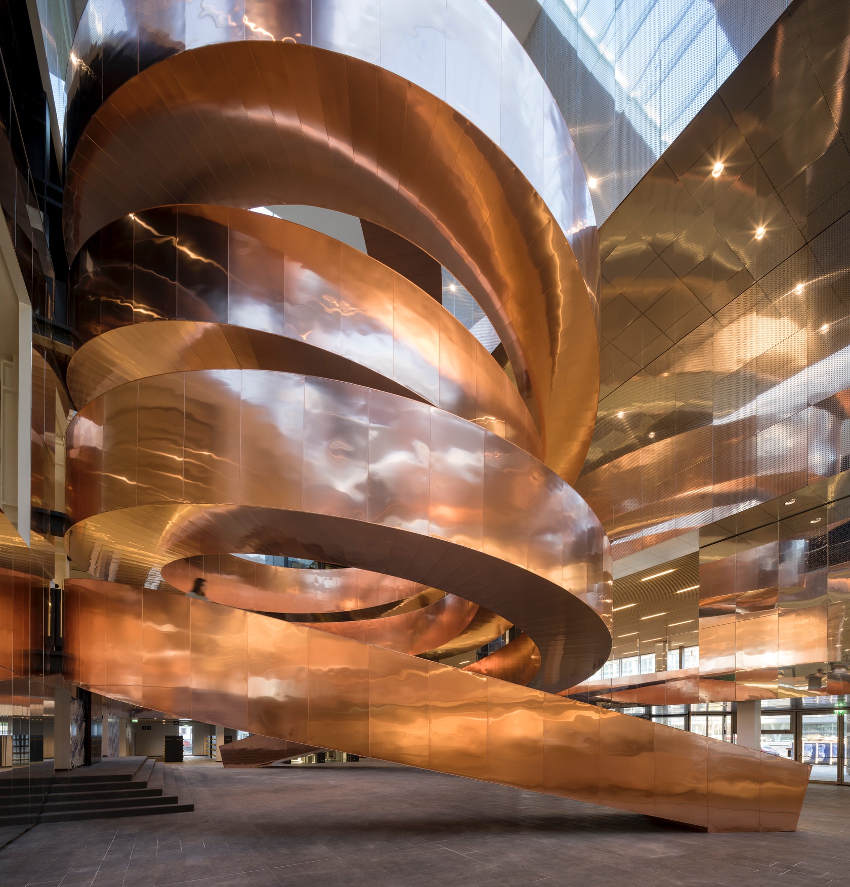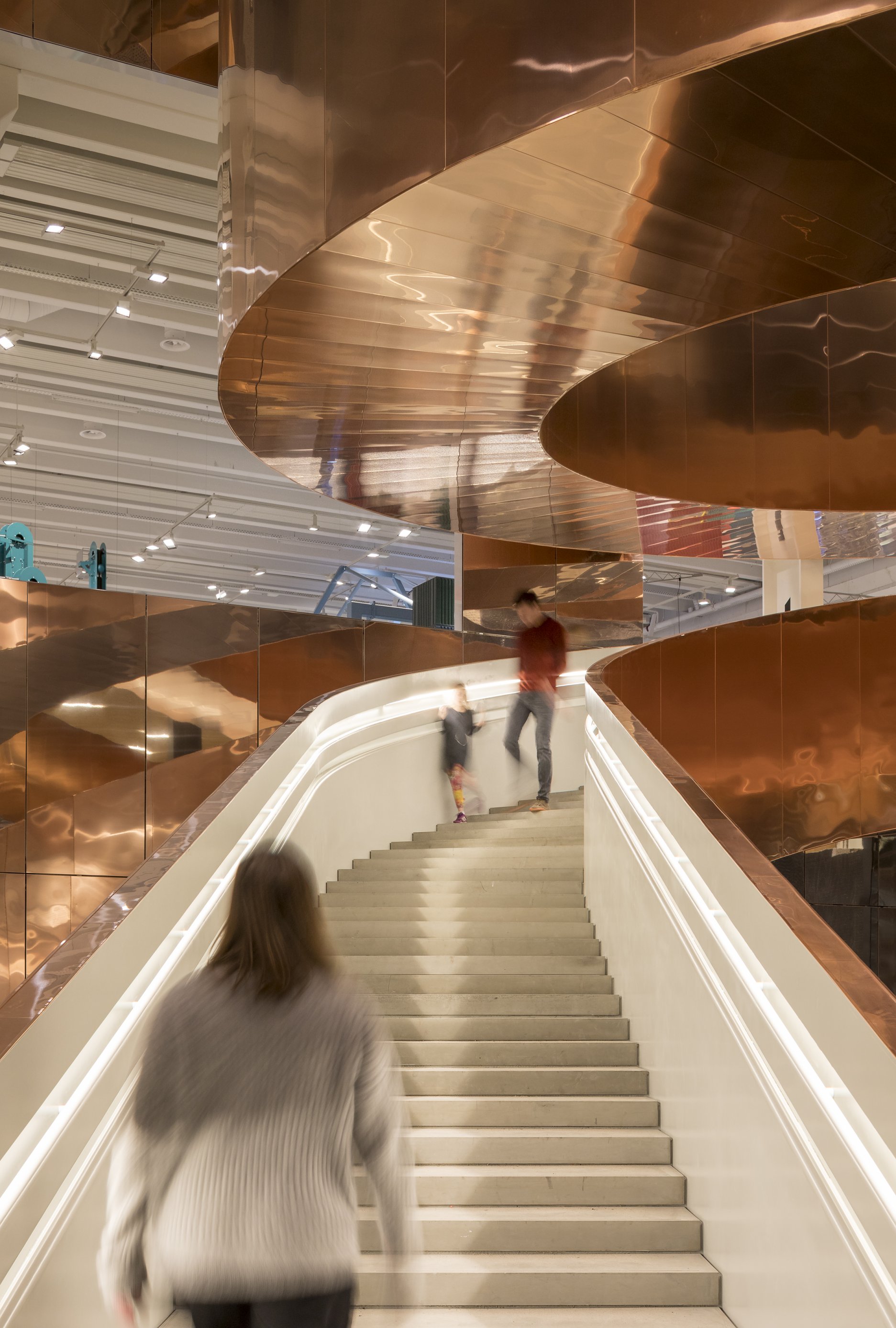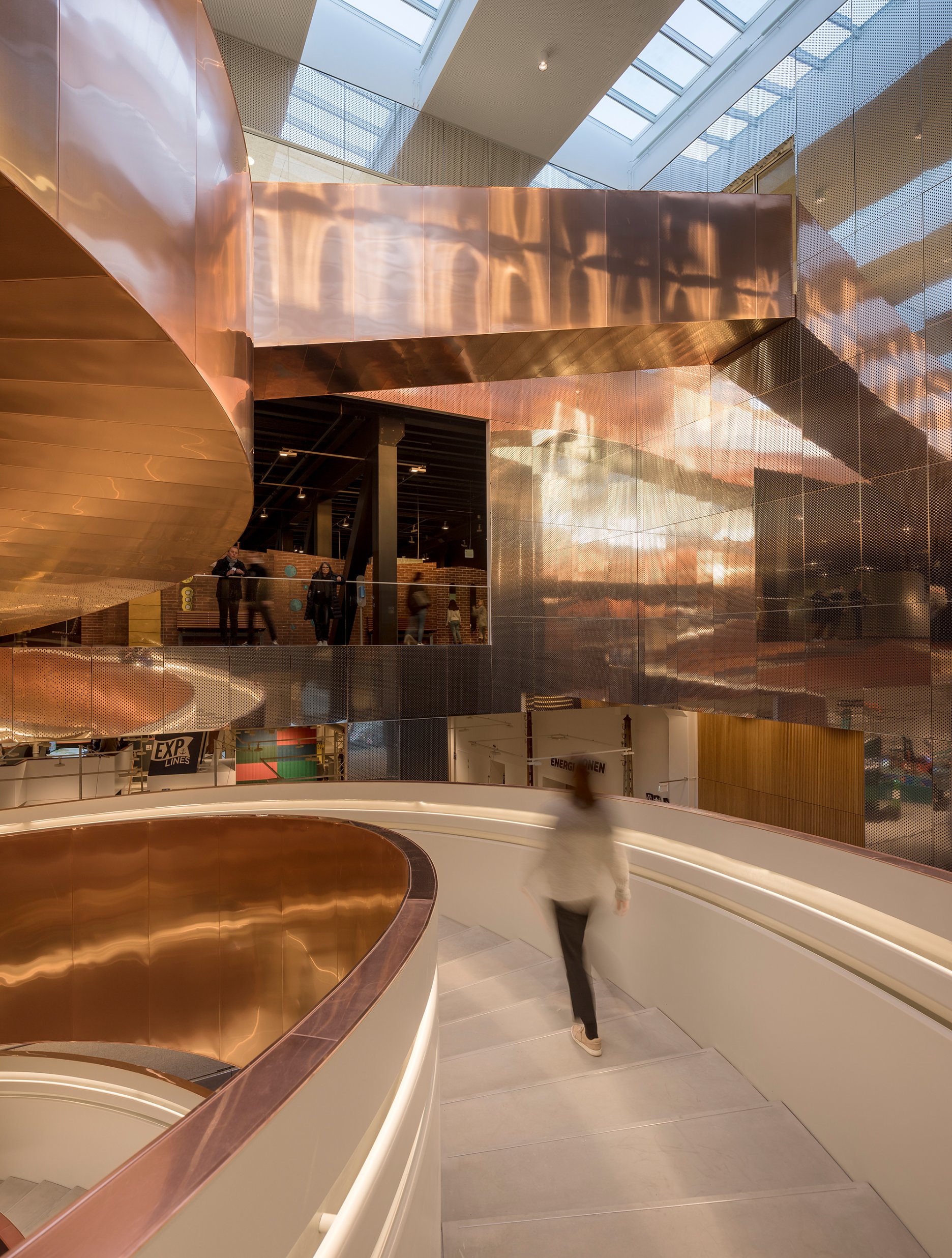 Ústredným motívom v interiéri, ktorý je viditeľný hneď pri vstupe do budovy je monumentálne špirálové schodisko, ktoré podľa slov architektov abstraktne stvárňujú dvojzávitnicu DNA. Tvarovanie schodiska umožnilo vytvoriť tuhý priestorový nosník, ktorý je zváraný z plochých oceľových segmentov a nepotrebuje dodatočné vertikálne opory. Konštrukcia je kotvená len na štyroch poschodiach, ktoré zároveň vertikálna komunikácia prepája. Oceľová kostra schodiska váži 160 ton. Vonkajší plášť a pohľadovú vrstvu tvorí efektný obklad z leštenej medi. Na opláštenie sto metrov dlhého schodiska bolo potrebných desať ton tohto materiálu. Vzdelávaciu funkciu budovy sa snažili architekti reflektovať aj na fasáde, kde perforácia znázorňuje prúdenie kvapalín. Je až neuveriteľné že, objekt s takýmto zameraním a rozsahom dokáže byť financovaný z verejných zdrojov.