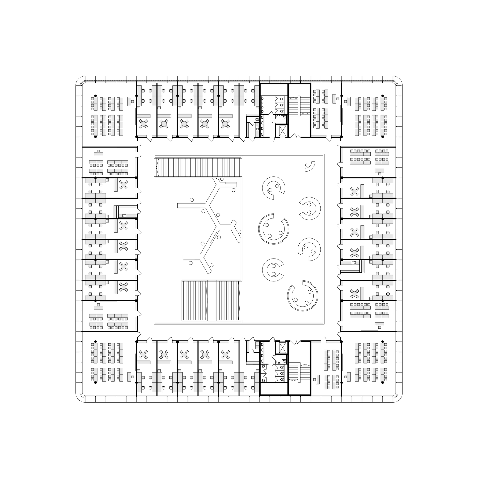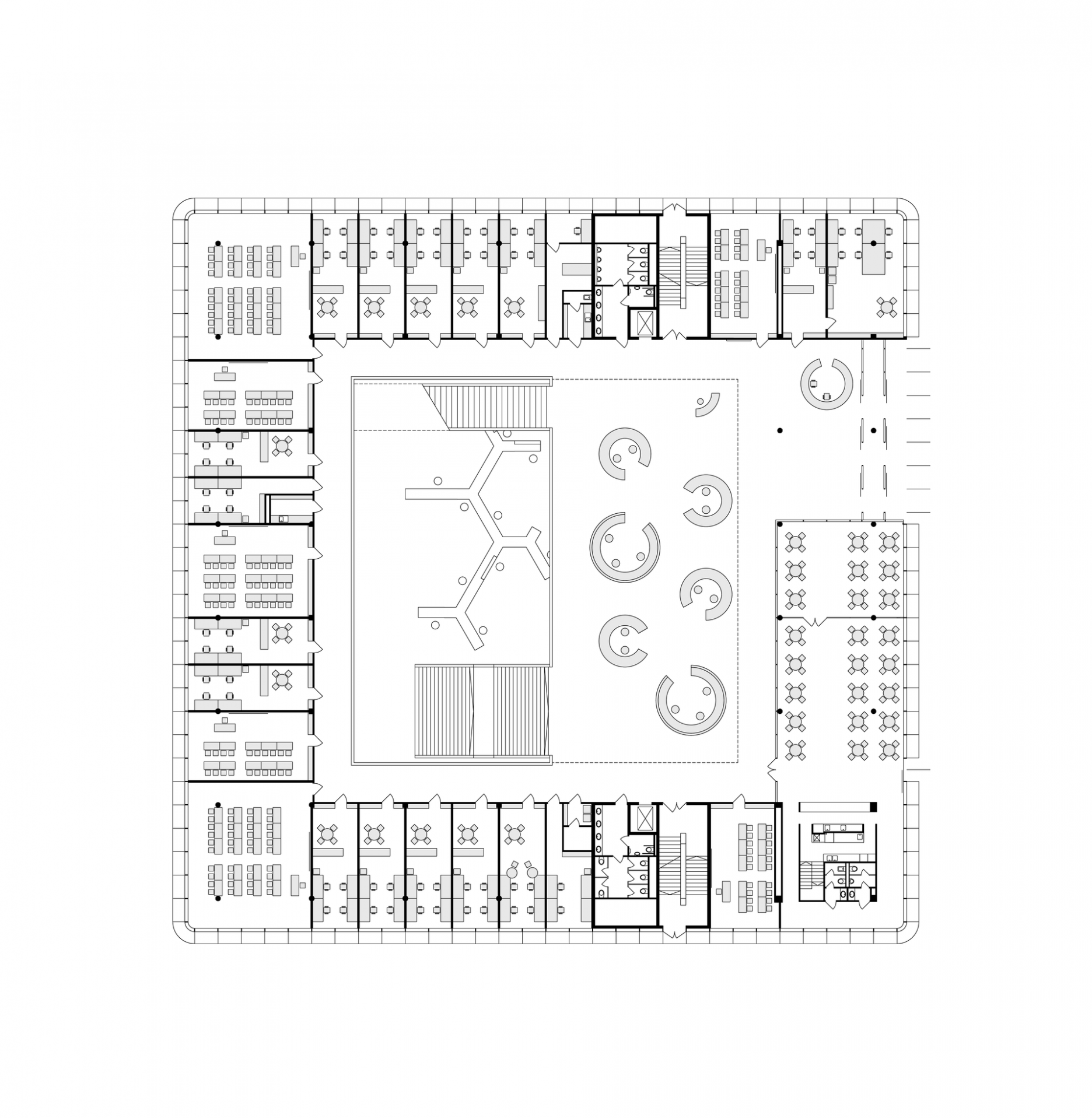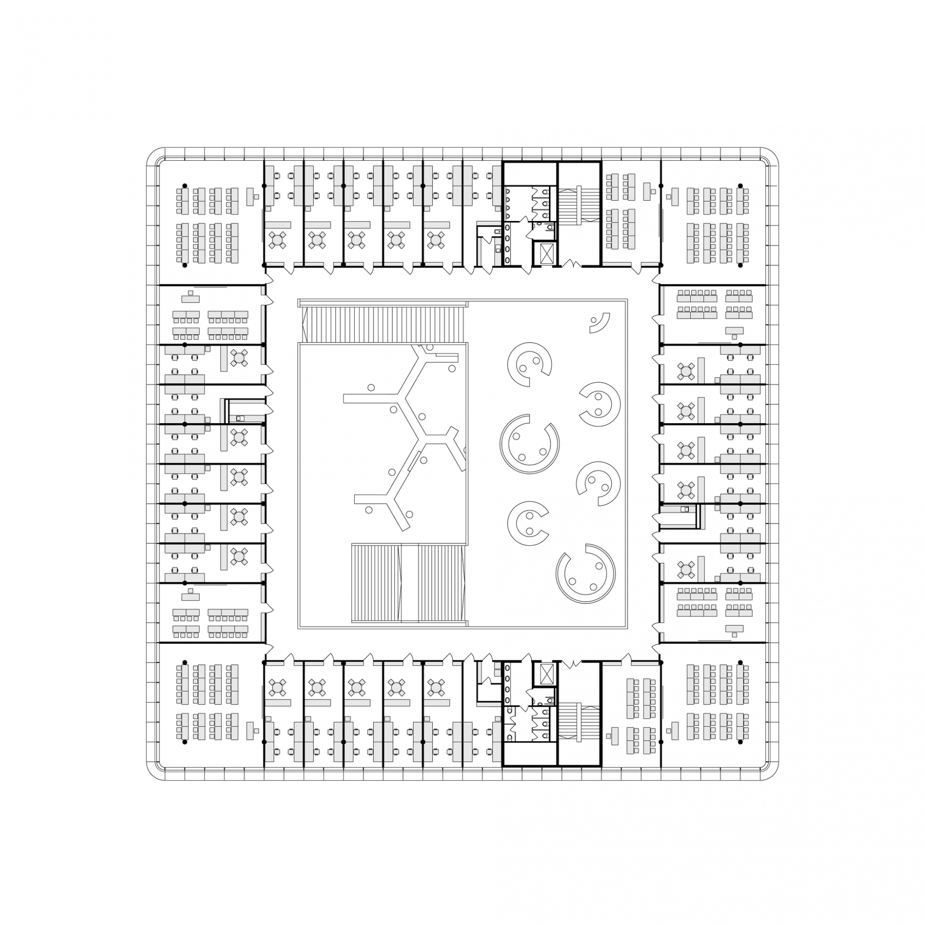 Takéto riešenie zabezpečilo kompaktné a účelné usporiadanie všetkých potrebných priestorov a funkcií. Naviac s maximálnym možným využitím prvkov pôvodnej konštrukcie. Oceľobetónové stropy zostali zachované v obvodovom prstenci. Priestory pre vnútornú dvoranu boli vyrezané. Subtílne oceľové stĺpy pôvodných zdvíhaných stĺpov dostali novú pohľadovú betónovú škrupinu, ktorá má okrem estetického aj protipožiarne určenie.