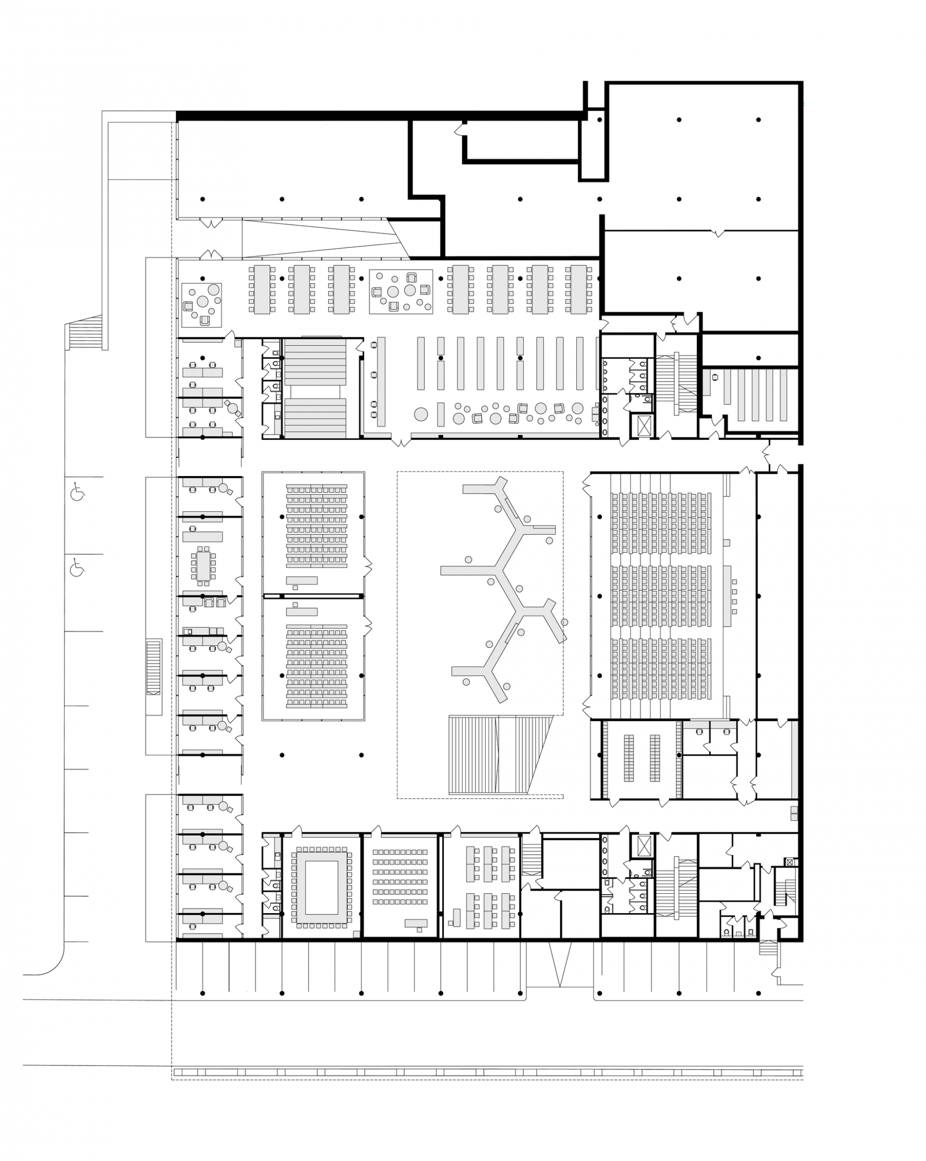 Pôvodná budova štvorcového pôdorysu mala zložité, dispozične hutné, technické zázemie umiestnené v strede objektu. Jedálne boli situované po obvode. Autori pre potreby novej funkcie urobili skoro reverzné riešenie. Masívne jadro vybrali, centrálnu časť budovy cez tri podlažia uvoľnili ako vnútorný spoločenský a komunikačný priestor. Umožnili jeho prirodzené vrchné presvetlenie aj so zamedzením nadmernej insolácie vtipným návrhom rastra vysokých nosníkov pod skleneným stropom. Po obvode umiestnili učebne a ostatné potrebné priestory pre vzdelávací proces i prevádzku fakulty, s možnosťou priameho optického kontaktu na okolie.