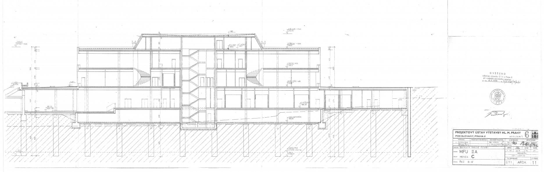 Původní objekty menzy a kolejí architekta Karla Pragera zůstaly jen torzem nedokončeného areálu univerzitního kampusu na břehu Vltavy. Samotná menza nebyla nikdy plně využita k zamýšlenému účelu. Stavba z 80. let minulého století s náročnou konstrukcí zvedaných stropů a hlubokou centrální čtvercovou dispozicí měla nespornou architektonickou kvalitu odpovídající době svého vzniku. Pro nové využití Fakultou humanitních studií však byla nutná radikální proměna.
