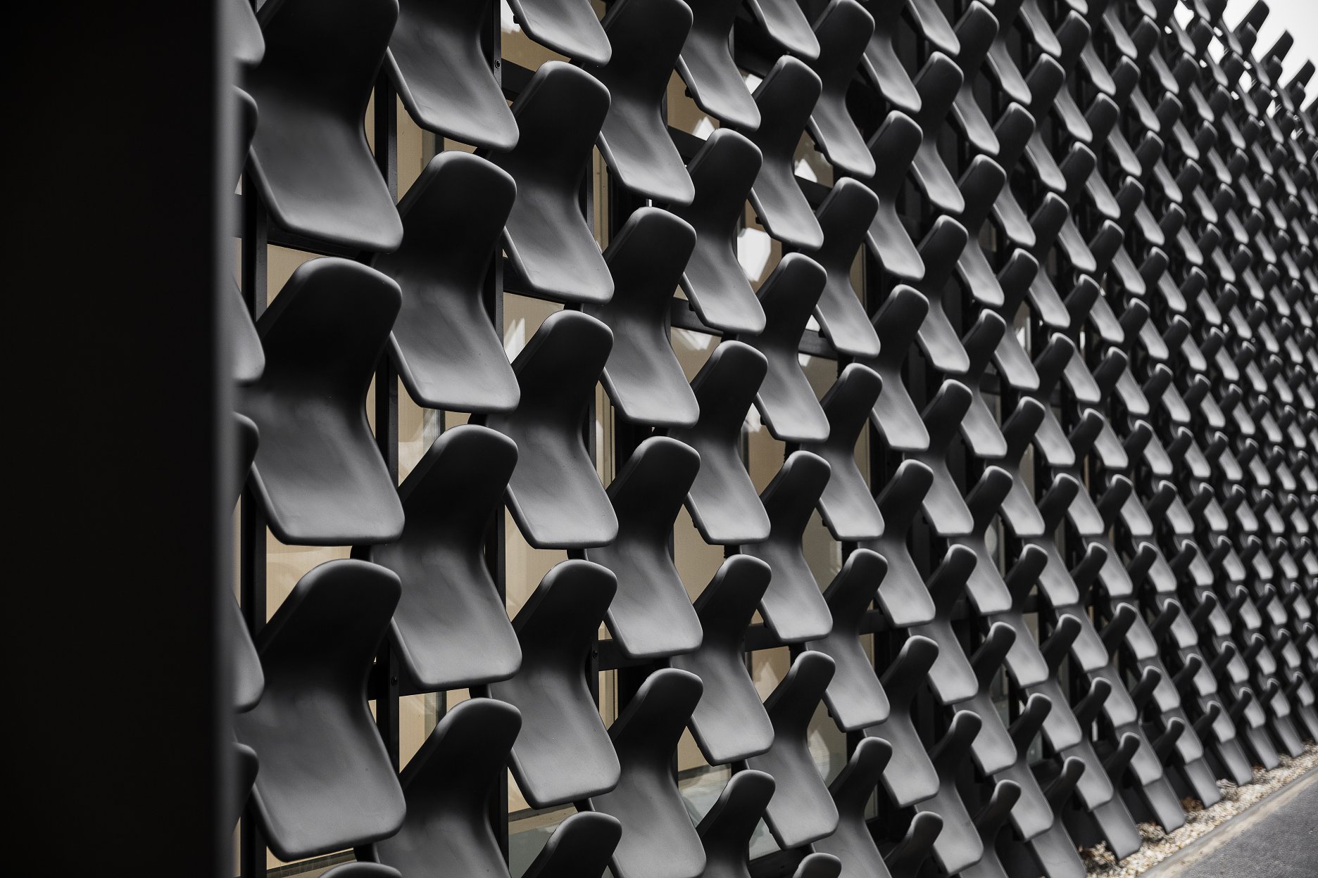 Investor patrí medzi popredných českých dodávateľov kancelárskeho, školského a kovového nábytku. Voľba materiálu, ktorý s vynaložením minimálnych finančných prostriedkov a s maximálnym efektom zhodnotí pôvodný objekt, preto logicky smerovala do výroby. Bez väčších zásahov do exteriéru je stavba obložená jednotným produktom - plastovým sedadlom v čiernej farbe v cene zhruba 80 Kč/kus. Tým vzniká abstraktné textúra, ktorá bez ďalších reklamných prvkov jasne vypovedá o tom, čo sa deje vo vnútri. „Jedná se o základní formu interiérové židle, kterou investor standardně dovává, s tím rozdílem, že jako materiál byl použit černý granulát pro venkovní použití – je tedy odolný proti vlivům počasí, zejména UV záření.“ popisujú architekti. Jednotlivé sedáky sú upevnené na konštrukciu z oceľových profilov ukotvených na fasádu. V prípade mechanického poškodenia je možné konkrétny kus ľahko vymeniť za nový, tiež čistenie fasády je možné vykonávať jednoducho - raz až dvakrát do roka wapkou.