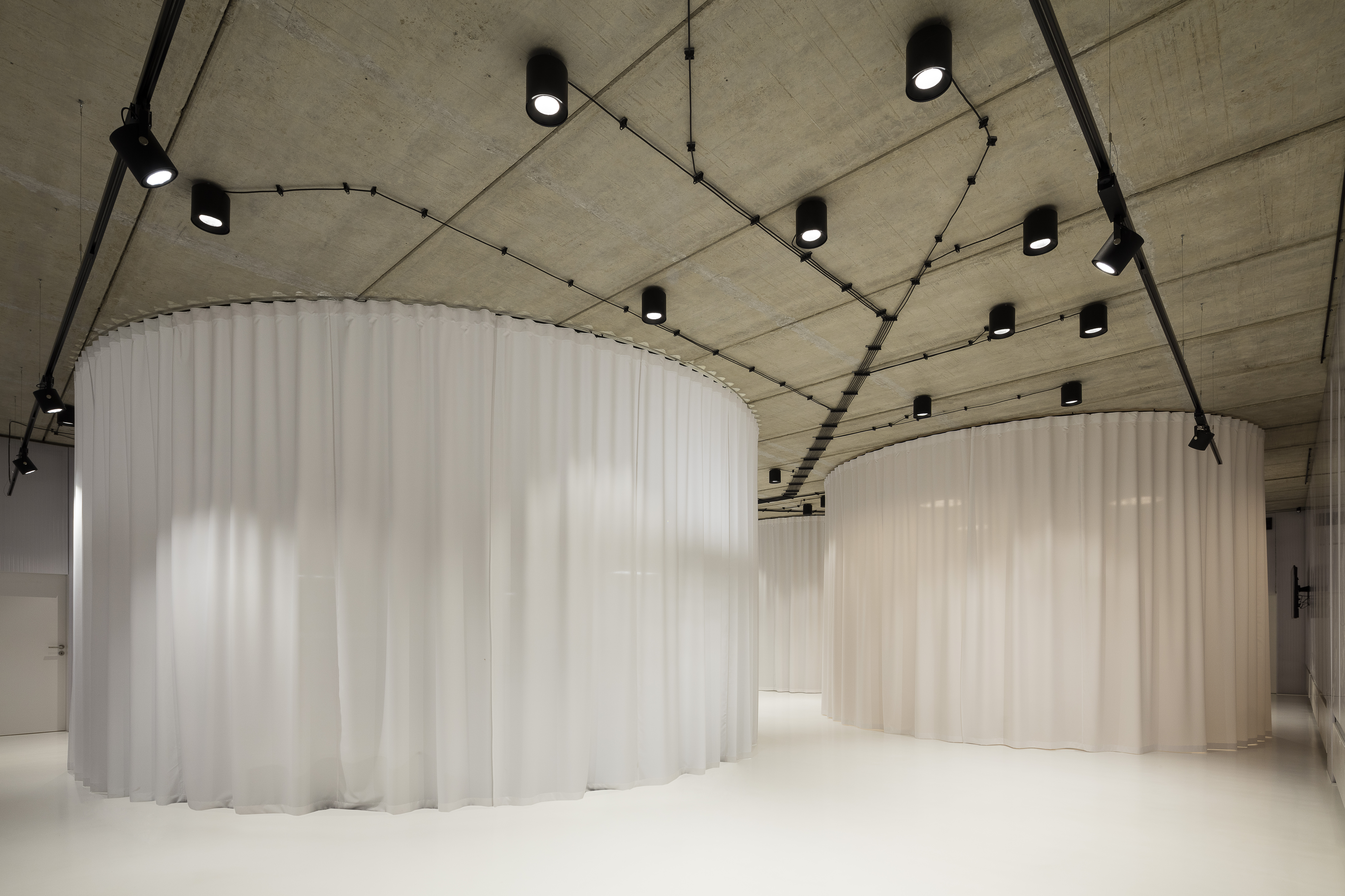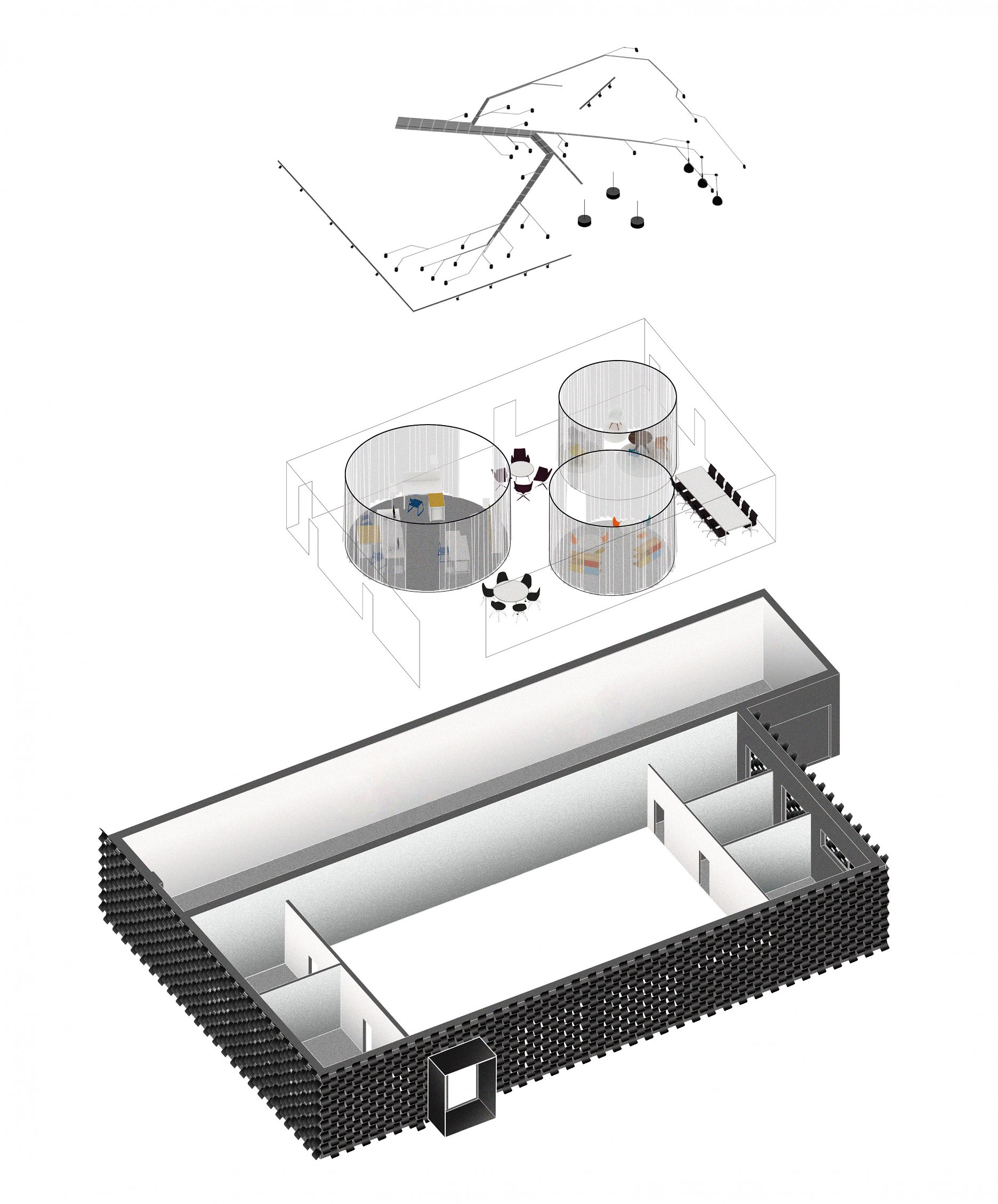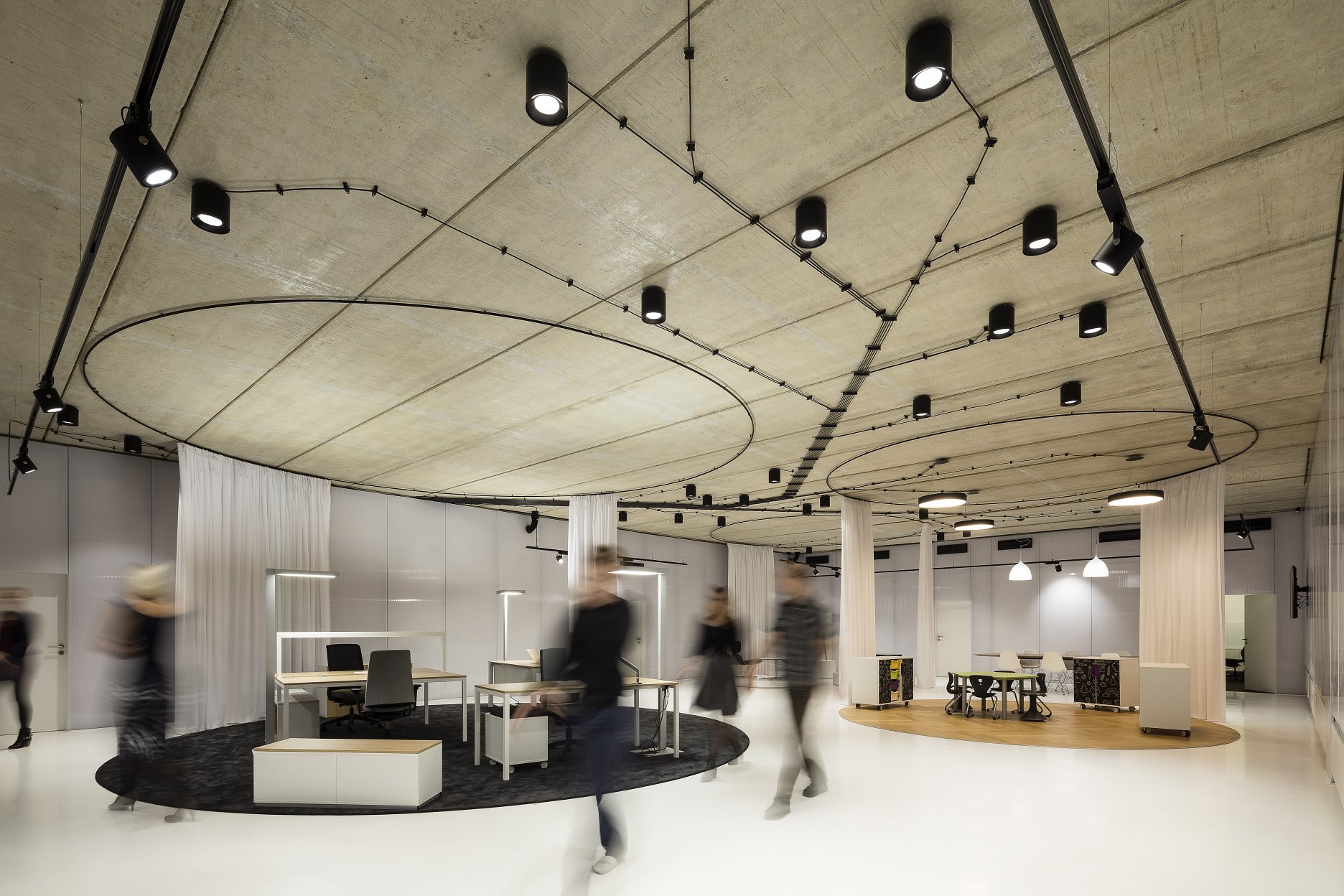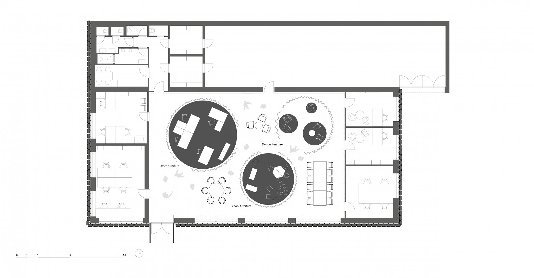 Druhou rovinou návrhu je interiér, ktorý pozostáva z dvoch častí: showroomu a kancelárií so zázemím pre zamestnancov. Vnútro stavby bolo kompletne očistené, prezentačný priestor showroomu, ktorý vznikol zväčšením pôvodnej vstupnej haly v centre dispozície, je vymedzený polykarbonátovými priečkami, podlaha je zjednotená bielou stierkou, na strope je ponechaný pohľadový betón a všetky nové inštalácie sú vedené po povrchu. Do takto abstrahovaného priestoru sú vložené tri kruhové galérie reprezentujúce tri odlišné segmenty výroby - školský nábytok, kancelársky nábytok a dizajnové výrobky. Kruhové výrezy sú vymedzené bielymi textilnými závesmi na celú výšku priestoru, ktoré je možné podľa potreby uzavrieť. Interiéry kruhových výrezov predstavujú tri odlišné prostredia, kde je materiál podlahy a spôsob osvetlenia zvolený tak, aby zodpovedal prostrediu, pre ktoré je nábytok určený. Medzipriestory je možné vypĺňať rôznymi solitérmi, možno ich využívať ako konferenčné miestnosti. Celý priestor funguje na princípe galérie, ktorú je možné jednoduchým spôsobom prispôsobovať aktuálnym potrebám. Kancelárie pre zamestnancov sú situované po obvode stavby.