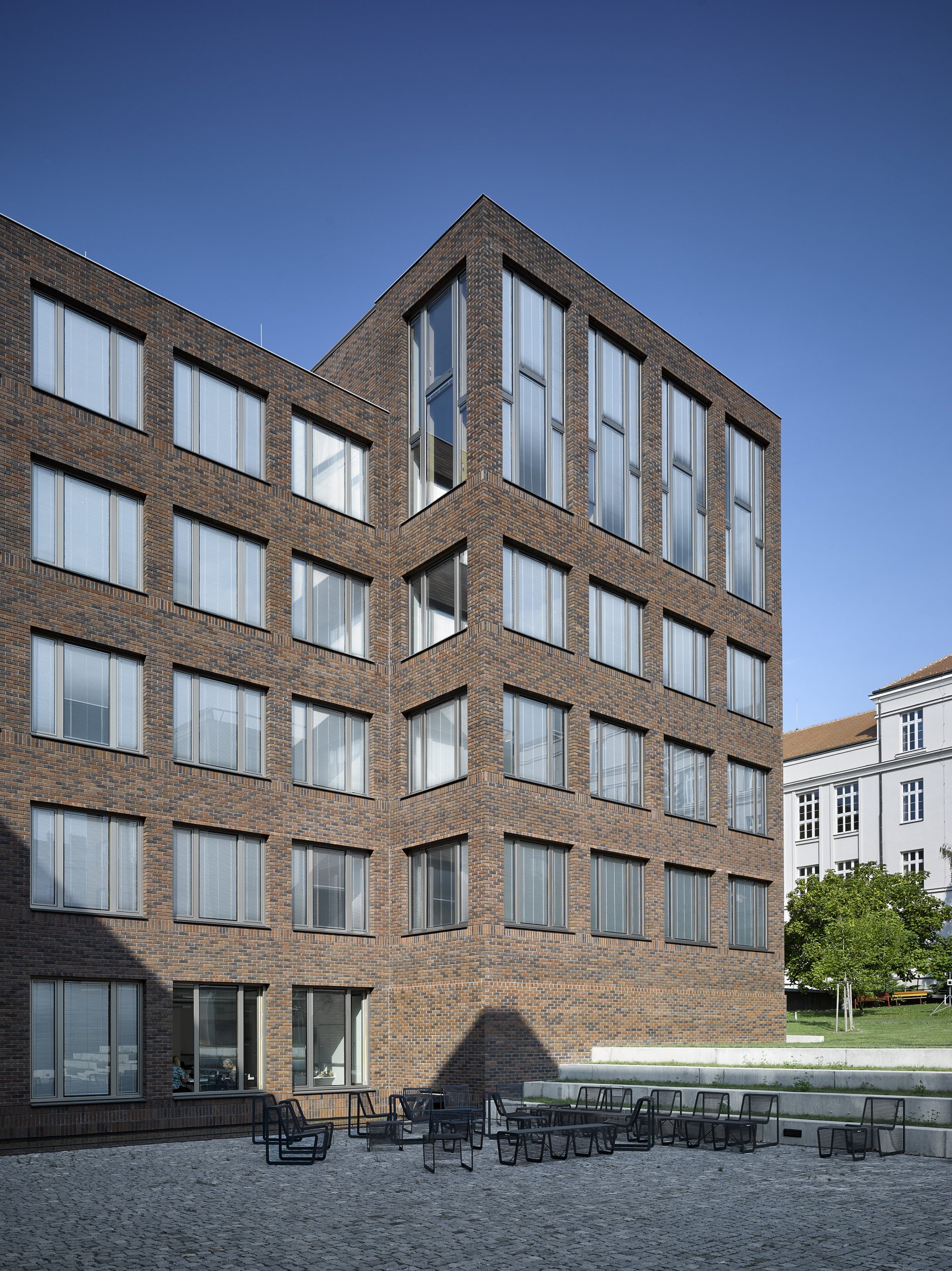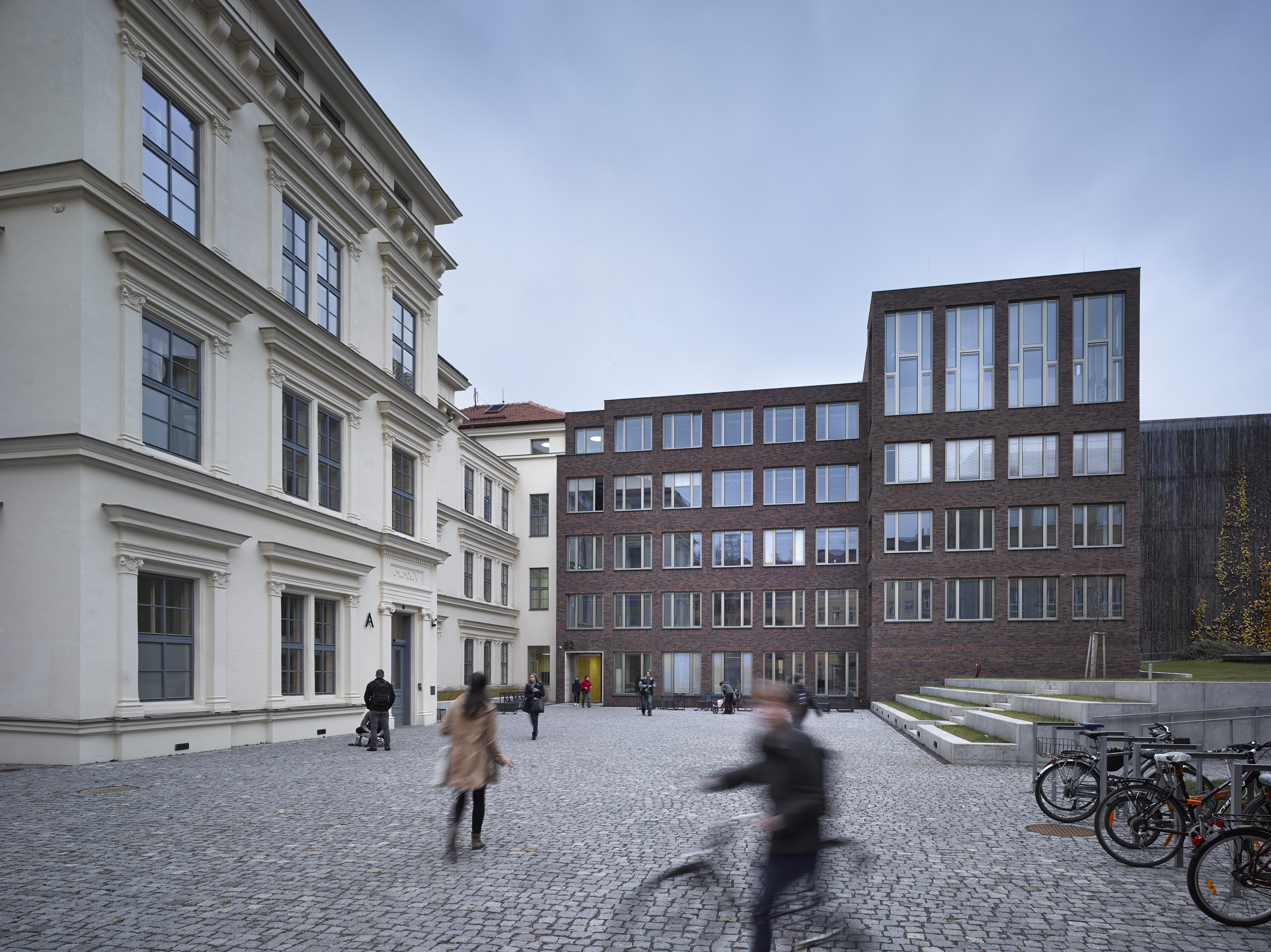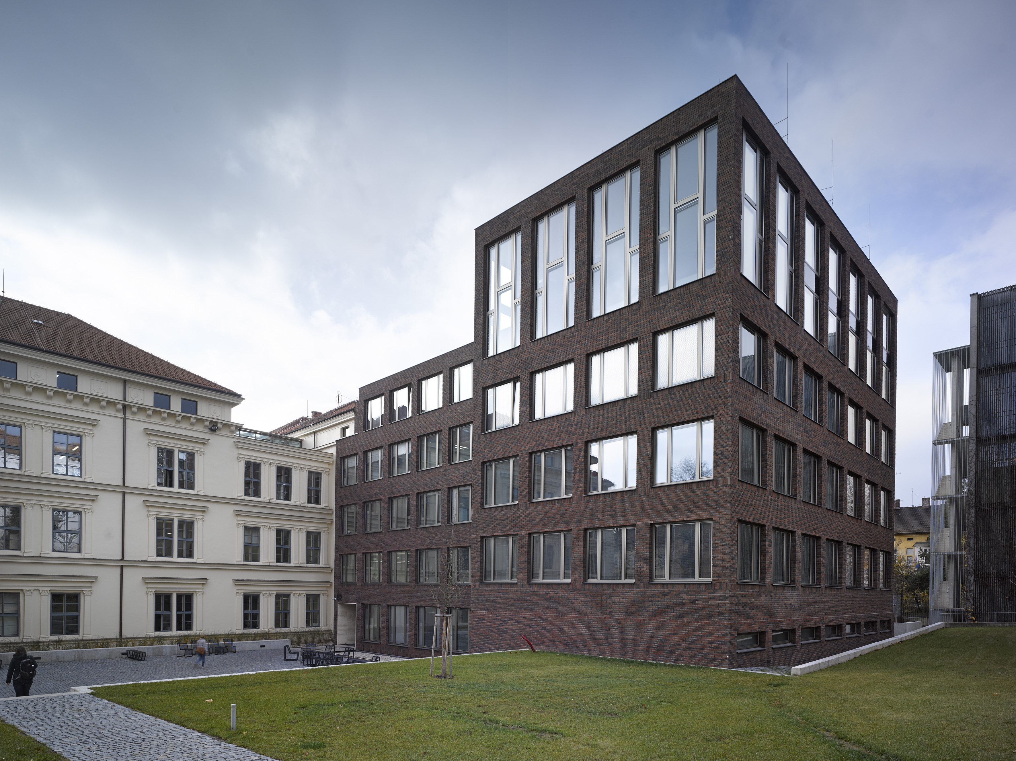Fakulta bola pri svojom vzniku umiestnená do budovy sirotinca. Ten bol ďaľej dostavovaný, až blok domov obostaval pôvodnú záhradu. Projekt ateliéru Pelčák a partner sa snaží do nesúrodej štruktúry vniesť poriadok, tak aby vznikol fungujúci celok. Novostavba a prestavaná budova, ktorá tvorí čelo súboru majú analogicky navrhnuté tehlové fasády s jednotným členením, organizujú areál fakulty a prinášajú spoločný motív. Prehľadnosť skladby areálu podporujú omietané historické fasády oboch budov.