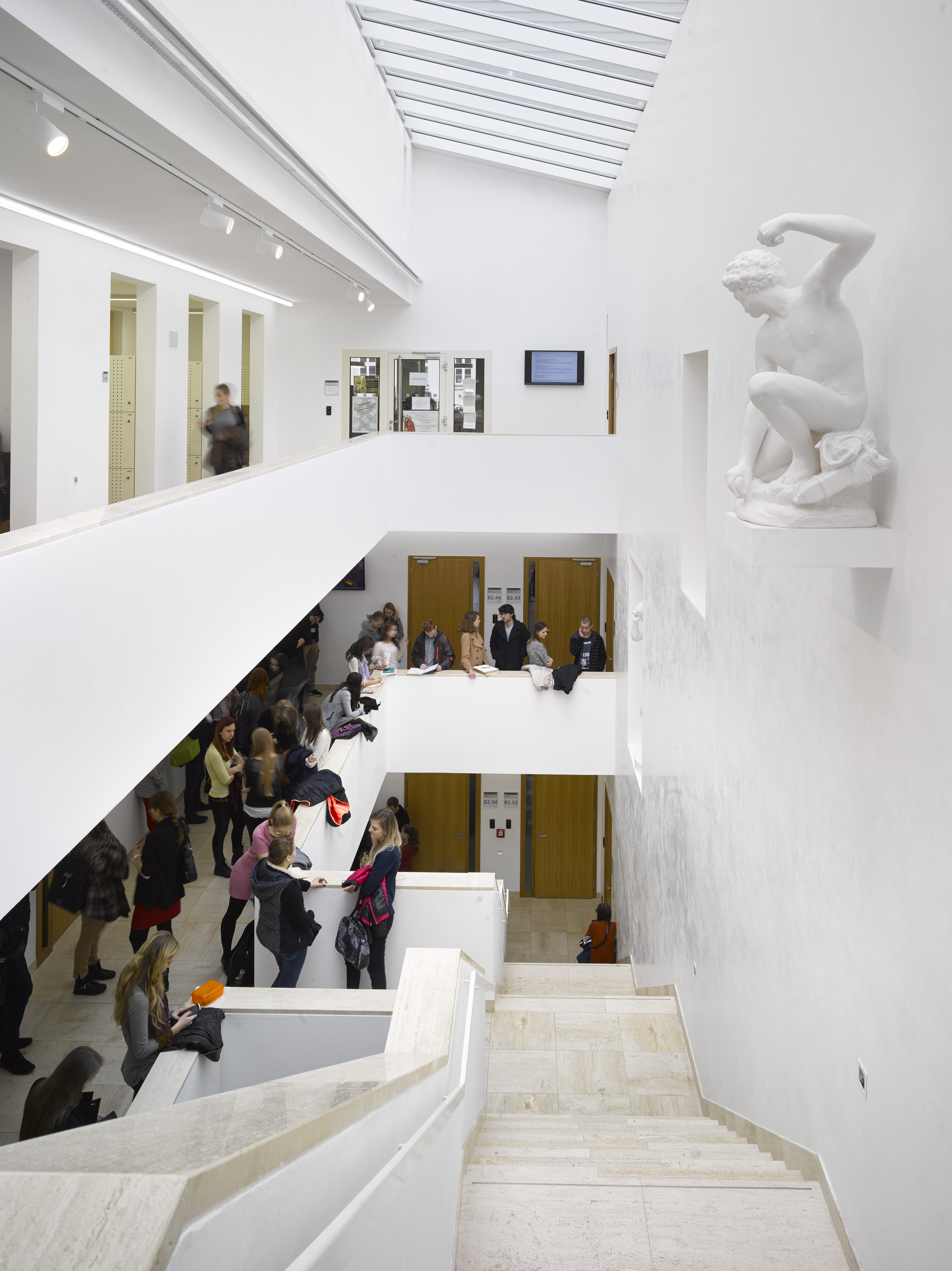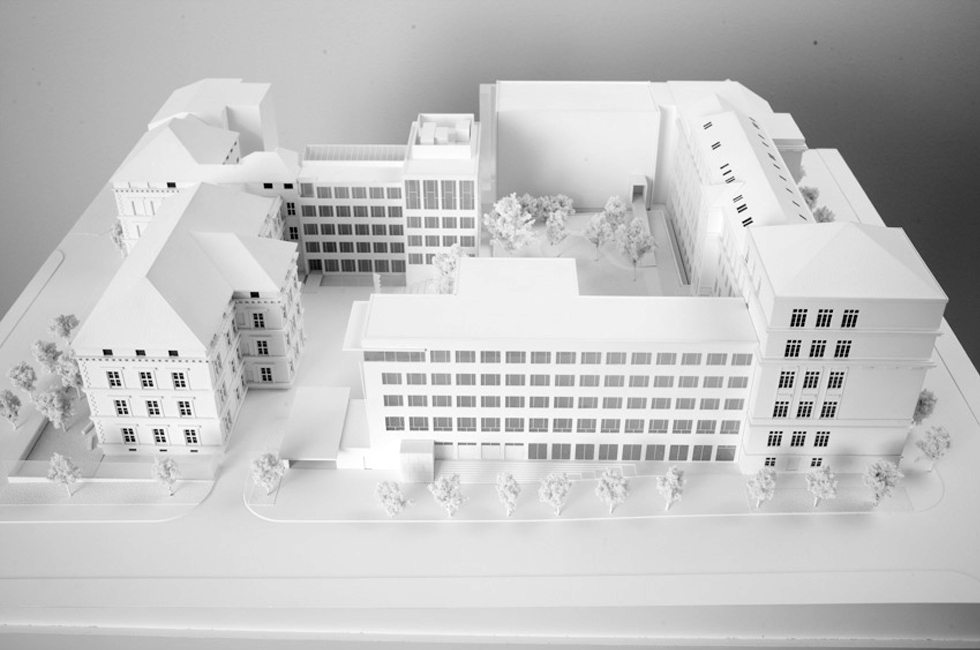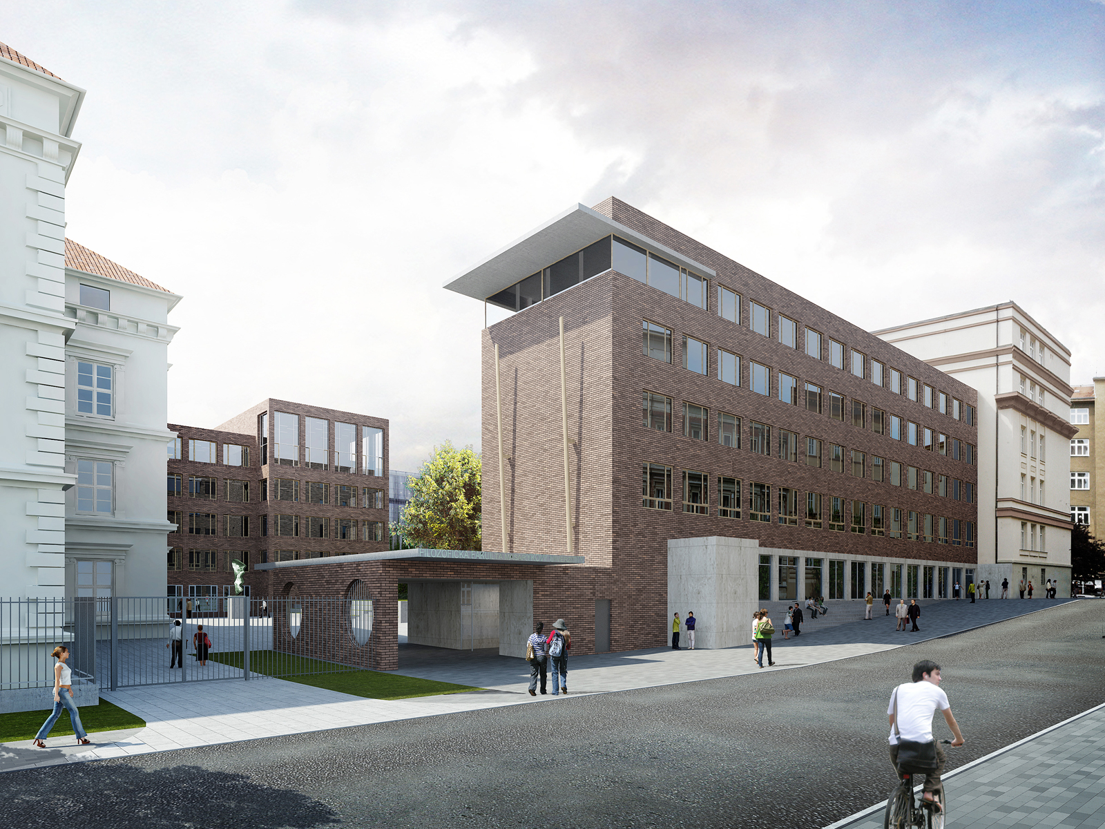 Fakulta bola pri svojom vzniku umiestnená do budovy sirotinca. Ten bol ďaľej dostavovaný, až blok domov obostaval pôvodnú záhradu. Projekt ateliéru Pelčák a partner sa snaží do nesúrodej štruktúry vniesť poriadok, tak aby vznikol fungujúci celok. Novostavba a prestavaná budova, ktorá tvorí čelo súboru majú analogicky navrhnuté tehlové fasády s jednotným členením, organizujú areál fakulty a prinášajú spoločný motív. Prehľadnosť skladby areálu podporujú omietané historické fasády oboch budov.