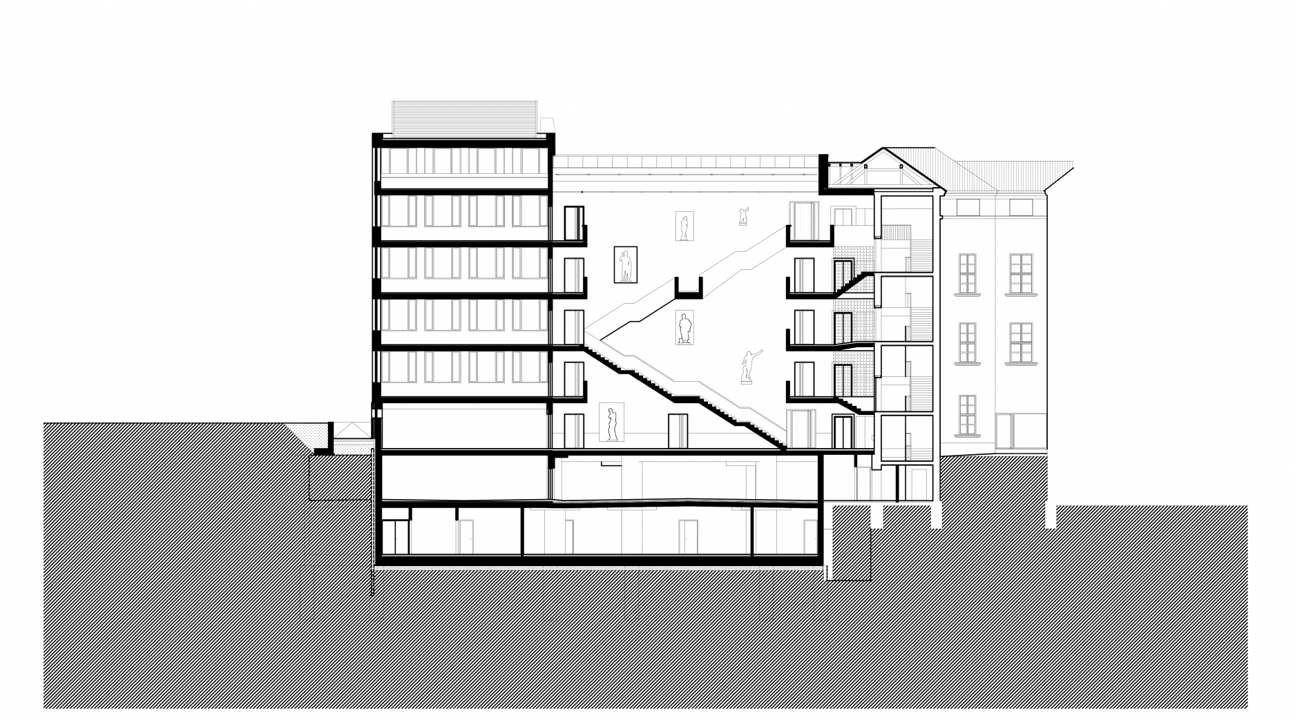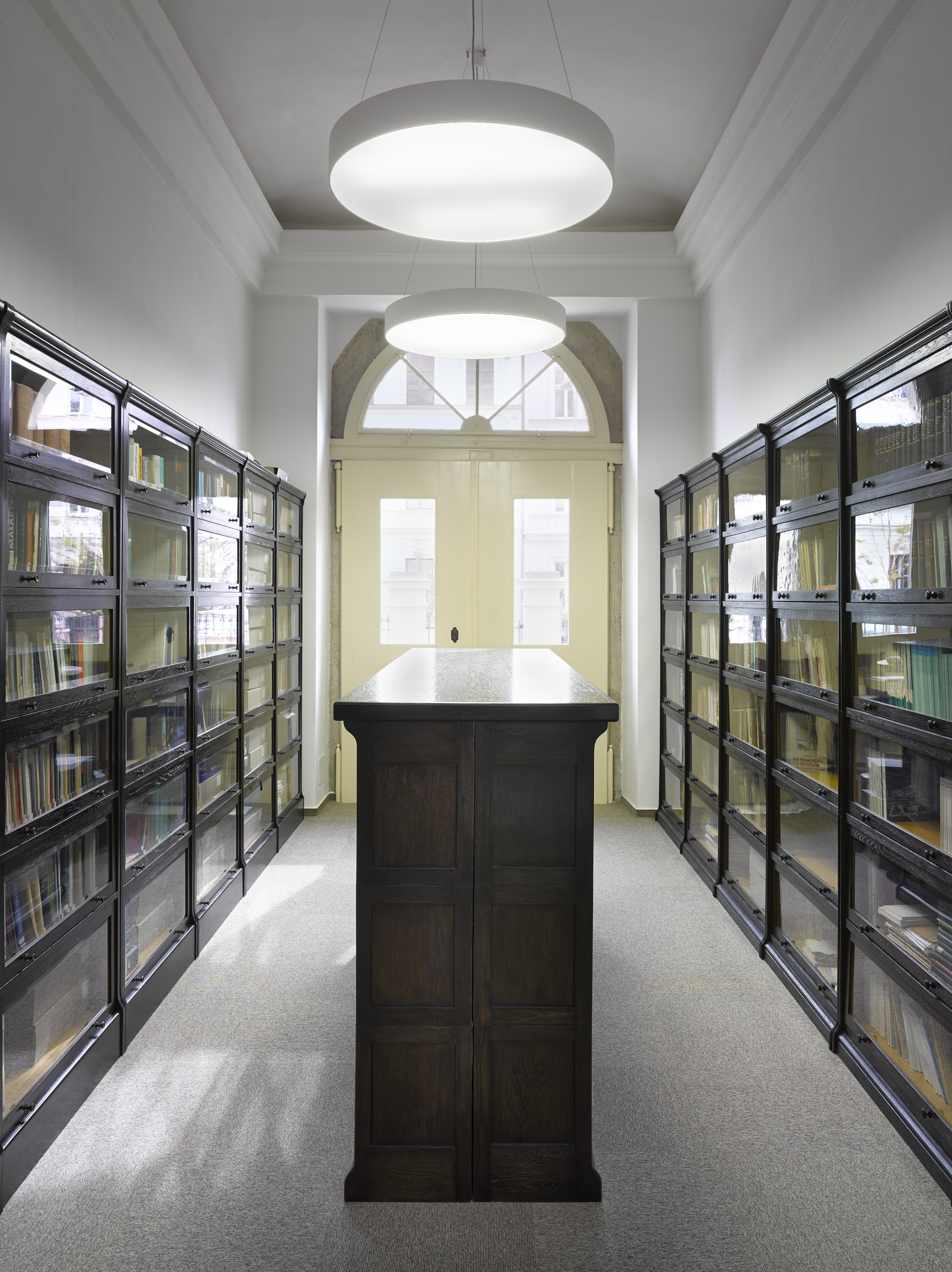 Novostavba stojí na mieste provizórnej budovy z roku 1922, ktorá bola asanovaná. Tažiskom nového objektu je cez všetky podlažia otvorená komunikačná hala. Priestor s priamym schodiskom v dvoch nožnicovo usporiadaných ramenách je presvetlený skleneným stropom. Okolo centrálnej haly sú pozdĺž východnej a severnej fasády situované učebne. K západnej fasáde sú orientované pracovne doktorandov a výskumných pracovníkov. Na prízemí je auditórium. Na zvýšenom poslednom podlaží sídli knižnica historického ústavu s vysokým otvoreným priestorom čitárne. O tepelnú pohodu v budove sa stará technológia aktivácie betónového jadra. Na exponovanej západnej fasáde boli tiež výrazne zredukované presklené plochy.