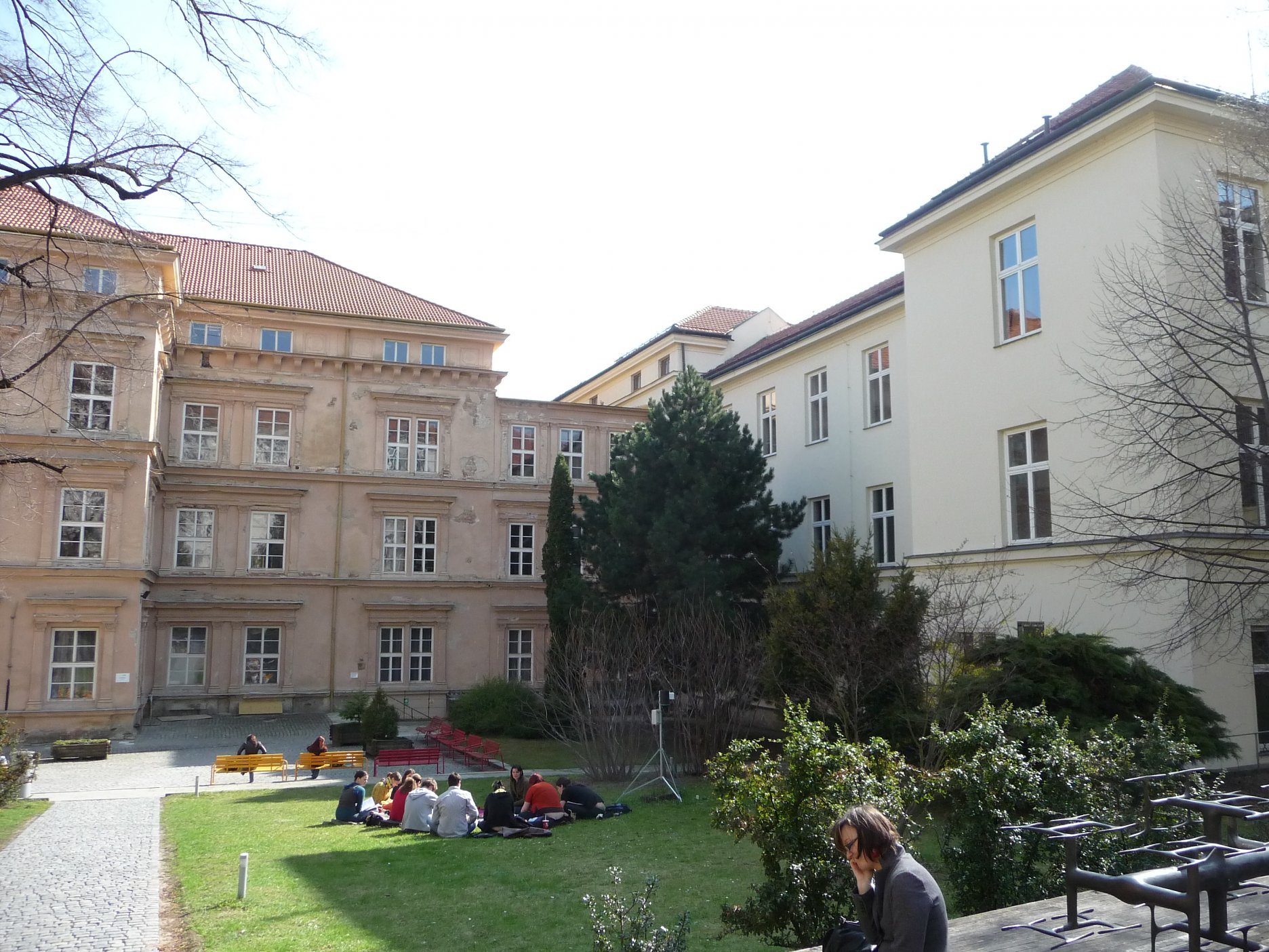 Z utilitárneho dvora sa stalo univerzitné nádvorie. Z prevádzkových dôvodov je aj naďalej rozdelené na dláždenú časť - piazettu, do ktorej je orientovaný nový hlavný vstup a na park. Ich rozhranie je artikulované terénnymi stupňami. Vzniká tak prírodný amfiteáter, ktorý môže byť využitý na výučbu pod holým nebom (cez prázdniny na fakulte prebieha letná škola slovanských jazykov), či ako skutočné hľadisko smerujúce na vydláždenú plochu. Tá je na západnej strane ukončená vodnou plochou. Zvuk tečúcej vody odrážaný fasádami obohacuje atmosféru priestoru. “Na charakter a užitnost venkovních ploch jsme kladli velký důraz. Nádvoří se stává středem kampusu také proto, že do něj směruje nově navržený vstup do areálu. Ten již tedy není veden skrze jednu z řady budov, nýbrž do prostoru mezi nimi, do jejich těžiště, ze kterého se vstupuje do každé ze staveb,” približujú riešenie Petr Pelčák.