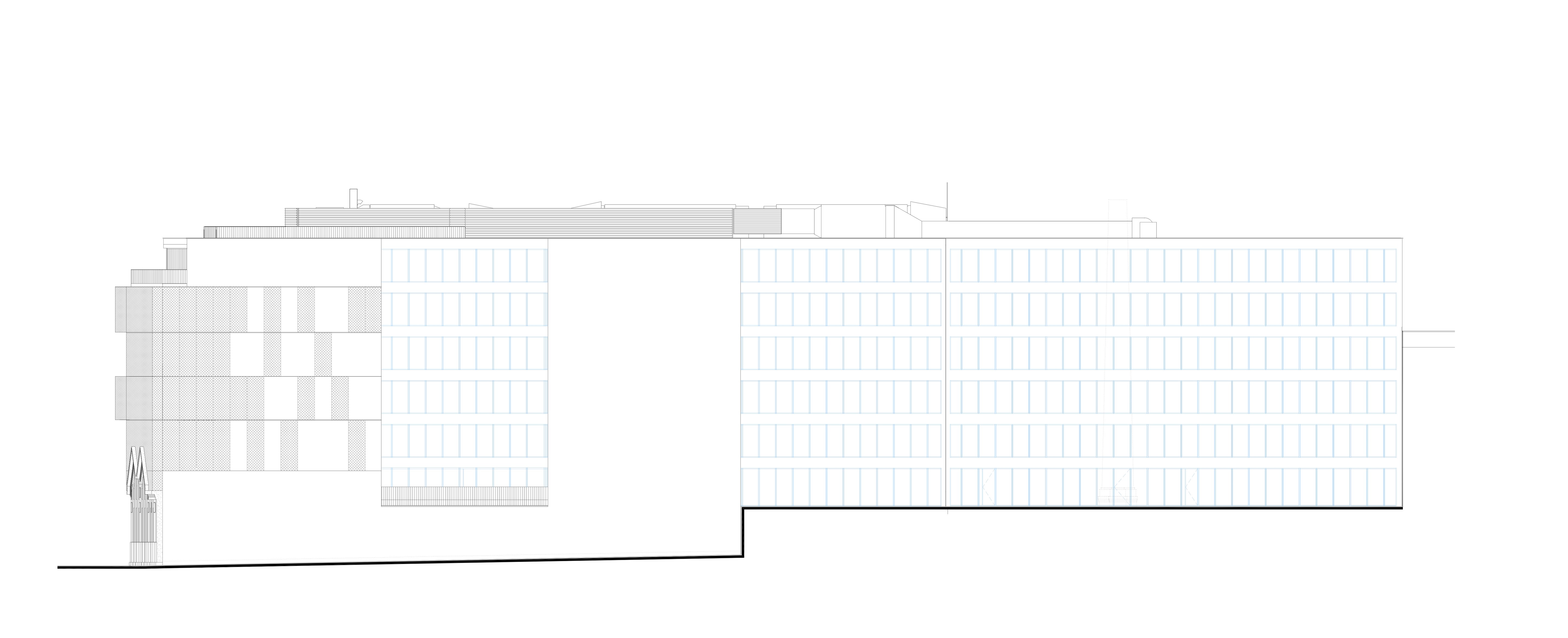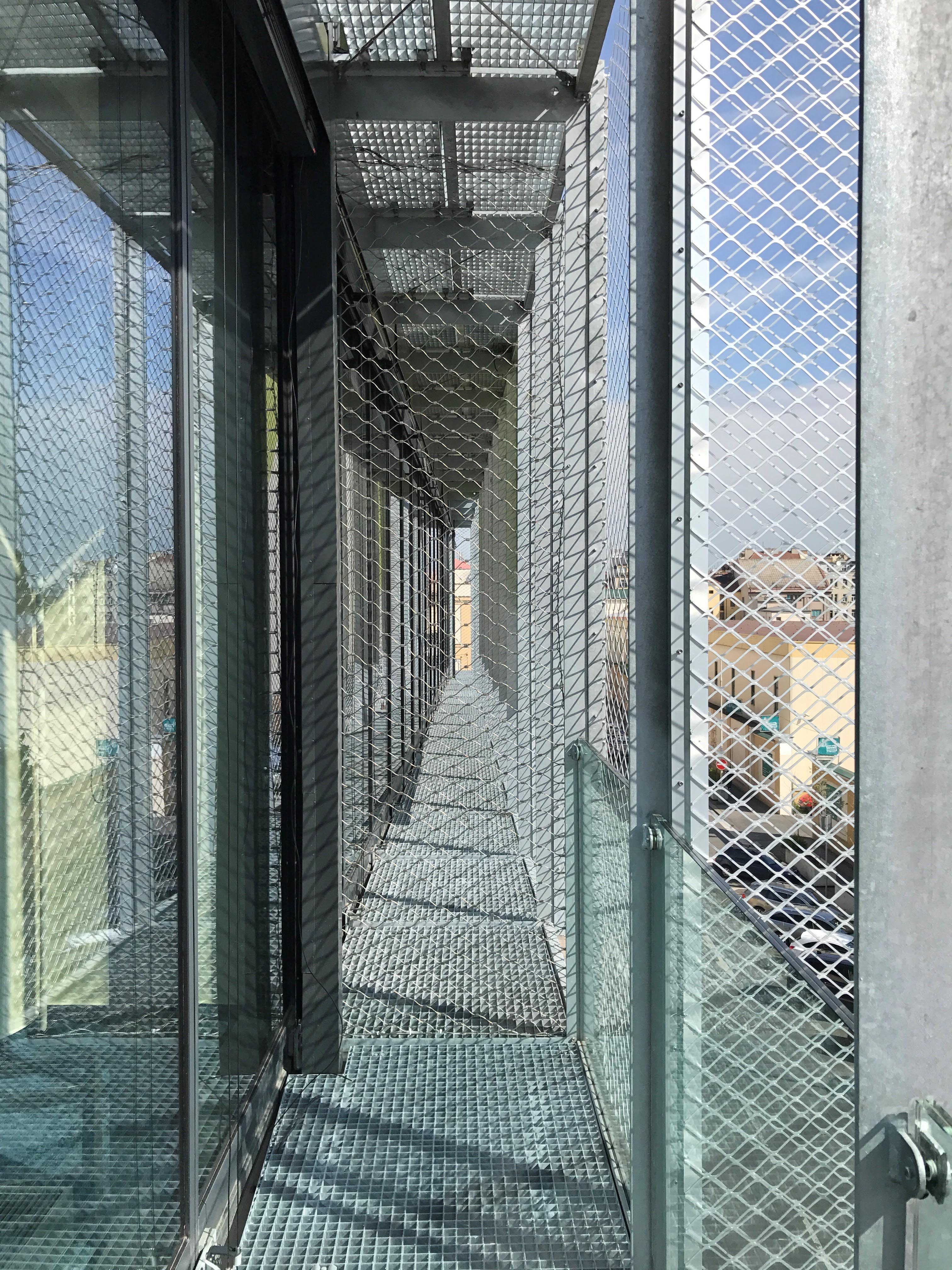 Členenie obvodového plášťa s predsadenou “ochodzou” z hliníkového ťahokovu nadväzuje na rímsy okolitých domov. Netradičný predsadený plášť pred presklenou rastrovou fasádou vytvára jemnú bariéru, ktorá počas dňa zabezpečuje tienenie, pričom neobmedzuje výhľad z interiéru.