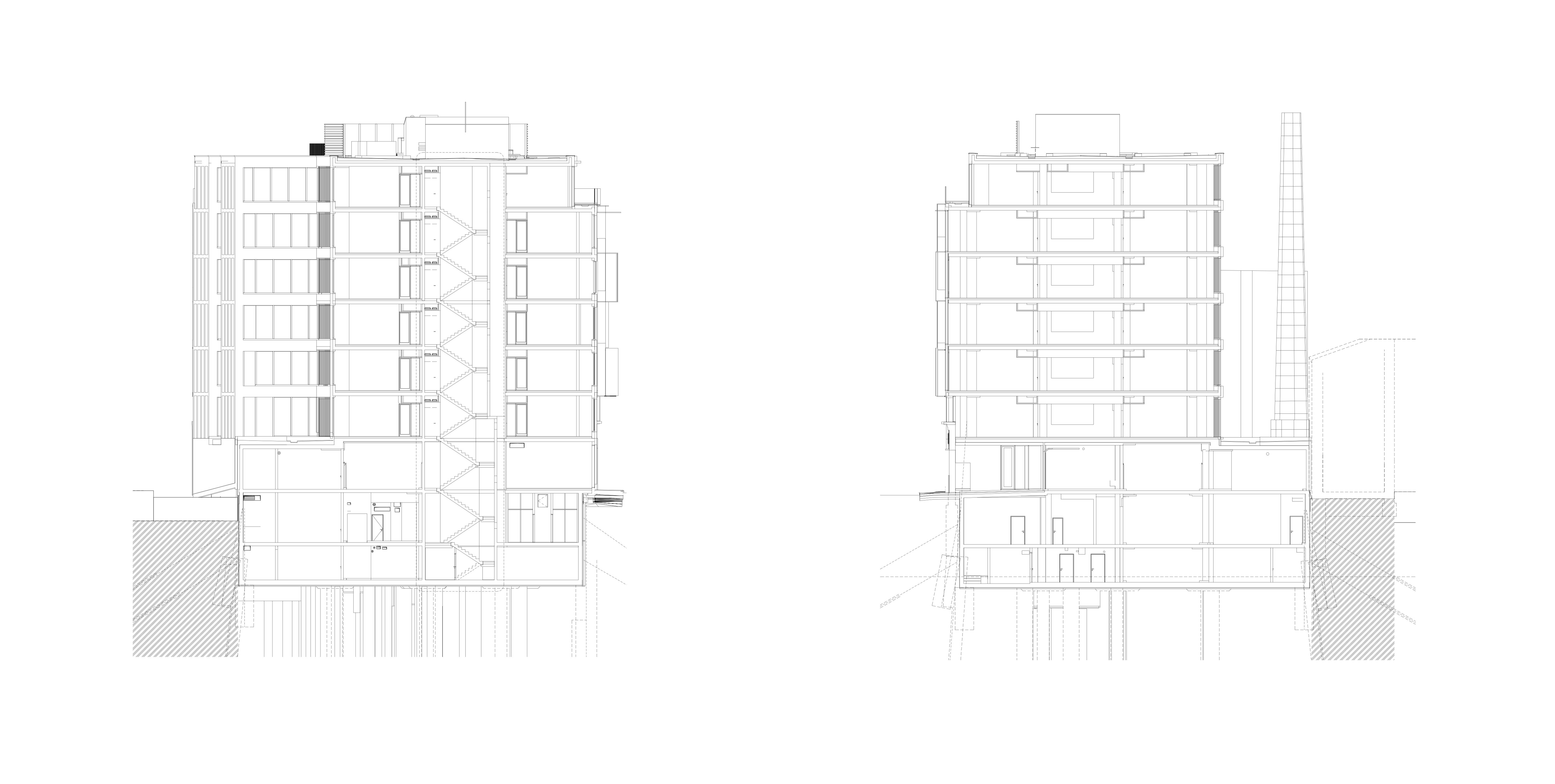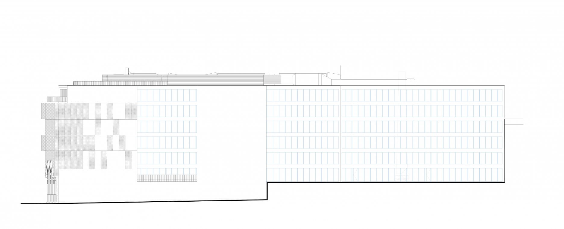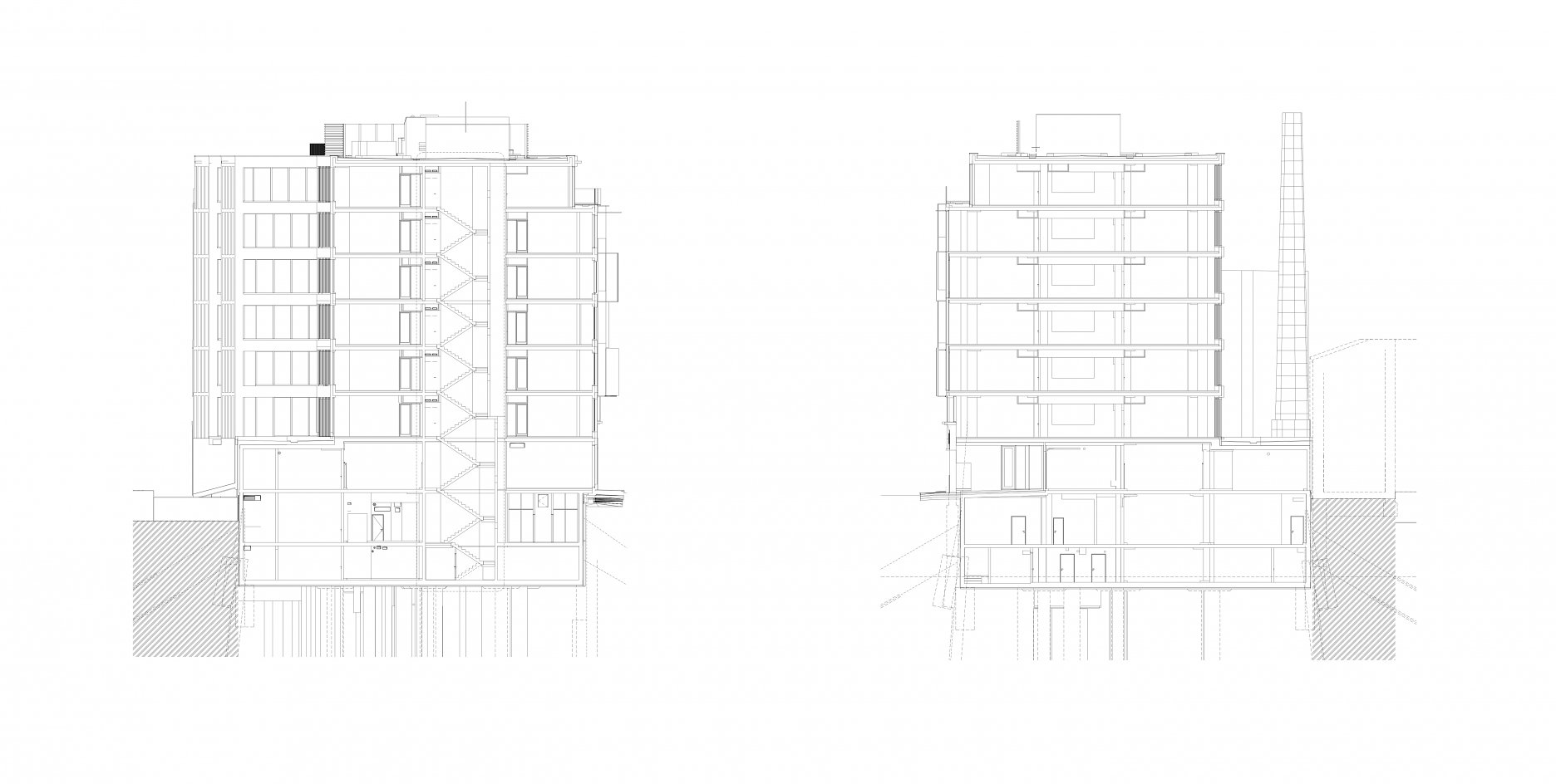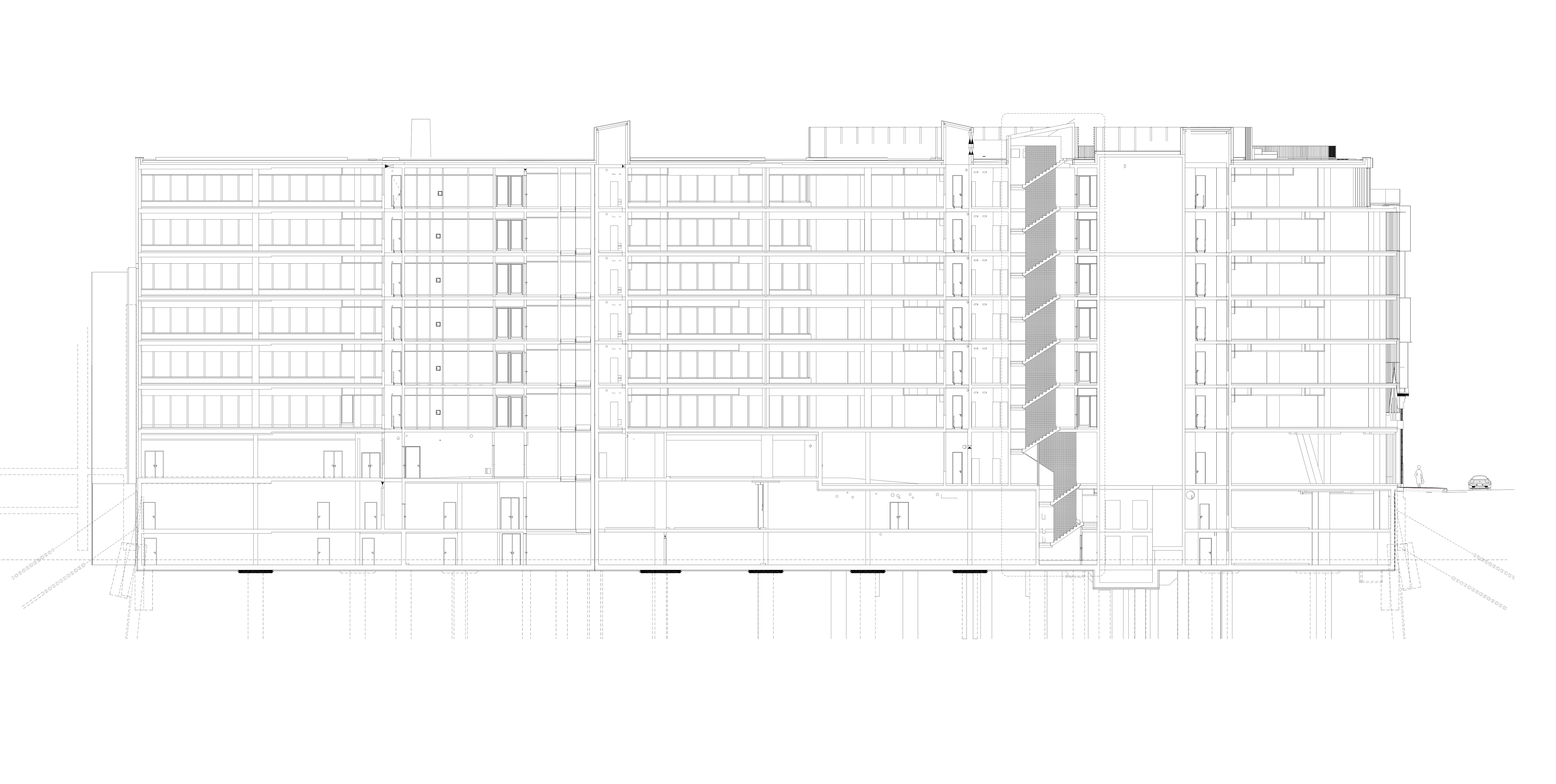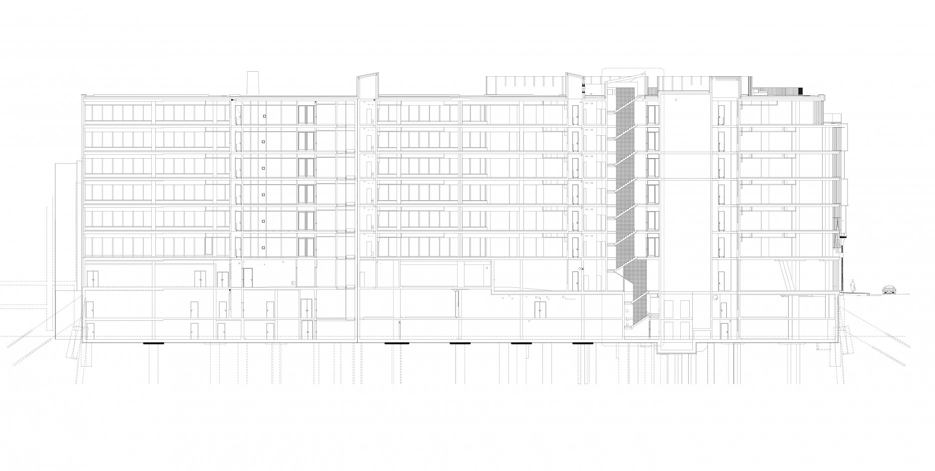 Atraktívny parter ústi do centrálnej haly. Vysoký strop a masívne historické murivo nadväzuje na pôvodný halový charakter objektu. „V interiéru se též objevují původní prvky jako jsou například velké hodiny ve vstupní hale, kde je recepce”, dopĺňa architekt David Wittassek. S patinou pôvodných materiálov kontrastujú nové oceľobetónové stropy a steny, konštrukcie sú jasne odlíšené. Nový sedempodlažný blok na najvyššom podlaží ustupuje a vytvára priestor pre terasu s výhľadom na Vltavu, Vyšehrad a Pražský hrad.