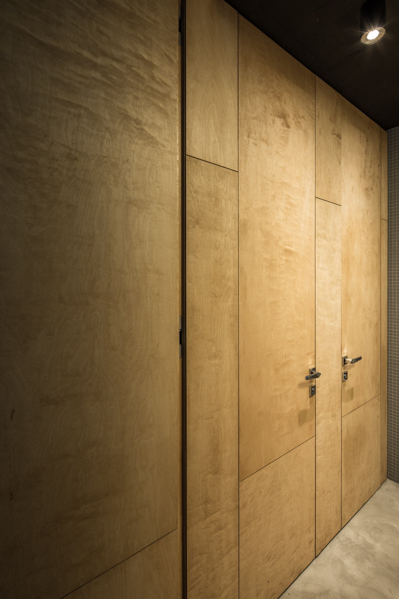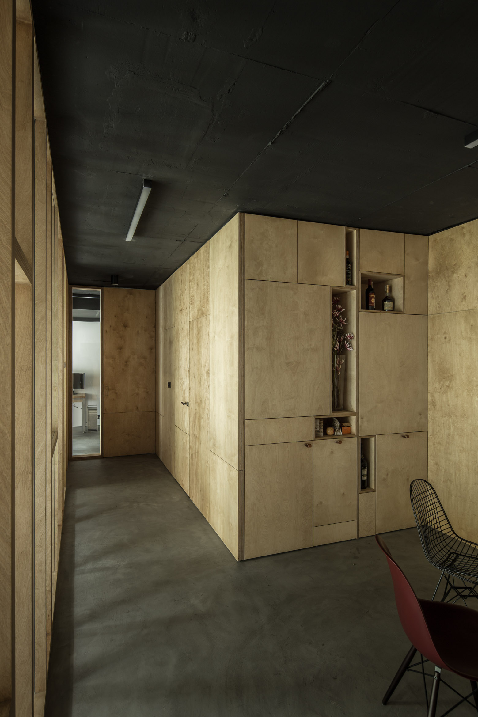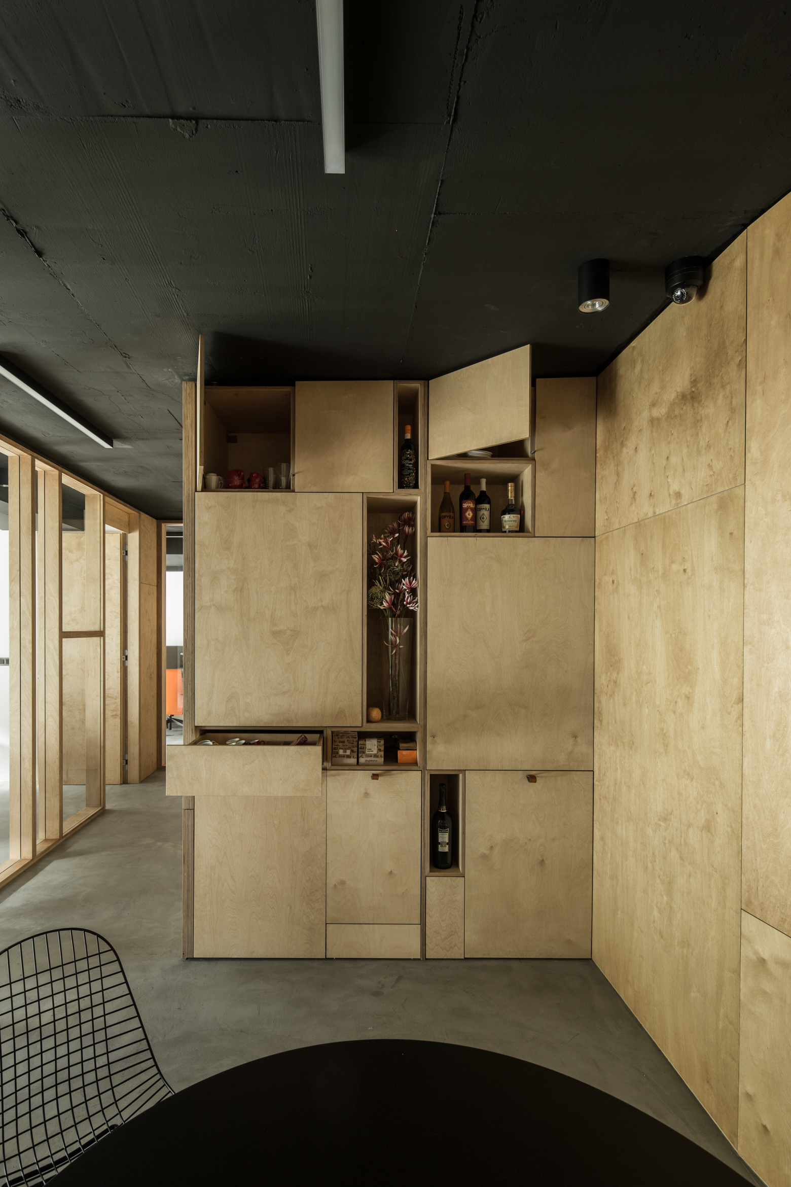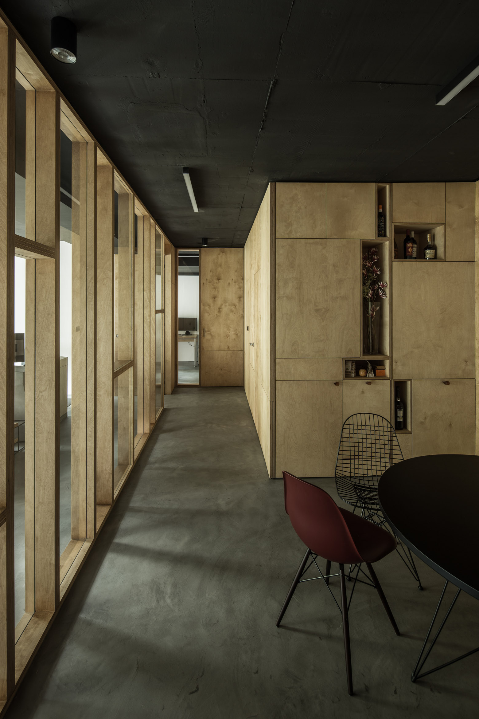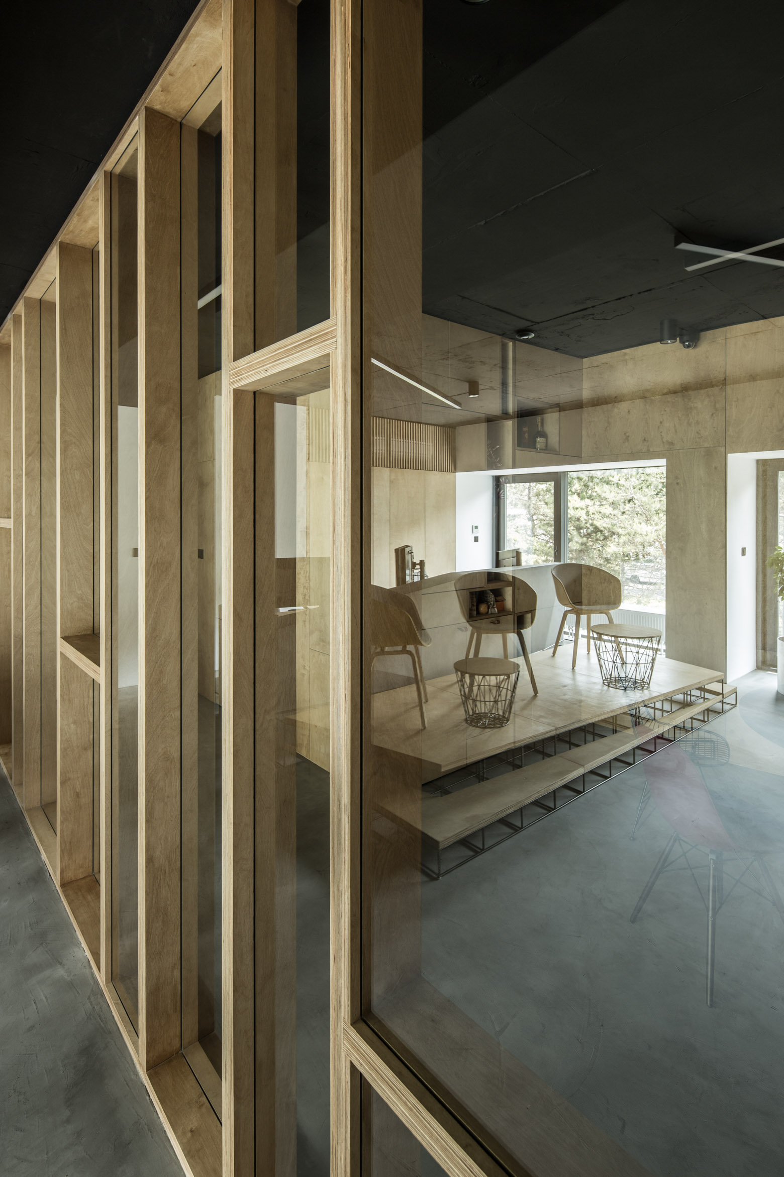 Túto miestnosť oddeľuje od chodby atypická presklená stena s preglejkovými rámami.