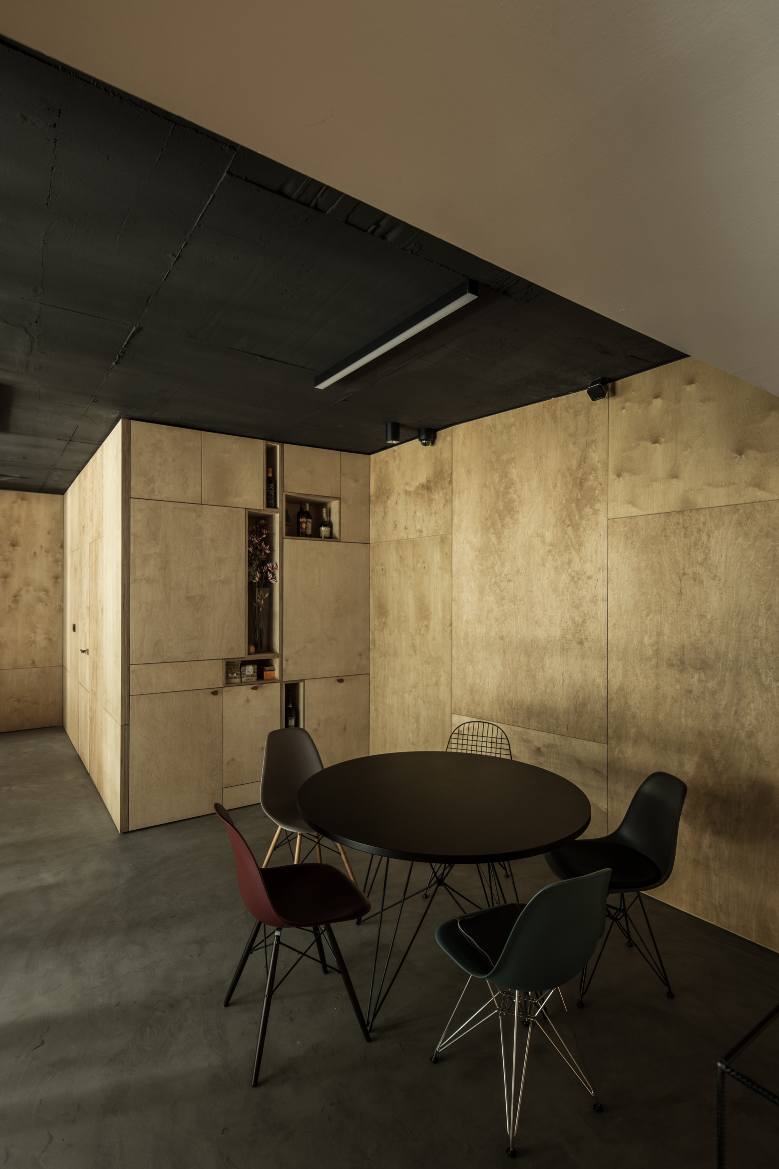Za týmto priestorom sa nachádza preglejková “krabica“, vo vnútri ktorej sú toalety. V rohu dispozície je situovaná miestnosť s technológiou. Nájdeme tu výkonný hardvér pre potreby štúdia.