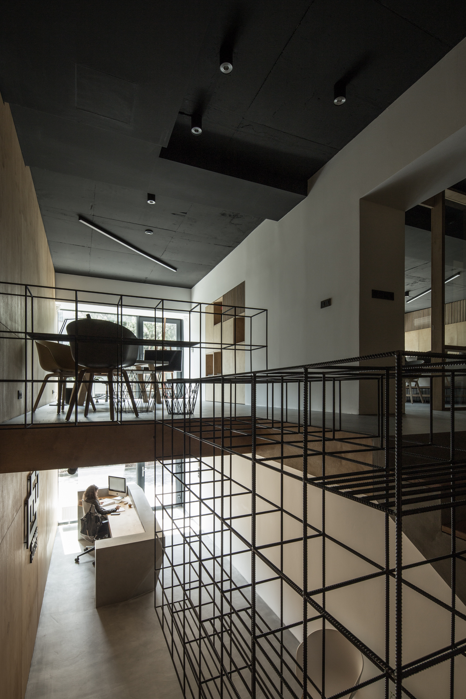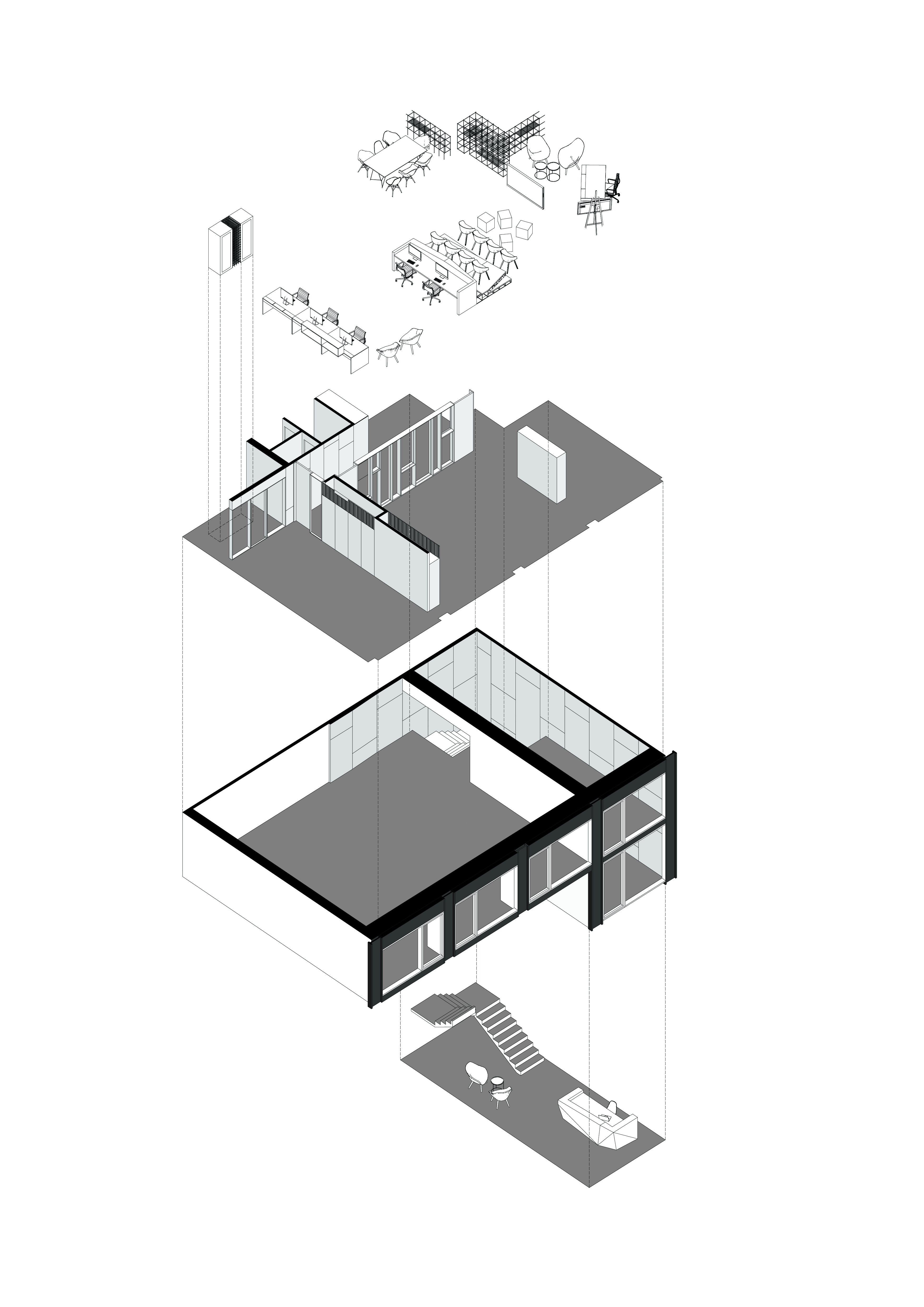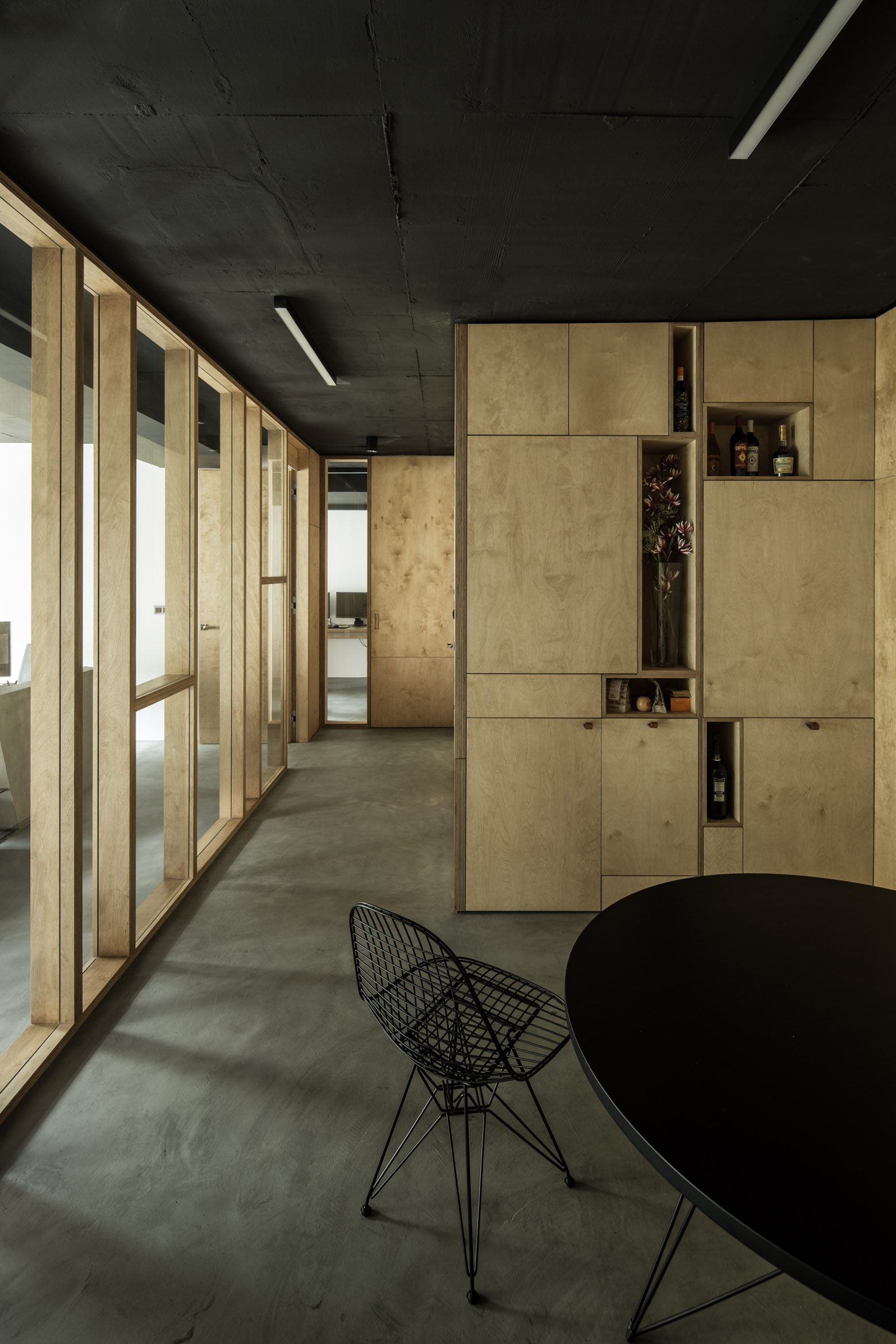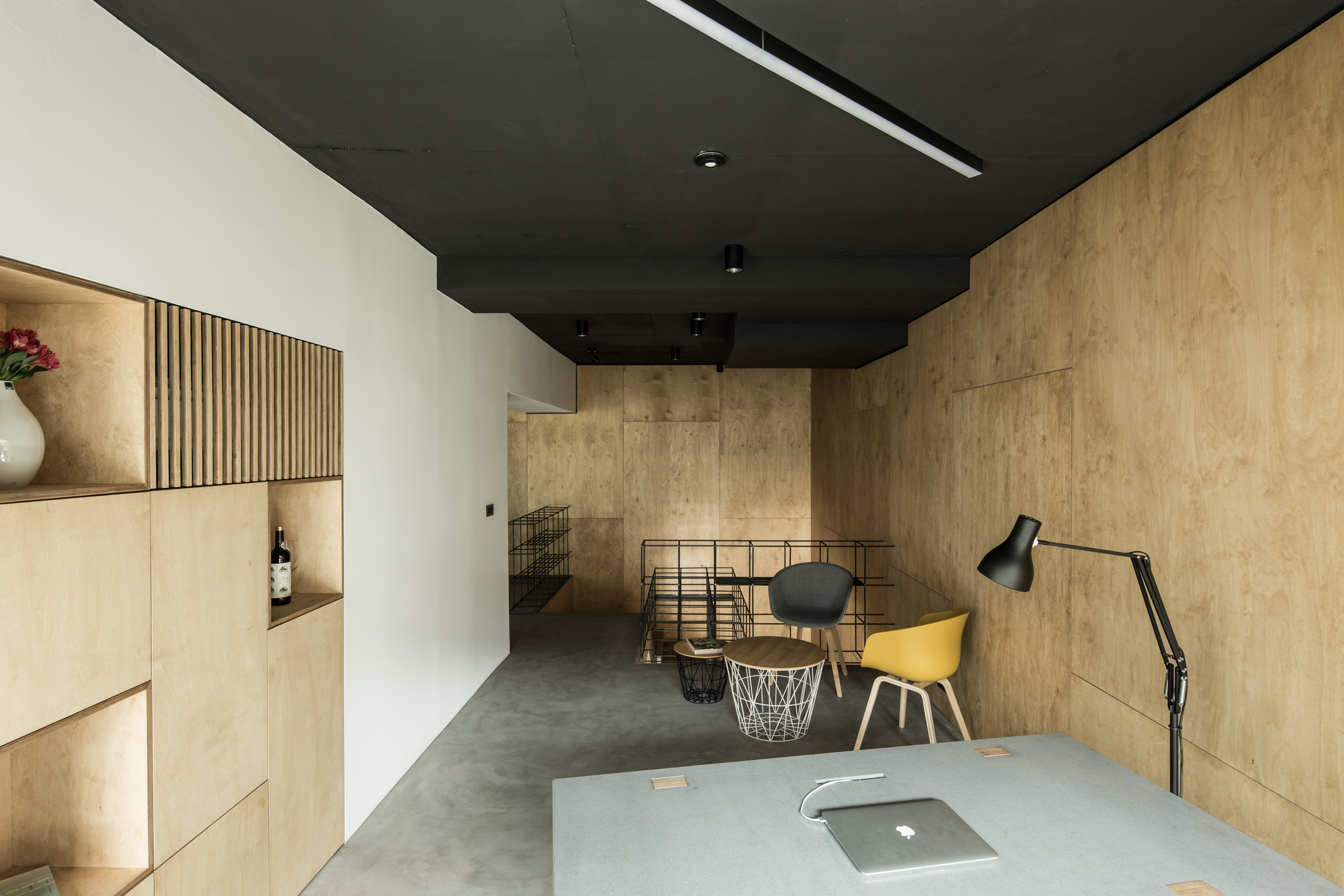 Online office je koncipovaný ako showroom pre klientov s dominantným zalomeným betónovým pracoviskom a s vyvýšeným divadelným sedením, ktoré slúži na účely prezentácie tvorby.