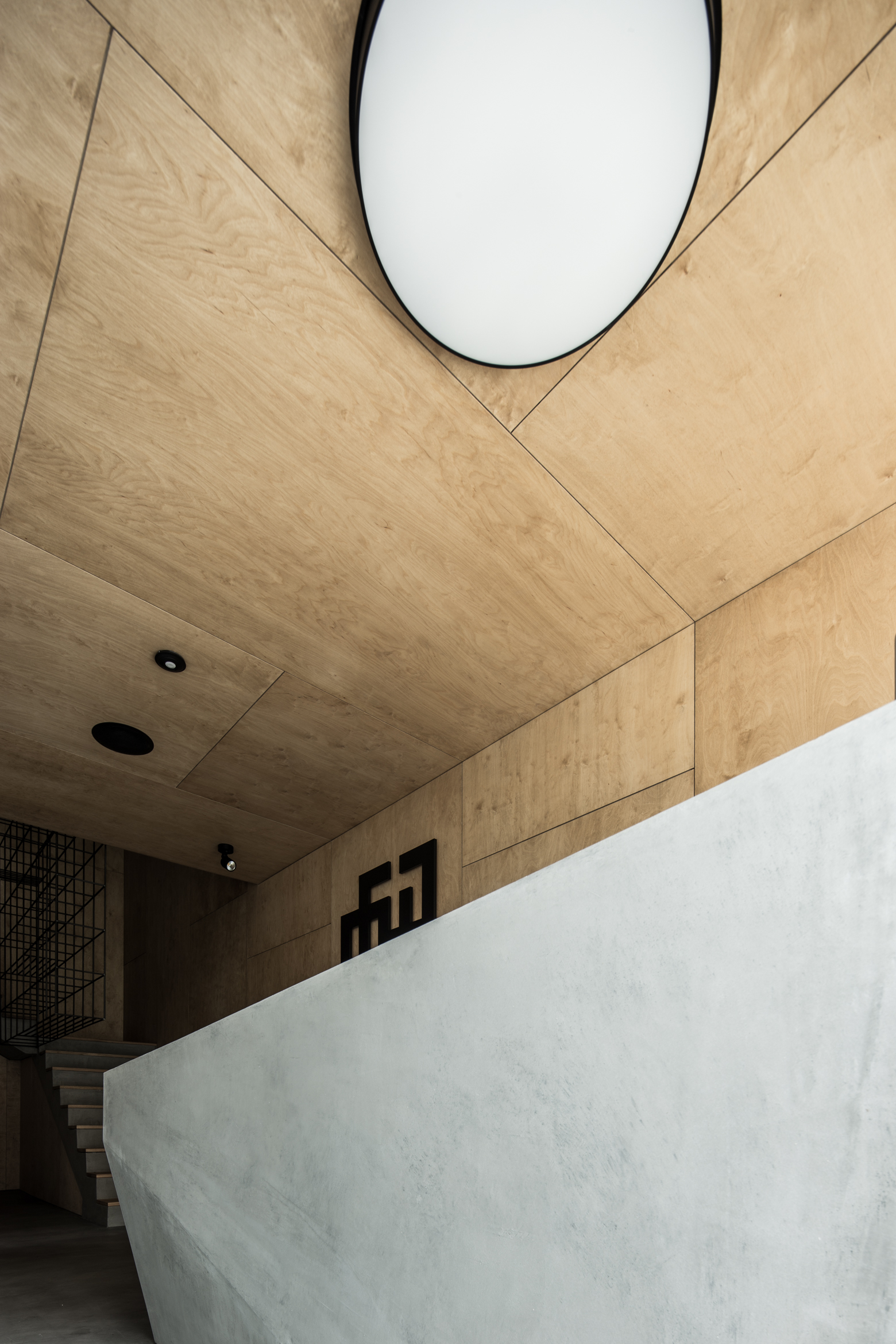 "Hranatosť recepcie kontrastuje s mäkkou kresbou veľkoformátových obkladov stien z morenej preglejky"