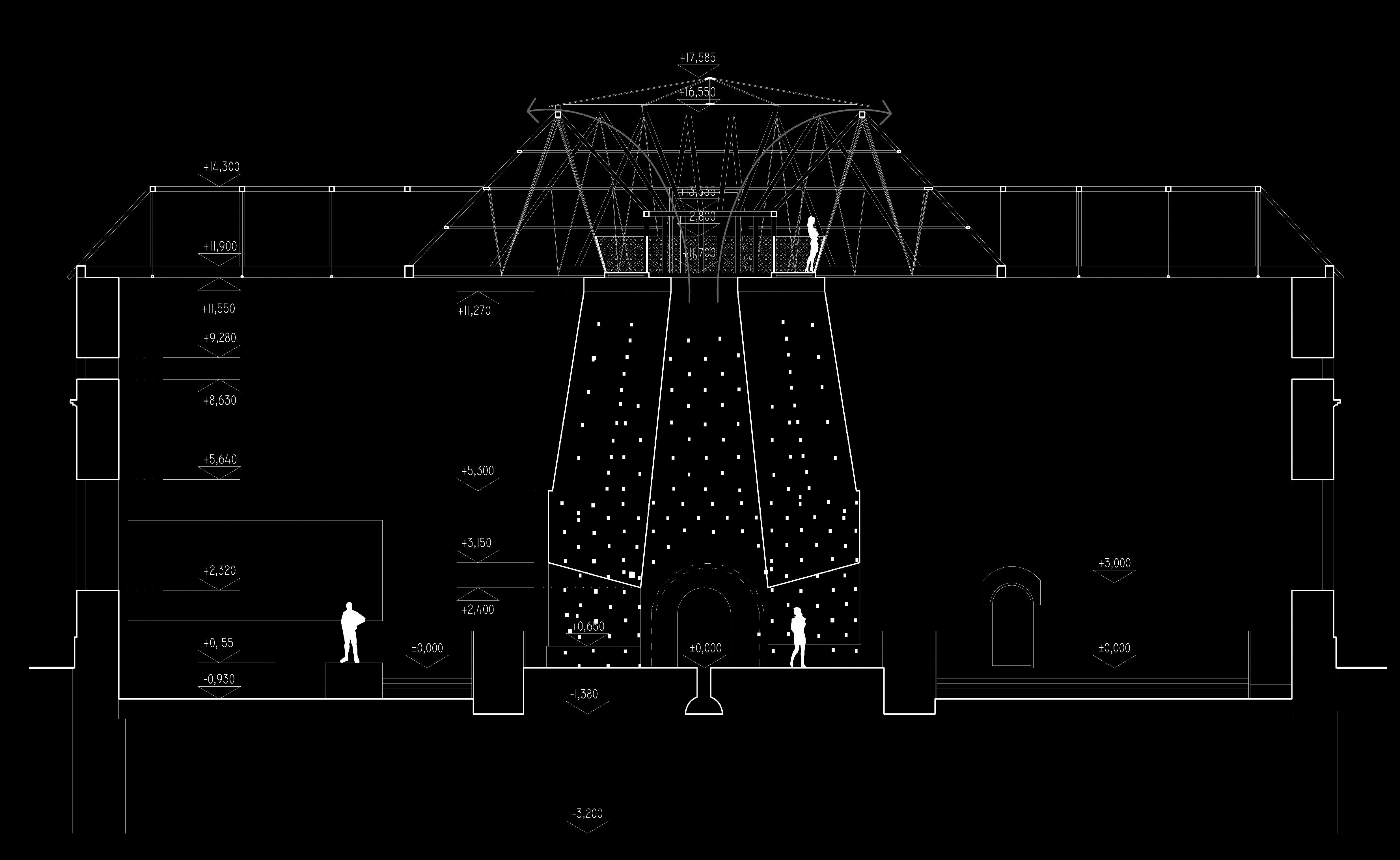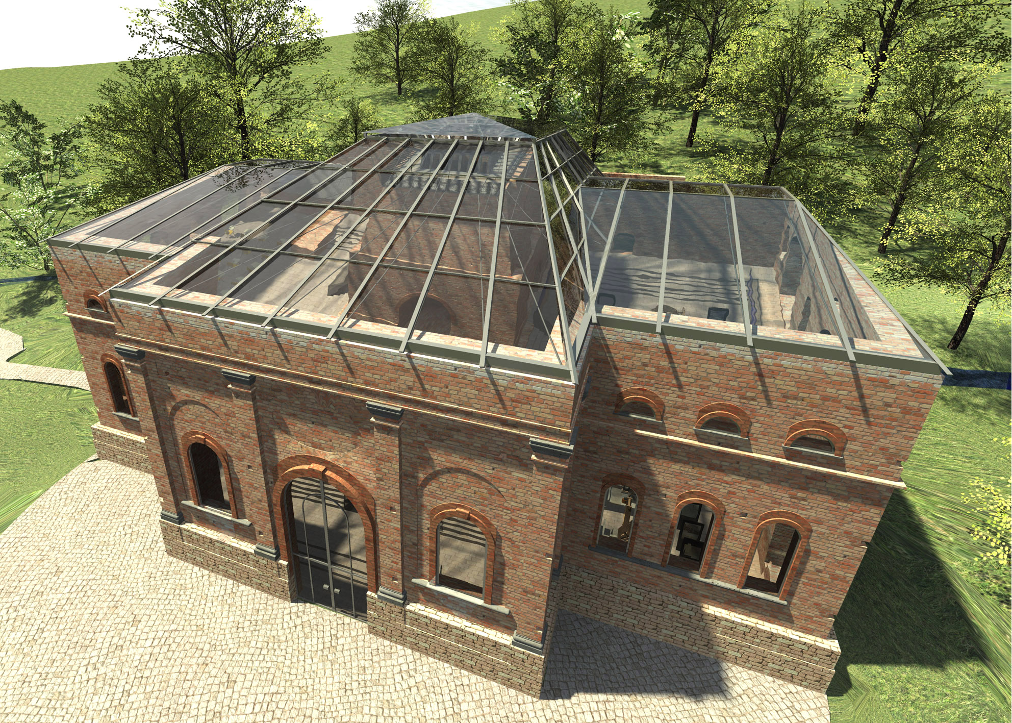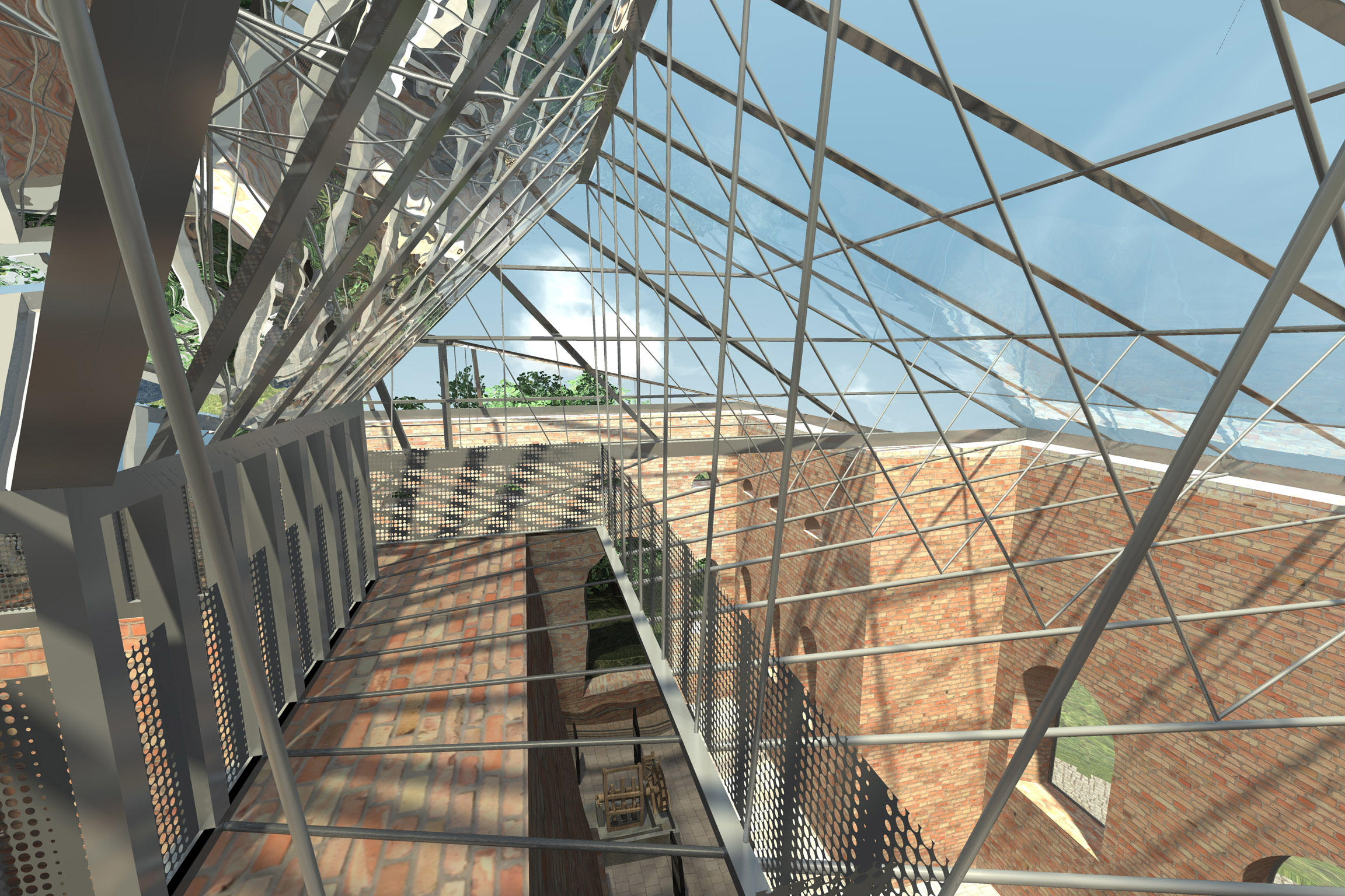 Prestrešenie Františkovej huty je navrhované ako novotvar. Materiálové prevedenie: sklo a oceľ. Strechu tvorí sústava väzníkov, ktoré sú opreté o oceľovú pomúrnicu, ktorá je osadená na doplnené korunné murivo (tehla farebne odlíšená od pôvodného muriva). samotné väzníky sa skladajú z oceľových profilov, a oceľových lán. Odvetranie strechy je zabezpečené škárami. Odvodnenie je umožnené vyspádovaním strechy a jej presahom cez obvodový plášť, bez použitia pododkvapového žľabu.