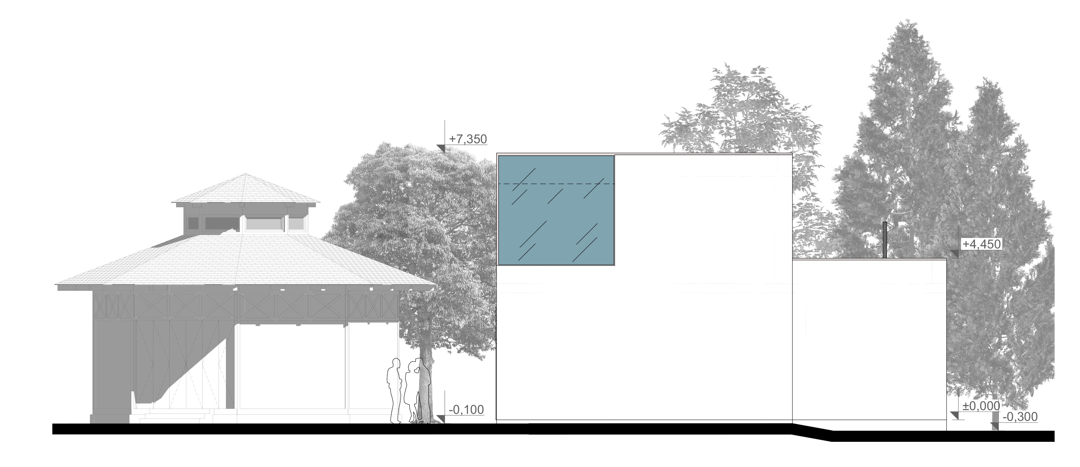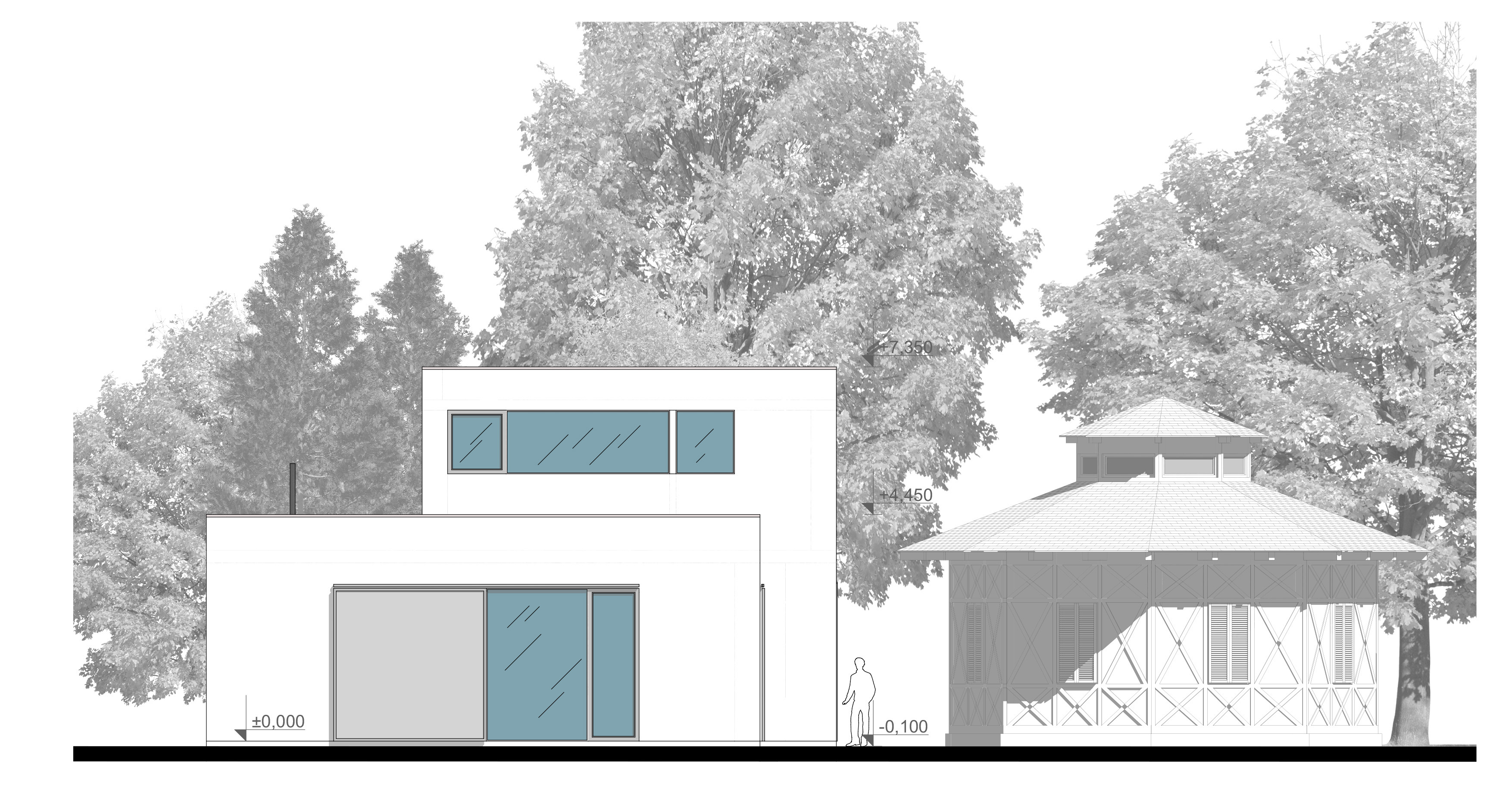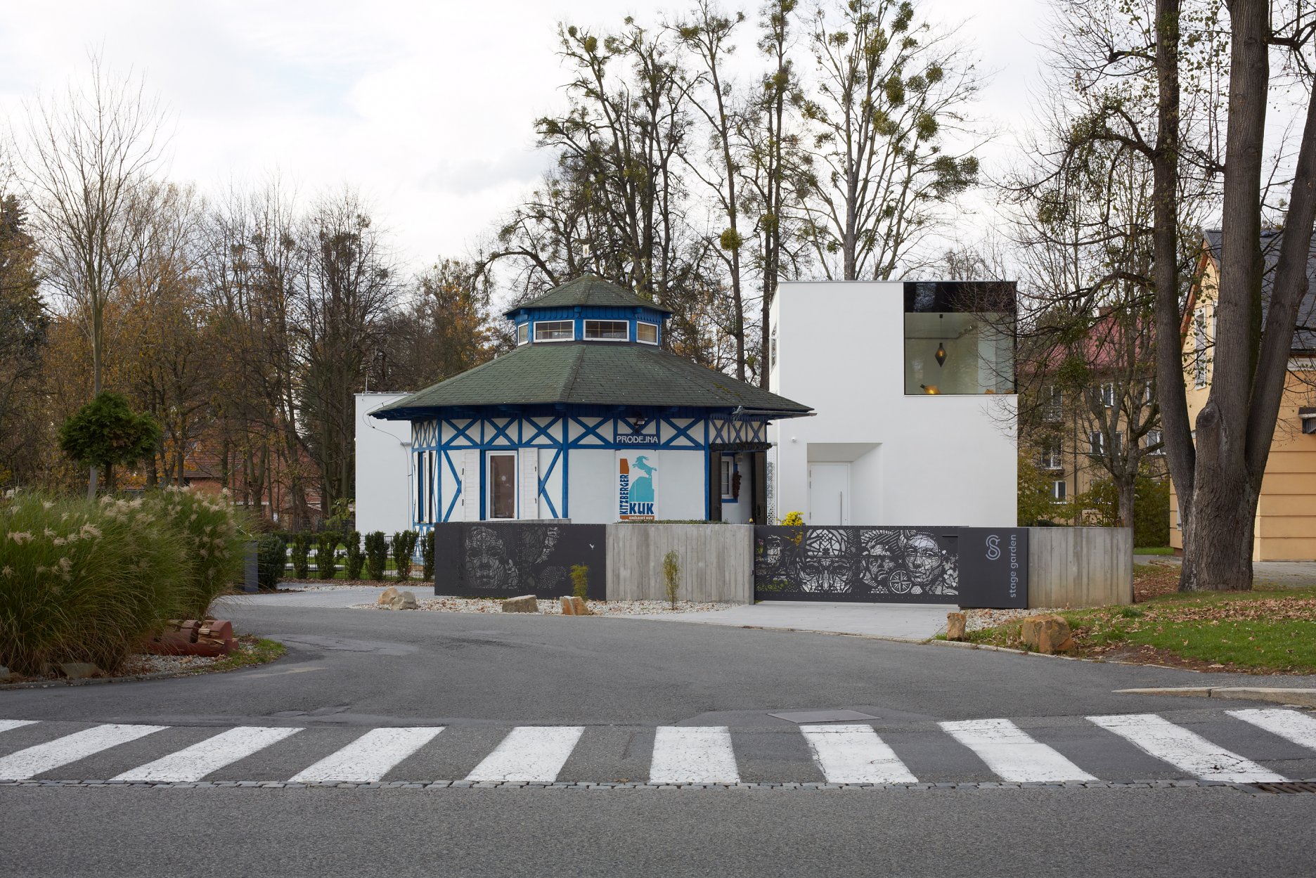 Nová galéria stojí až v druhej línii za spomínaným altánkom. O slovo sa hlási “vežou”, s dominantným veľkoplošným bezrámovým rohovým oknom. Zámerne zvolená asketická forma tvorí neutrálne pozadie pre vystavované diela. “Důležitou roli v celkovém výrazu sehrává vstupní portál s jednoduchým základním kompozičním členěním otvorů a zapuštěným vstupem, stejně jako křehké okenice - posuvné stínící plechové panely s vypalovanými figurativními motivy, které jsou uměleckým dílem a trvalou součástí expozice. Hra světel, slunce a stínů na bílé hmotě je tak umocněna nejen na vnější tváři budovy, ale i v interiéru. Dodává výstavní expozici další napínavou měnící se atmosféru,” vysvetľuje architekt Karel Janča.