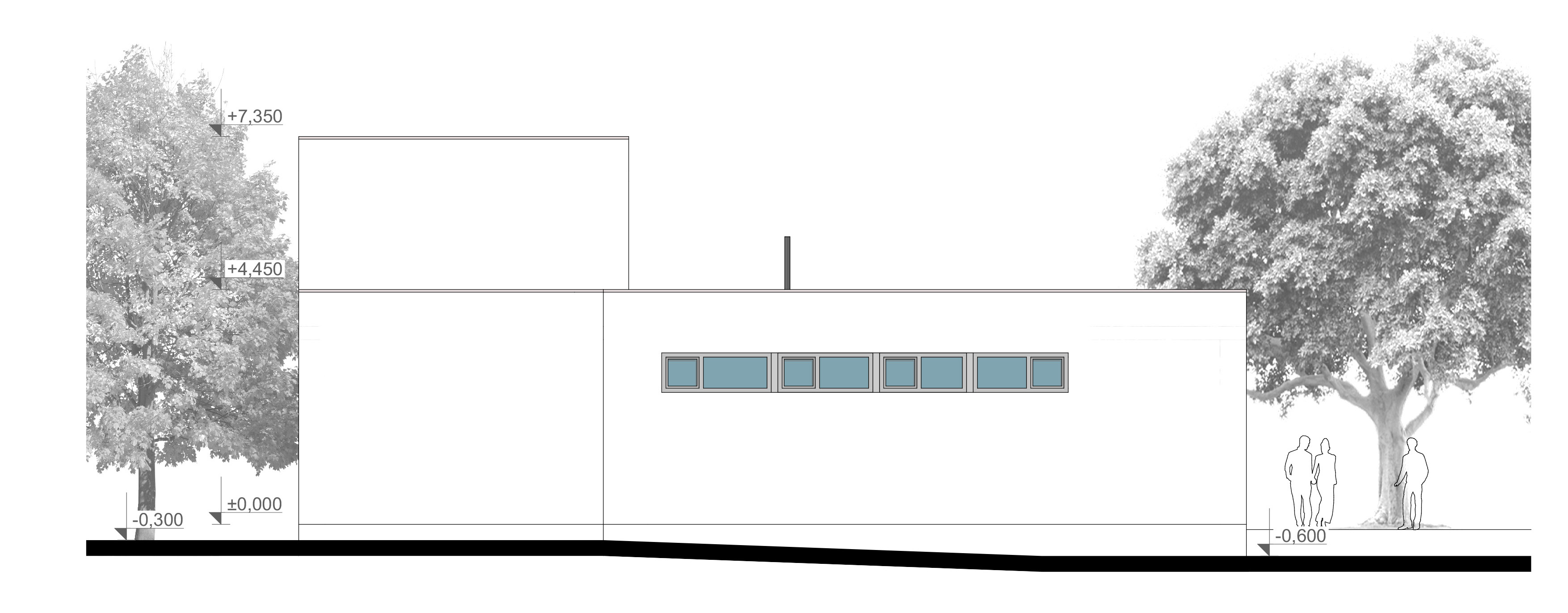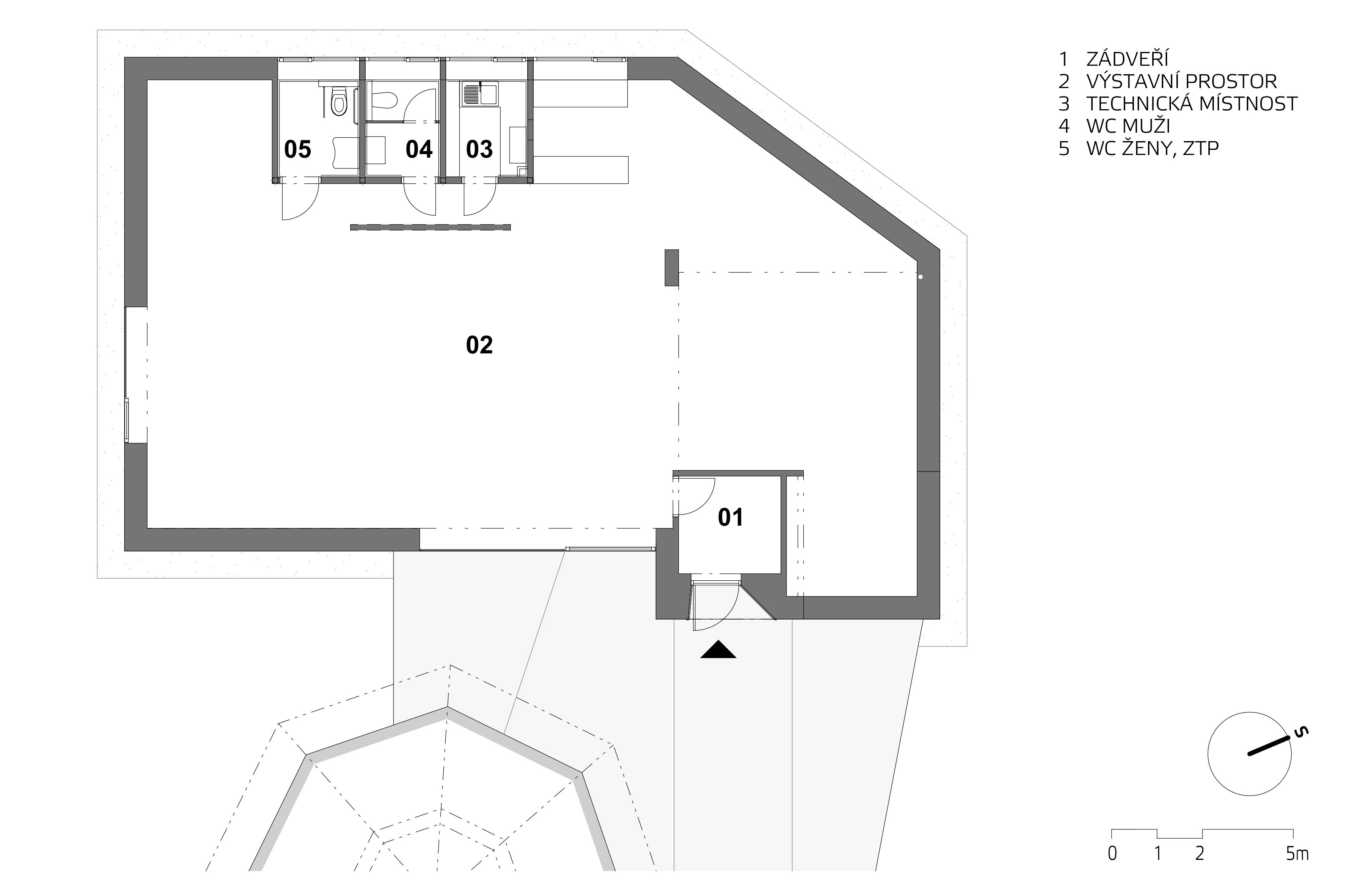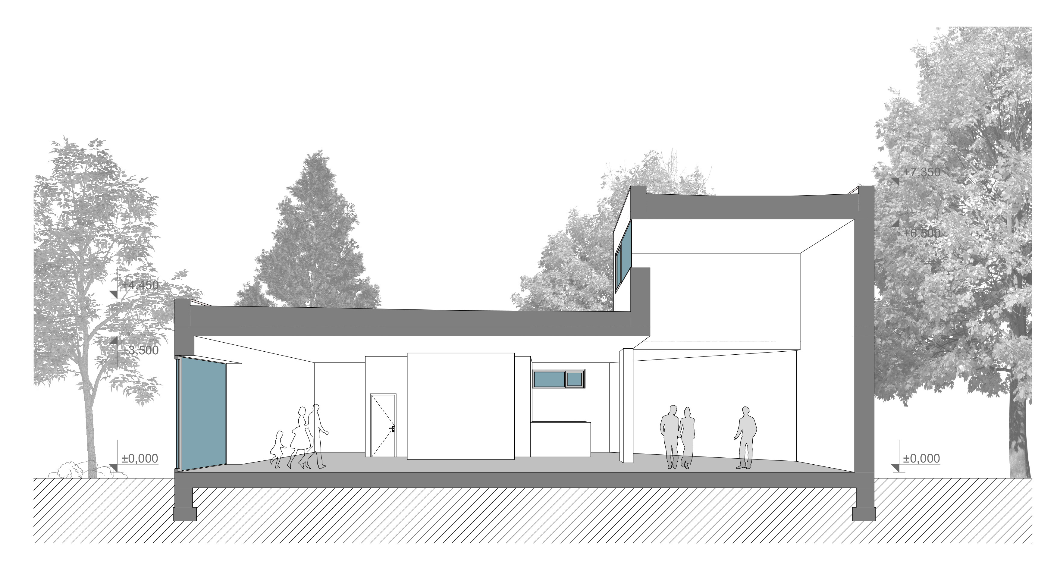 Otvorený výstavný priestor je podľa potreby delený mobilnými paravánmi. Blok s hygienou a technickým zázemím je pridružený k západnej fasáde.