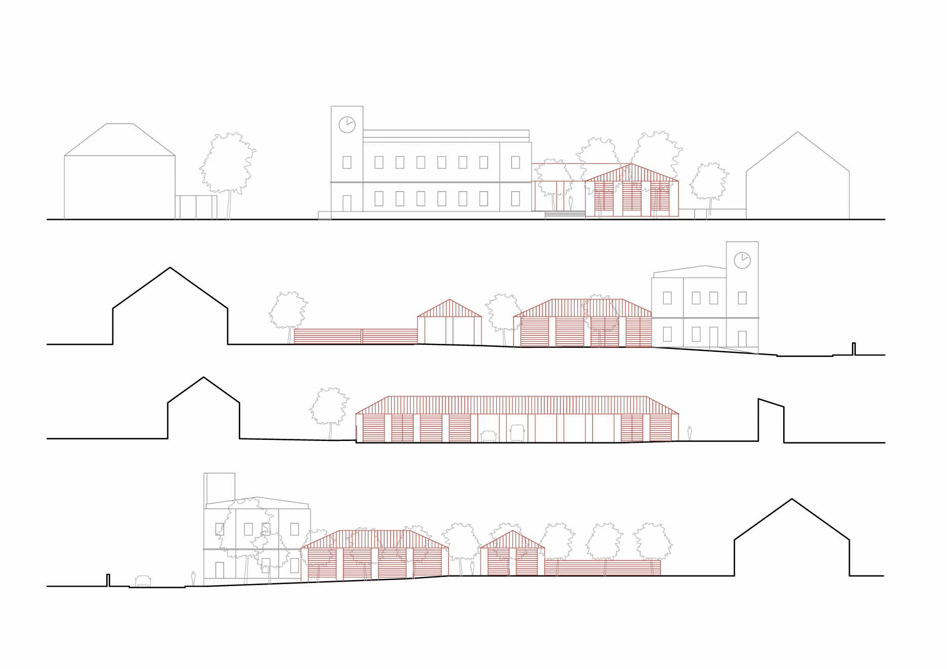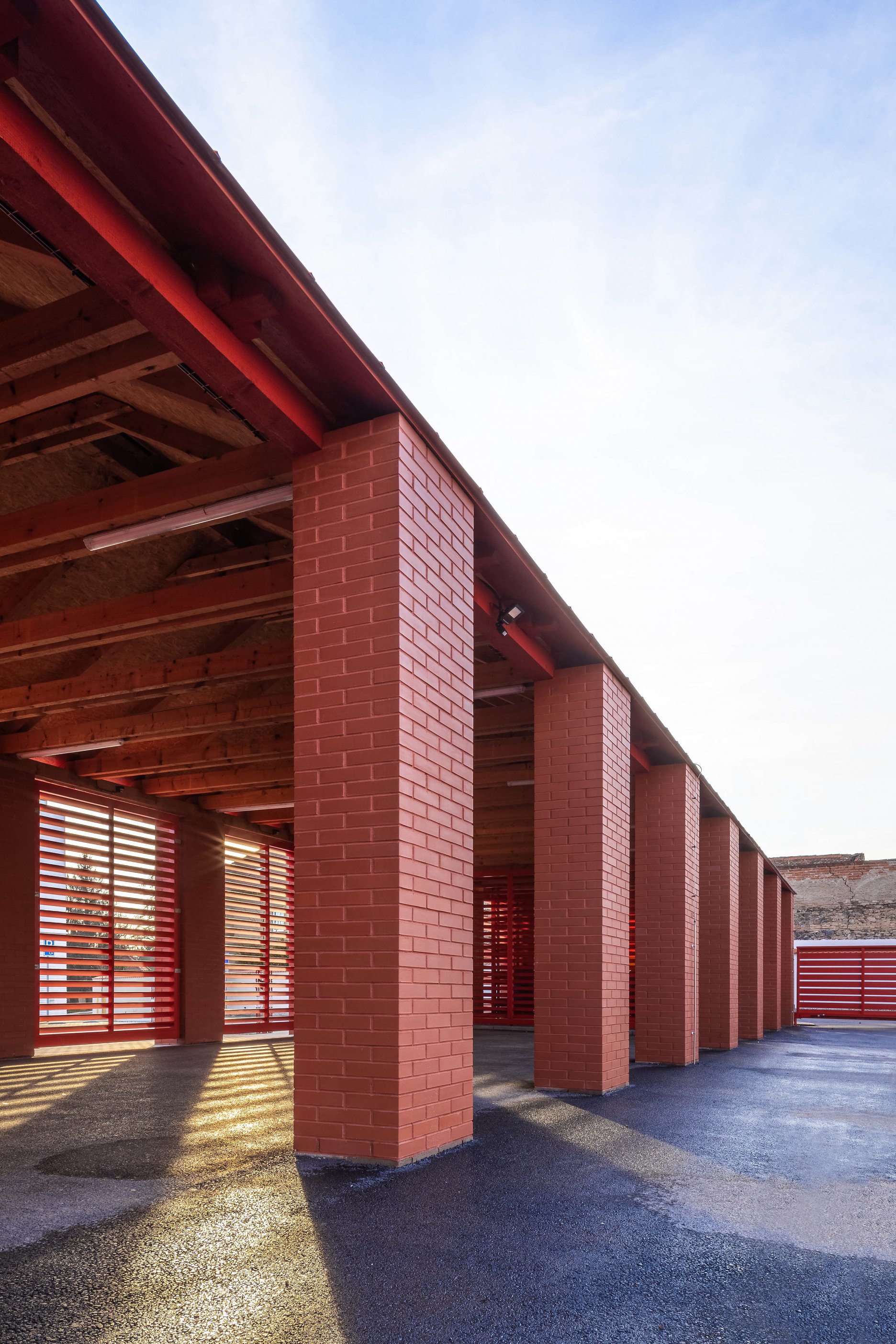 Jednotný vzhľad a tvarovanie objektov odkazuje na tradičnú konštrukciu dedinskej hospodárskej stavby. Obstavané piliere vymedzujú úžitkový priestor a podopierajú drevenú konštrukciu valbovej strechy, so strešnou krytinou z veľkoformátového plechu. Voľný priestor medzi piliermi vypĺňa raster drevených lamiel, ktorý zaisťuje dostatočné prevetranie a presvetlenie objektu. V exponovanej časti slúži zároveň ako slnolam. Vykurované priestory sú zateplené zvnútra, prostredníctvom vložených izolačných panelov. Zjednotená farebnosť objektov v blízkych odtieňoch červenej - od prírodných tehál, cez farbu strešnej krytiny a vnútornej výmaľby v odtieni antuky, až po krycí náter okien a žalúzií - zdôrazňuje význam a spoločenské poslanie stavieb.