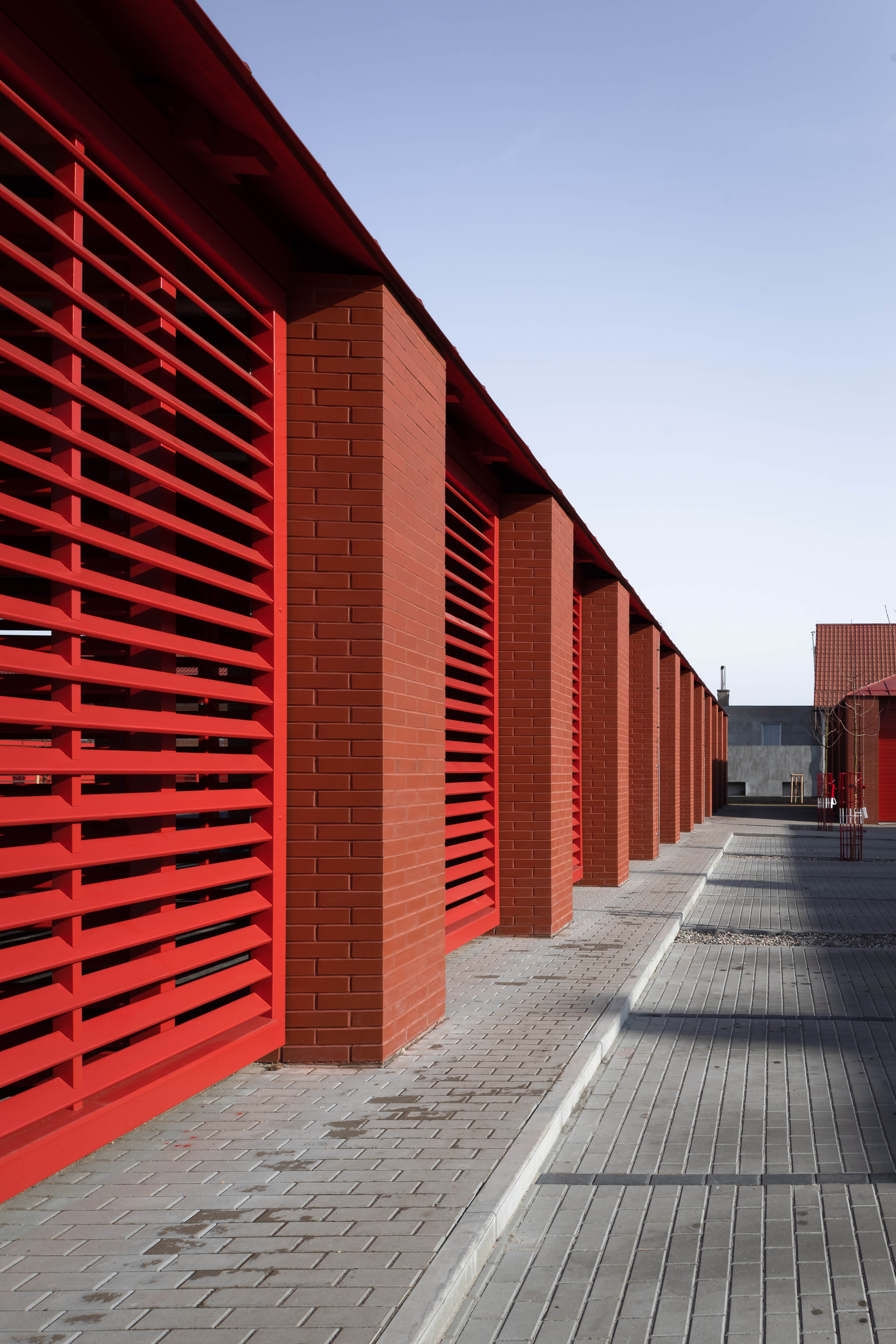 Trojica verejných stavieb - farebné objekty hasičskej zbrojnice a technických služieb, spolu s bielym domom služieb, tvorí fungujúci urbanistický celok s ľudskou mierkou.
