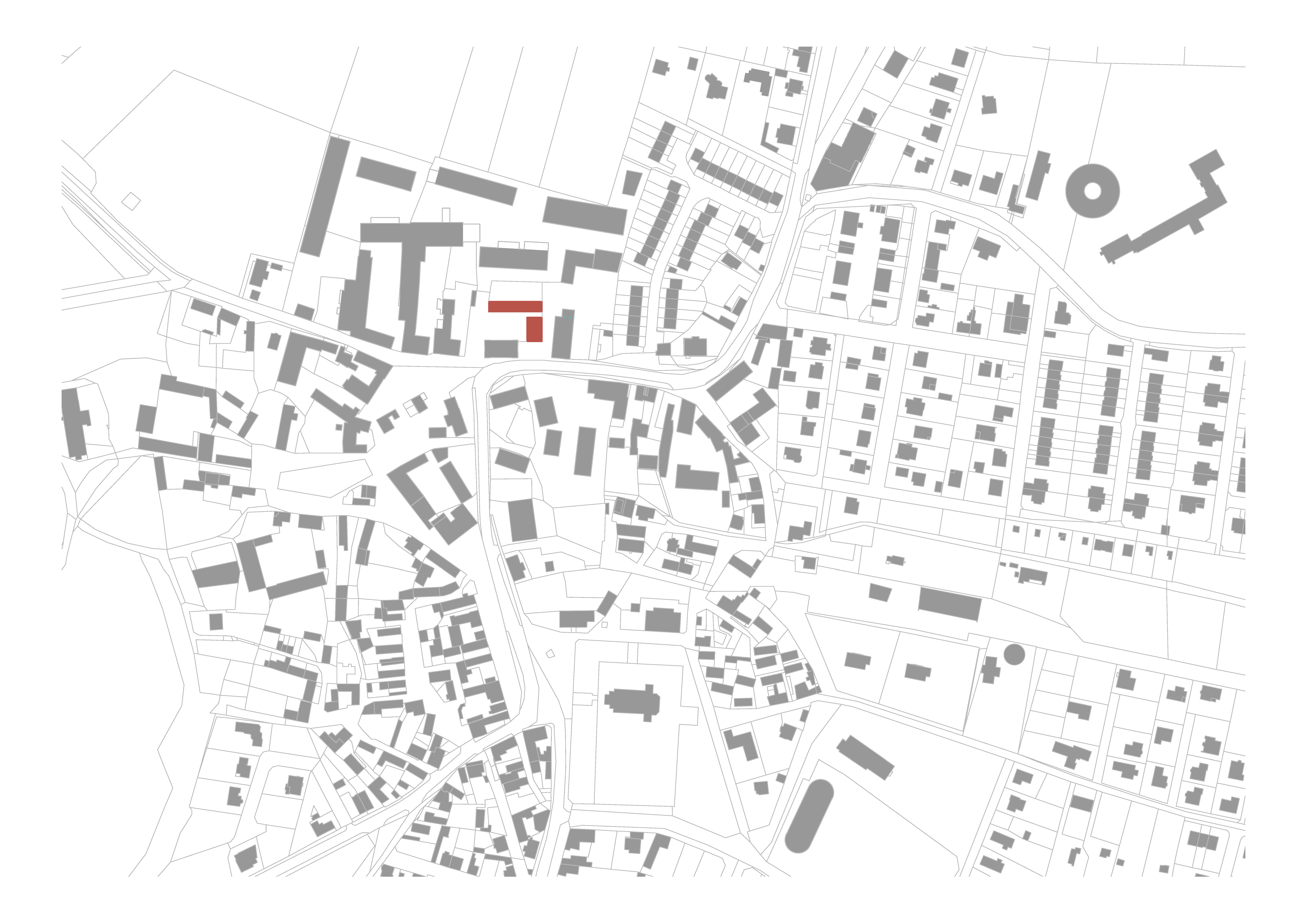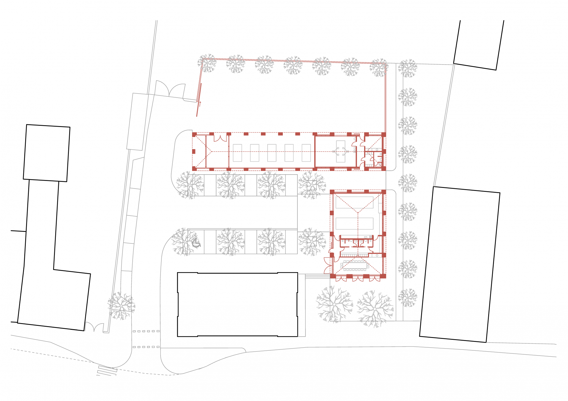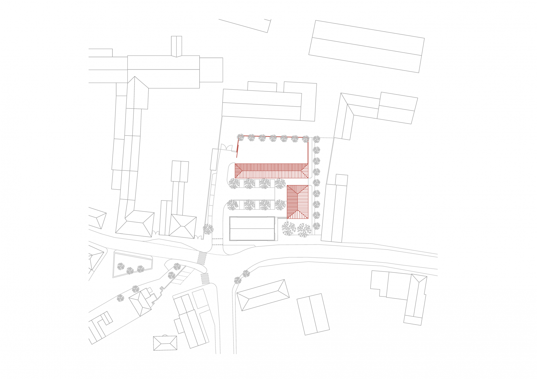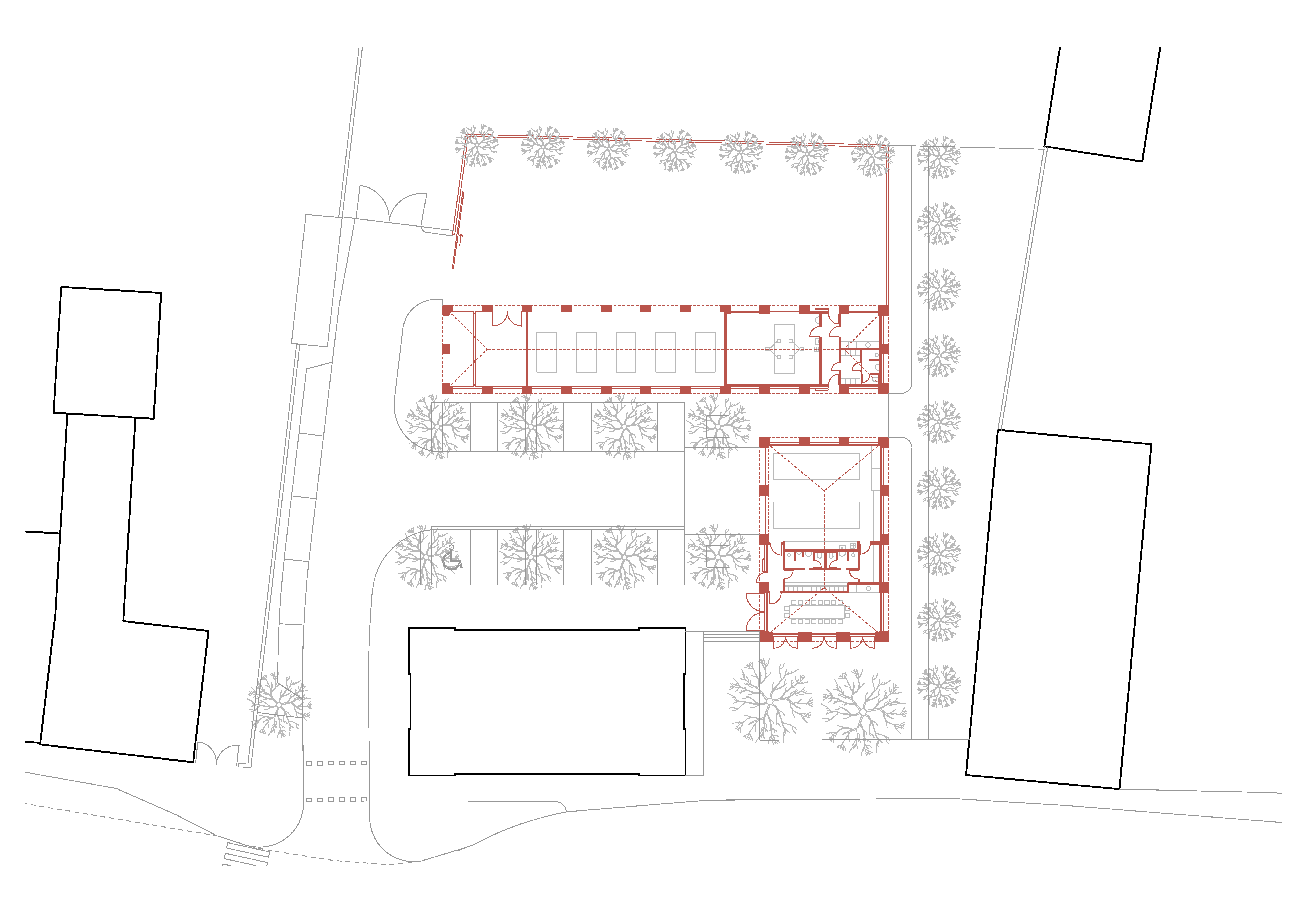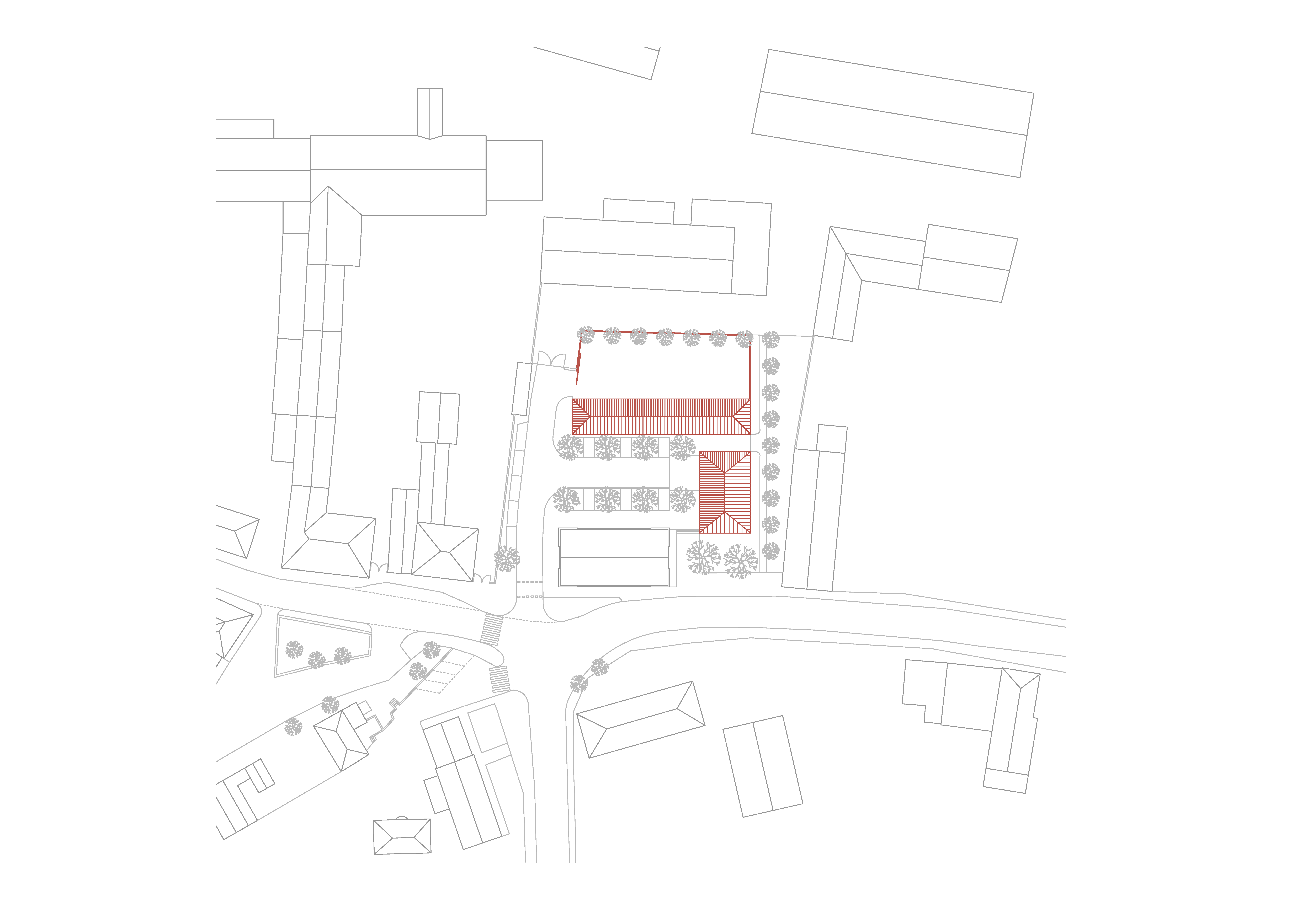 Lineárny objekt zázemia technických služieb pohľadovo oddeľuje pobytovú, reprezentatívnu časť dvoru od manipulačnej a skladovej plochy v zadnom pláne. Stanica dobrovoľných hasičov stojí v čele dvoru a je orientovaná v smere príchodu. Svojou bočnou fasádou sa zapája do priestoru ulice s parkovou úpravou. Sem je orientovaná aj viacúčelová klubovňa hasičov. Pozdĺž východnej hranice územia architekti zachovali voľný pás zelene, ktorý umožňuje pešie prepojene plánovanej obytnej štvrti na “záhumní”.