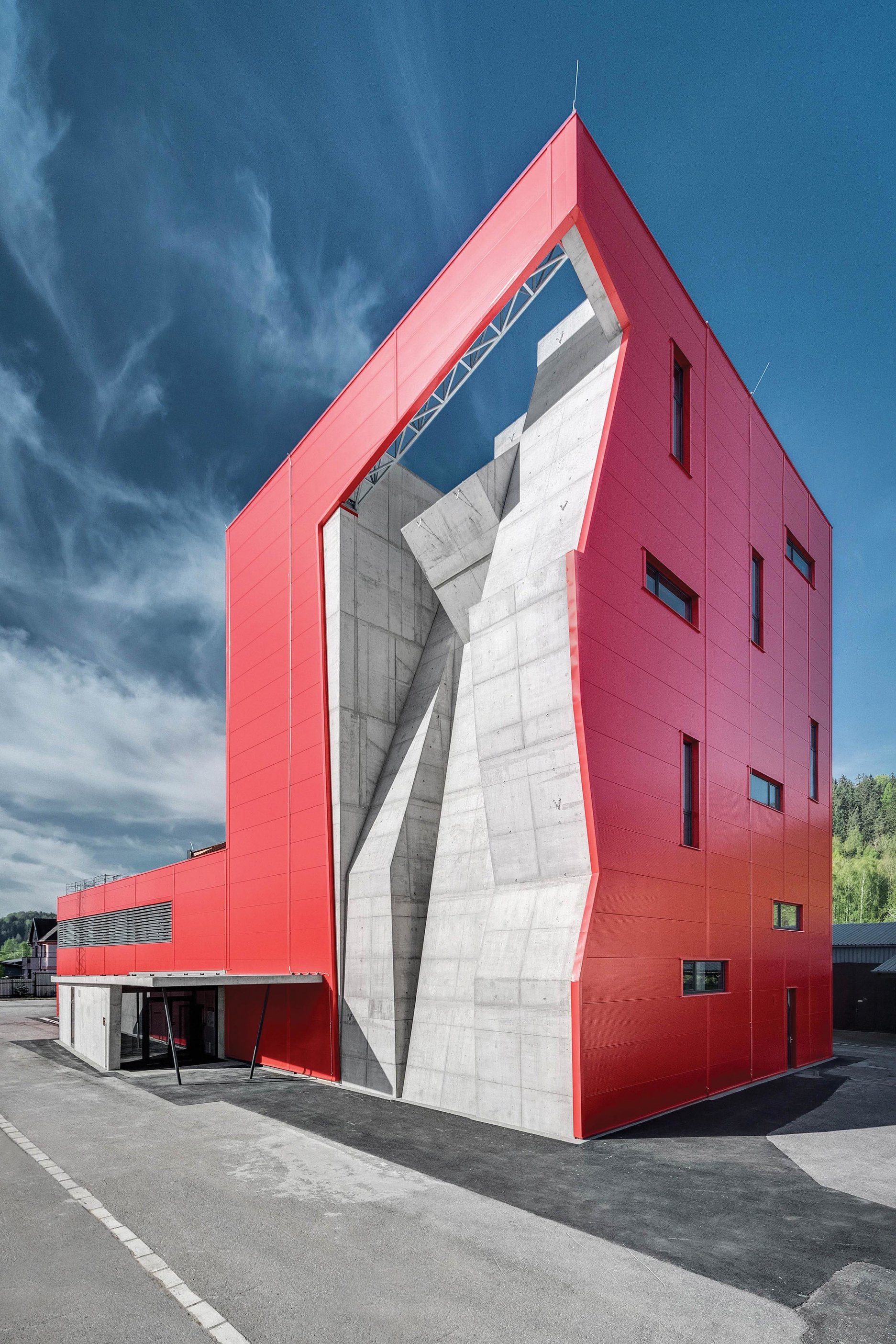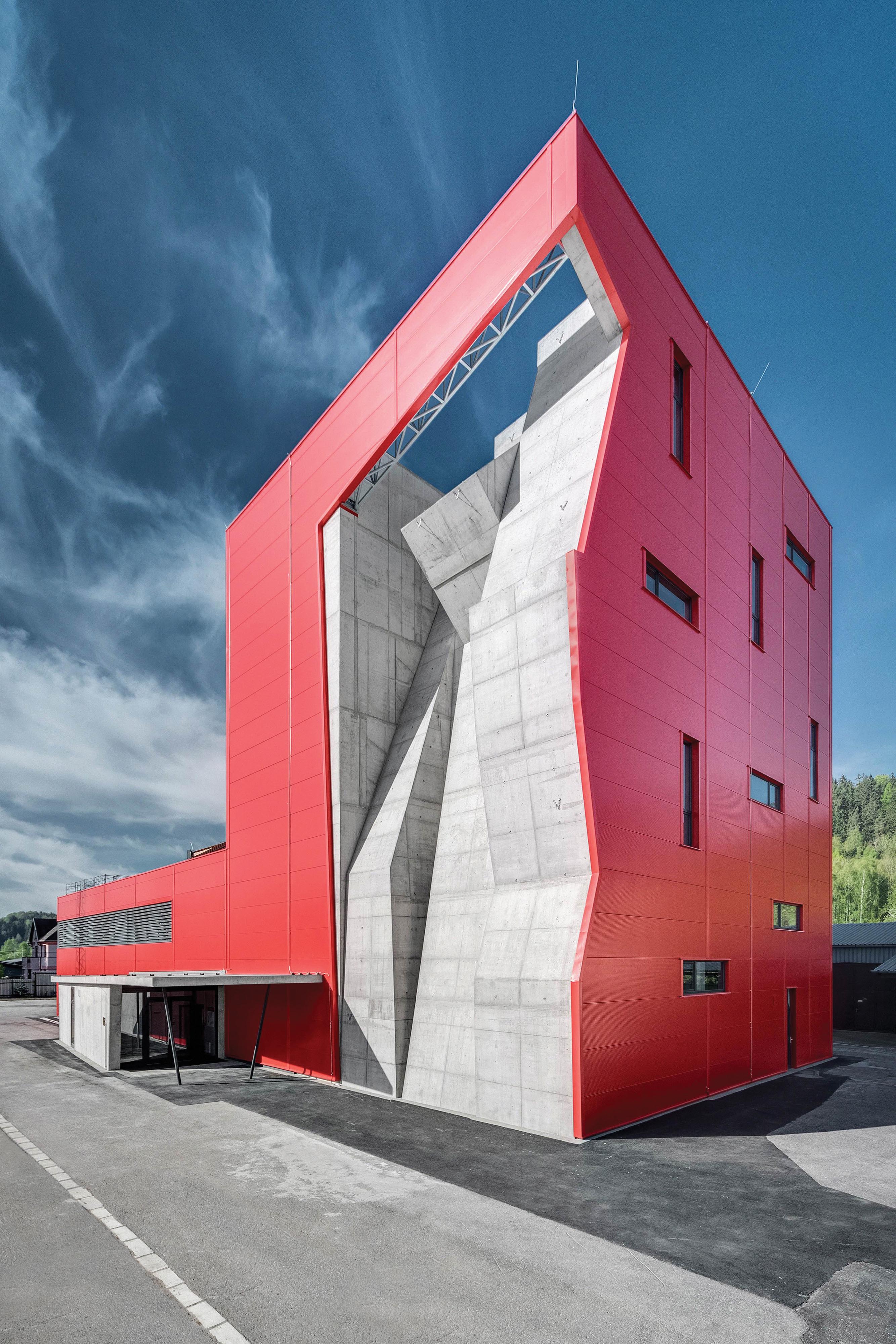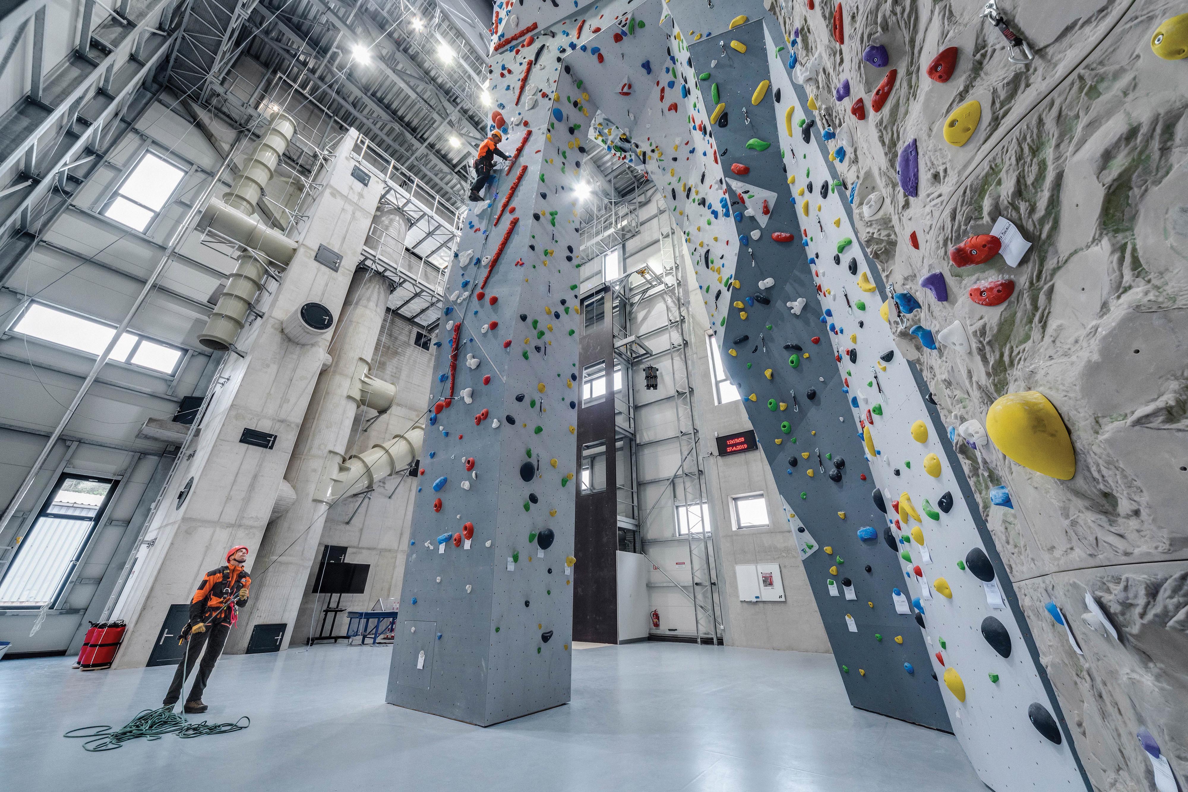 “Architektonický a projektový tým si vytkl za cíl respektovat jasně definovaný účel a z něho odvozené mimořádné rozměry a proporce objektu, na druhou stranu ale v žádném případě nerezignovat na architektonické řešení dominantního objektu,” hovoria autori. Z dominantného vertikálneho kvádra výcvikovej haly, je na nároží orientovanom k hlavnému vstupu do areálu výtvarne "odobratý" ostro rezaný objem. Takto komponované plochy z pohľadového betónu sú využité pre vonkajšiu lezeckú stenu, ktorá je tak zároveň jedným z najvýraznejších vonkajších indikátorov funkcie objektu.