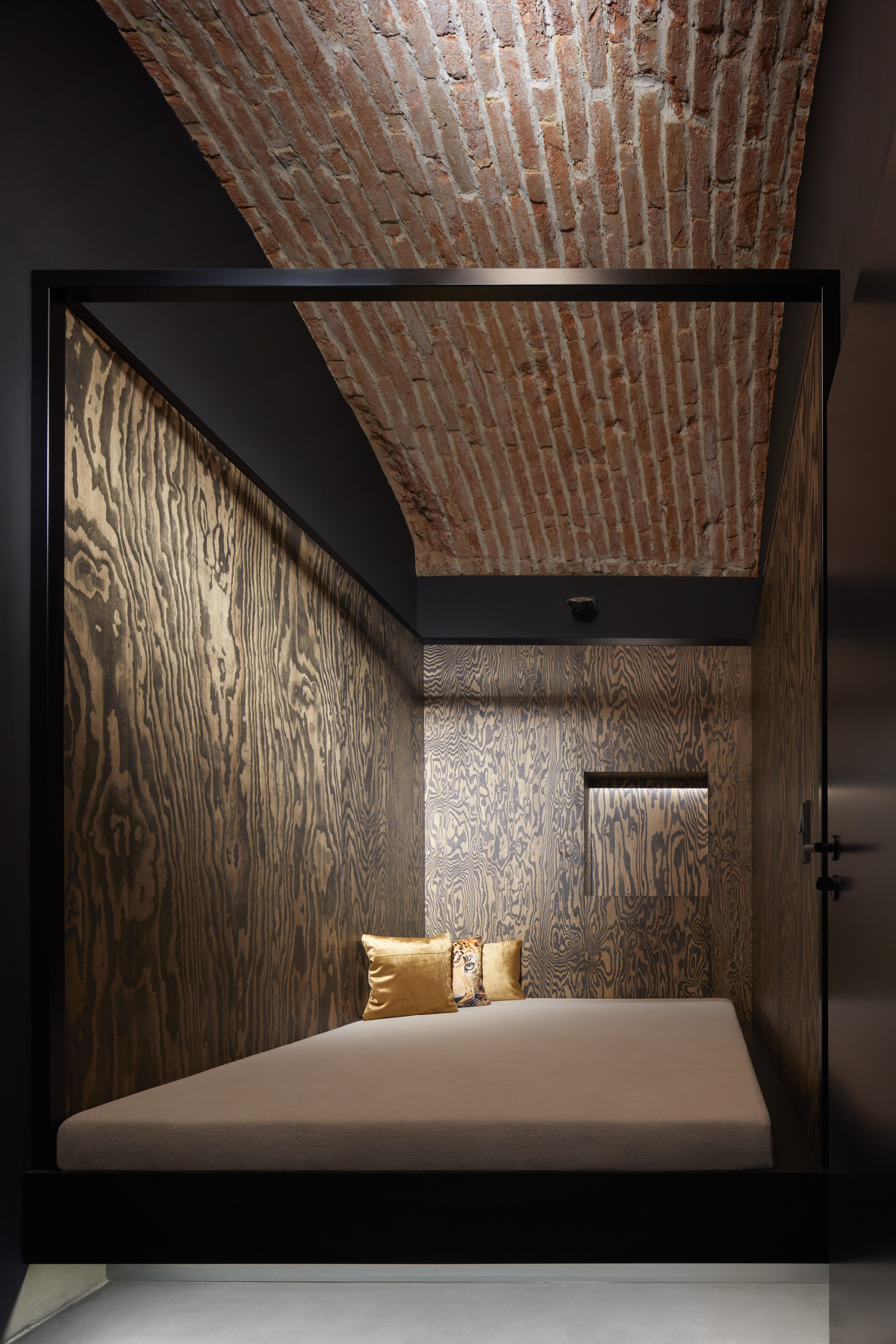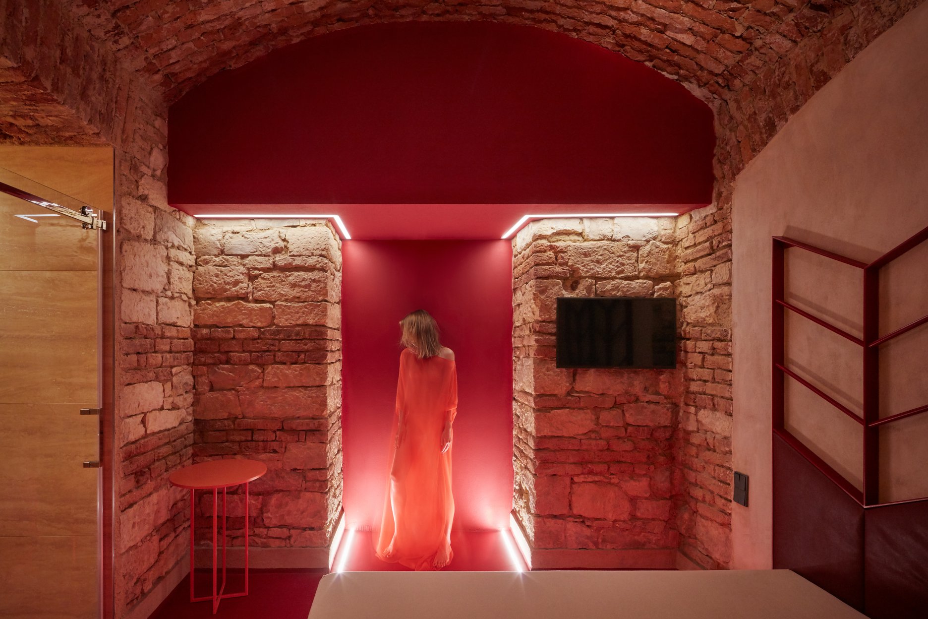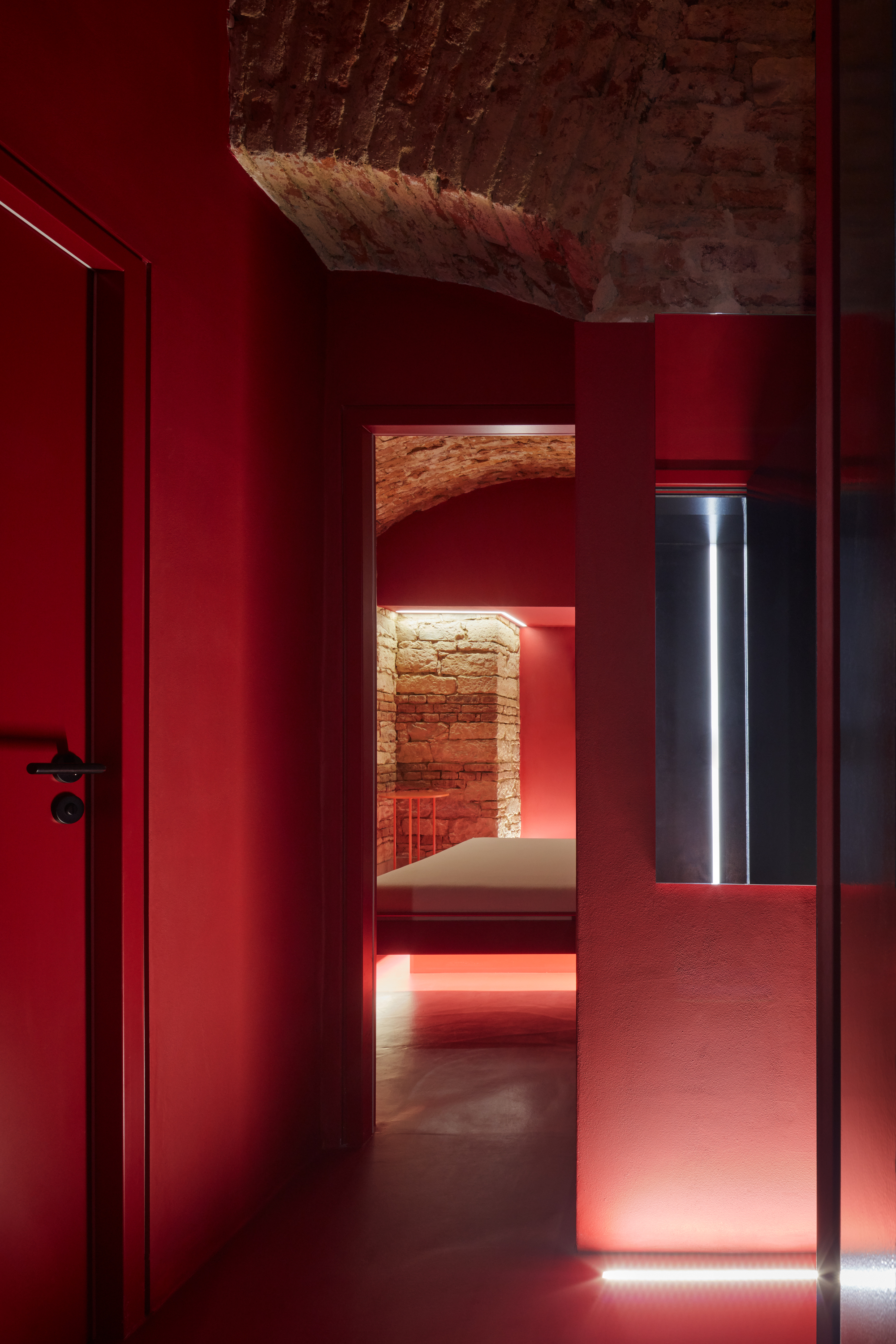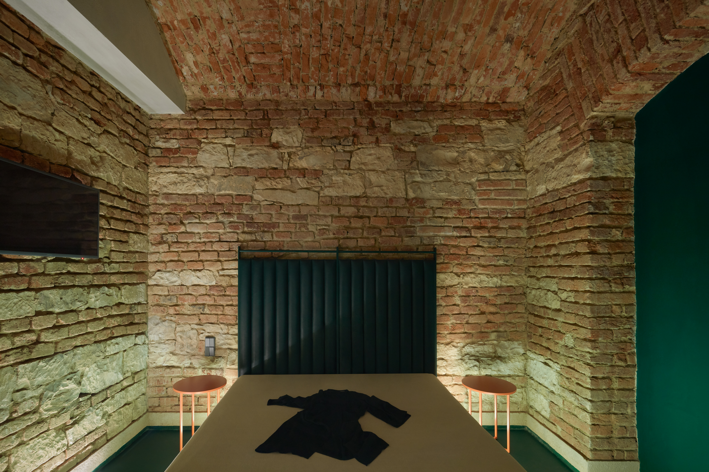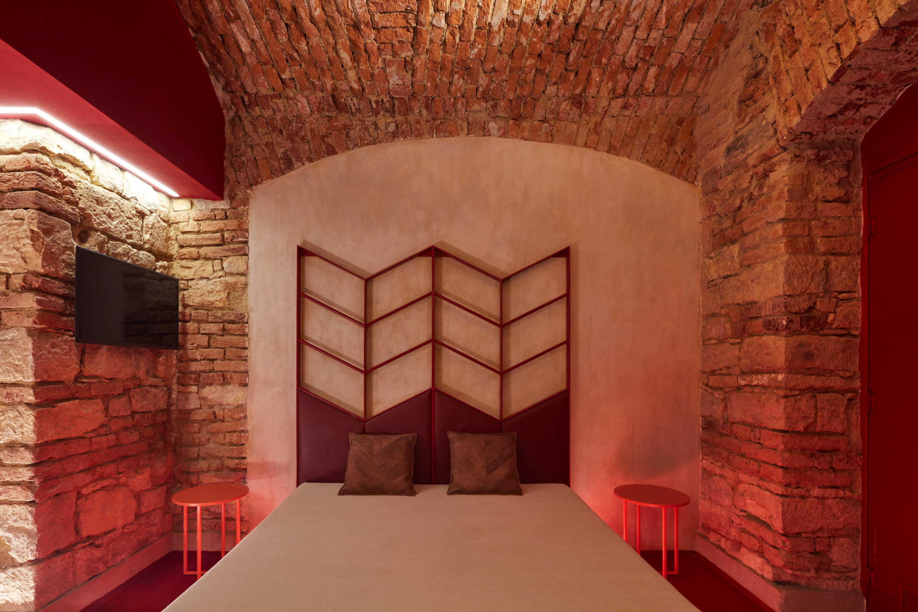 Lenka Míková: Osobně mě nejvíc baví ten červený pokoj a atmosféra, kterou ta barevnost, osvětlení a cihly vytvářejí. Jeden typ nasvícení jsme zvolili nepřímo odrazem od klenby, světlo má pak měkkou a příjemnou barvu i intenzitu a dělá příjemnou náladu, že si tam ani nepřijdete jako ve sklepě.. U vstupní části jsme se snažili o efektní nasvícení, co by člověka svým způsobem odstříhlo od světa venku, hledala se určitá adekvátní míra temnoty.. A důležitý byl taky pomyslný příběh - představit si děj a vytvořit si scénář, jak se návštěvník pohybuje a co zažívá už od vstupu z ulice až k samotné posteli.. :)
