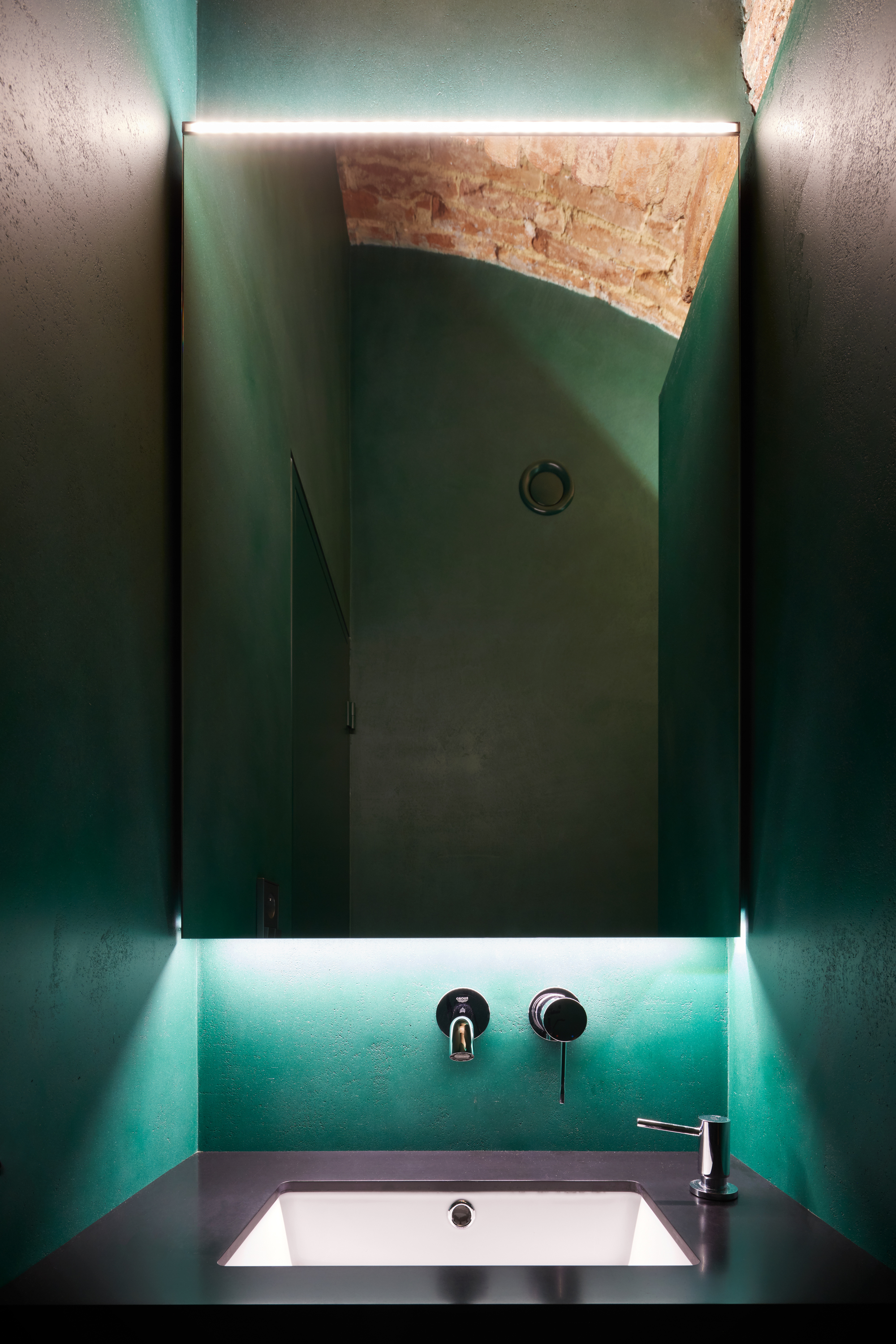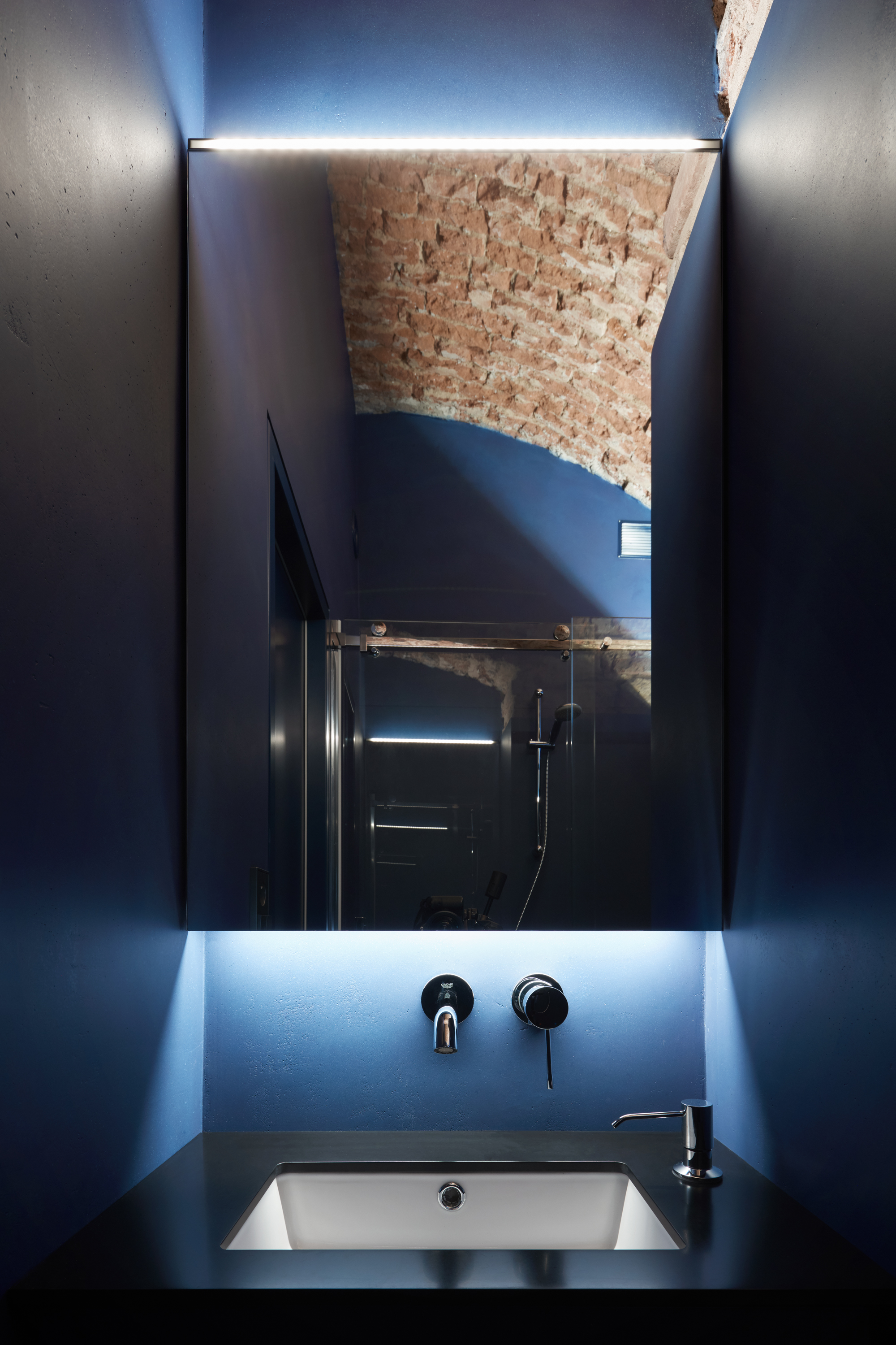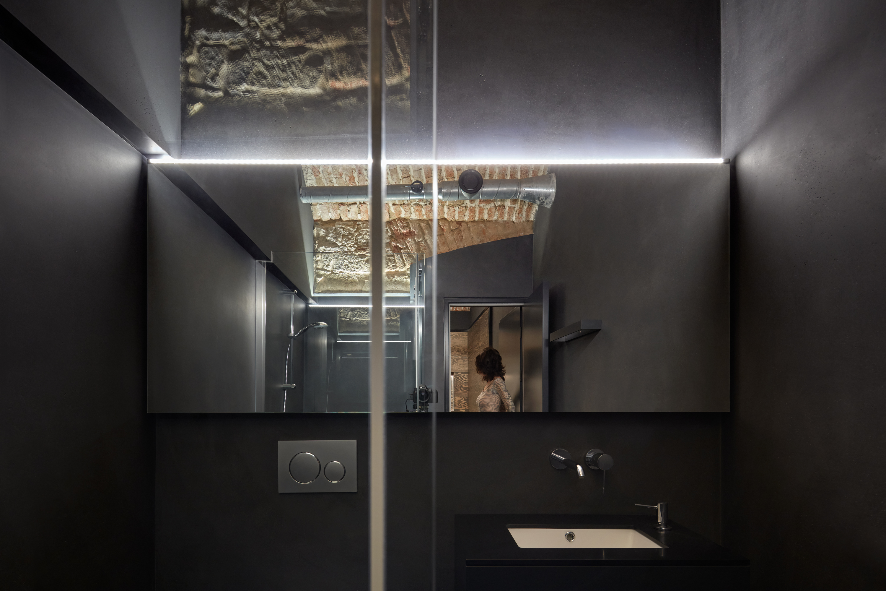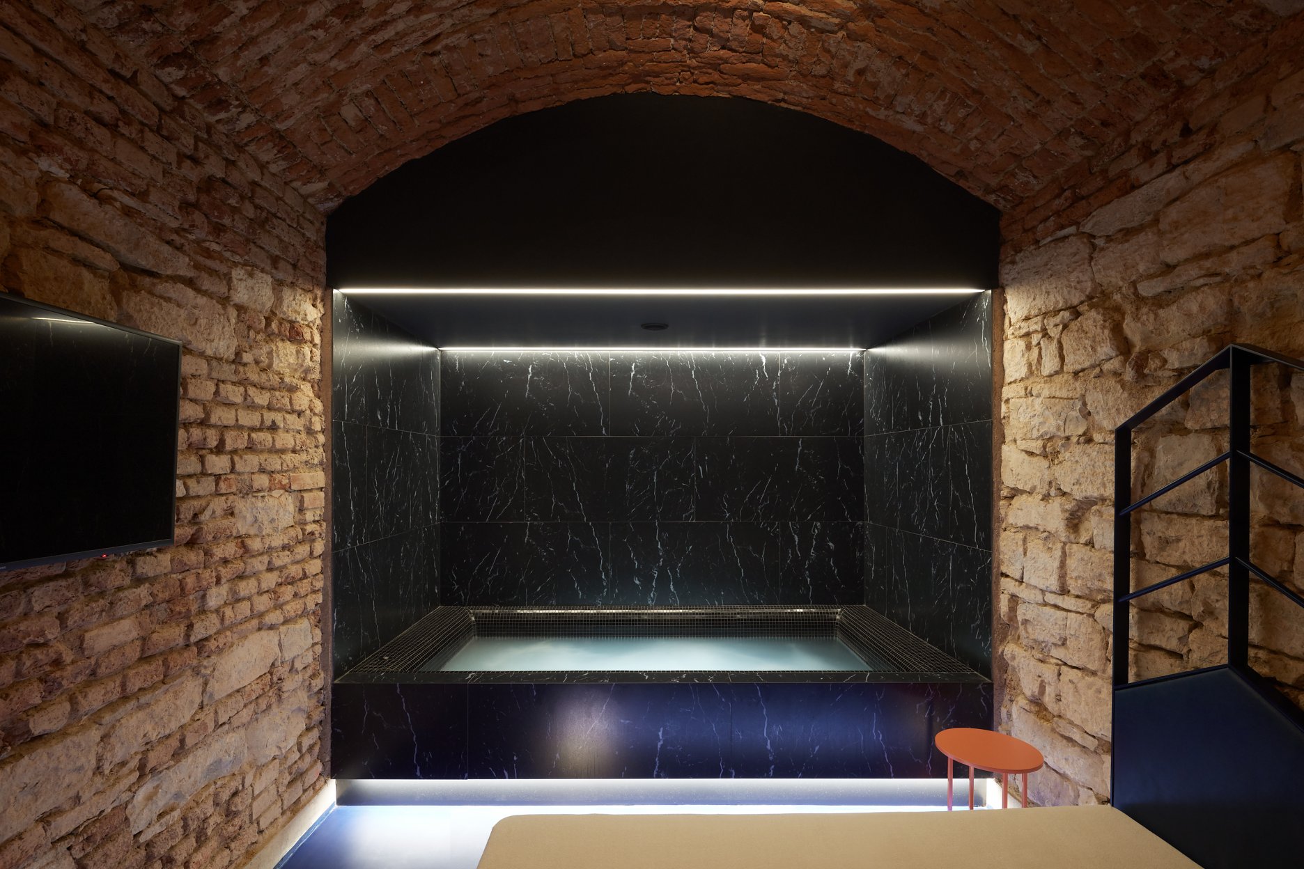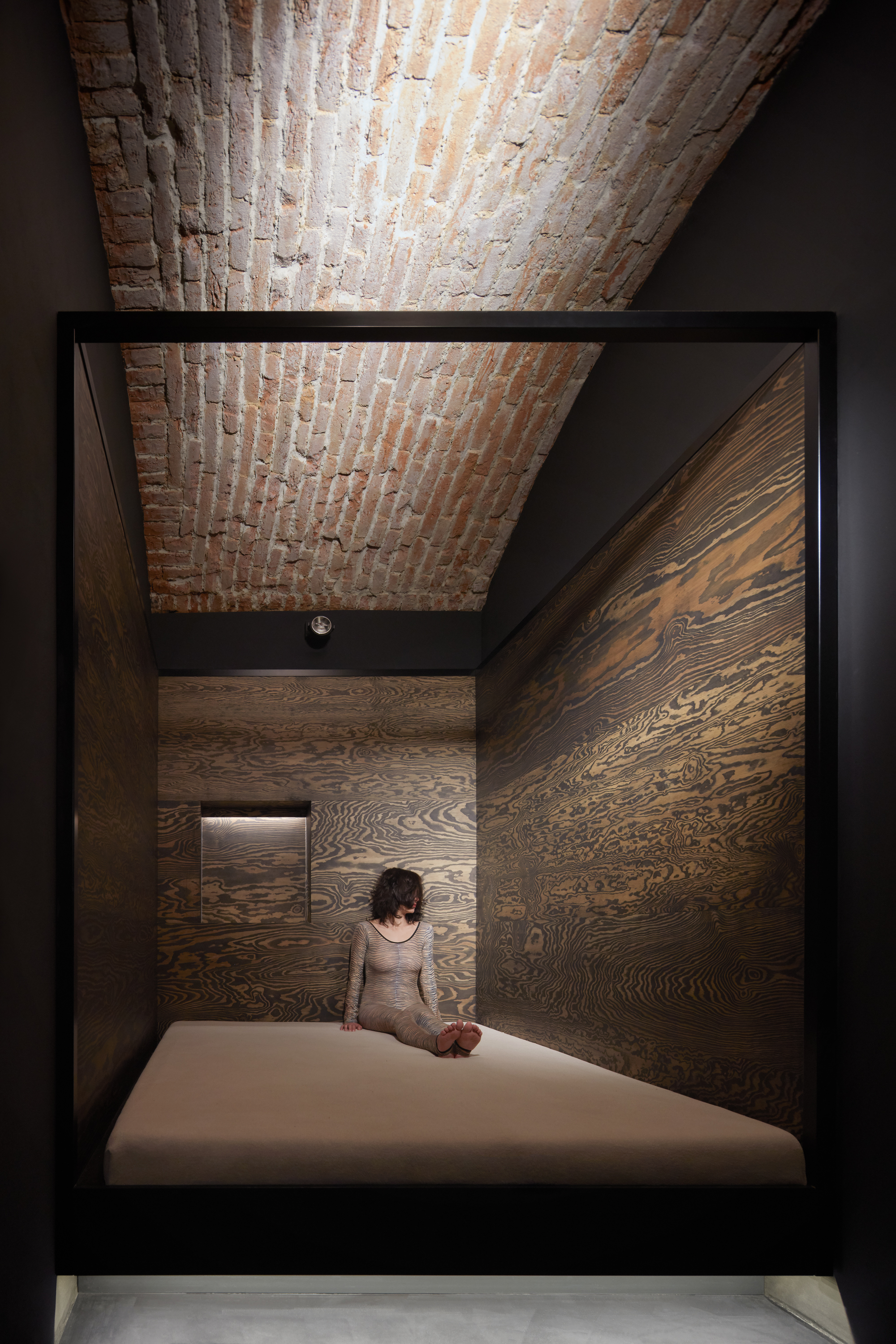 Lenka Míková: Osobně mě nejvíc baví ten červený pokoj a atmosféra, kterou ta barevnost, osvětlení a cihly vytvářejí. Jeden typ nasvícení jsme zvolili nepřímo odrazem od klenby, světlo má pak měkkou a příjemnou barvu i intenzitu a dělá příjemnou náladu, že si tam ani nepřijdete jako ve sklepě.. U vstupní části jsme se snažili o efektní nasvícení, co by člověka svým způsobem odstříhlo od světa venku, hledala se určitá adekvátní míra temnoty.. A důležitý byl taky pomyslný příběh - představit si děj a vytvořit si scénář, jak se návštěvník pohybuje a co zažívá už od vstupu z ulice až k samotné posteli.. :)