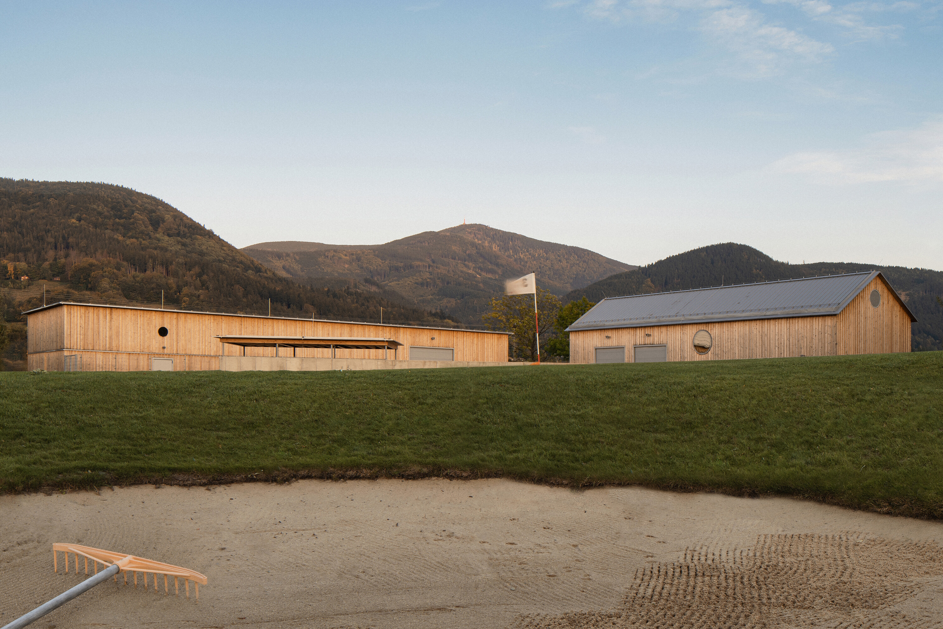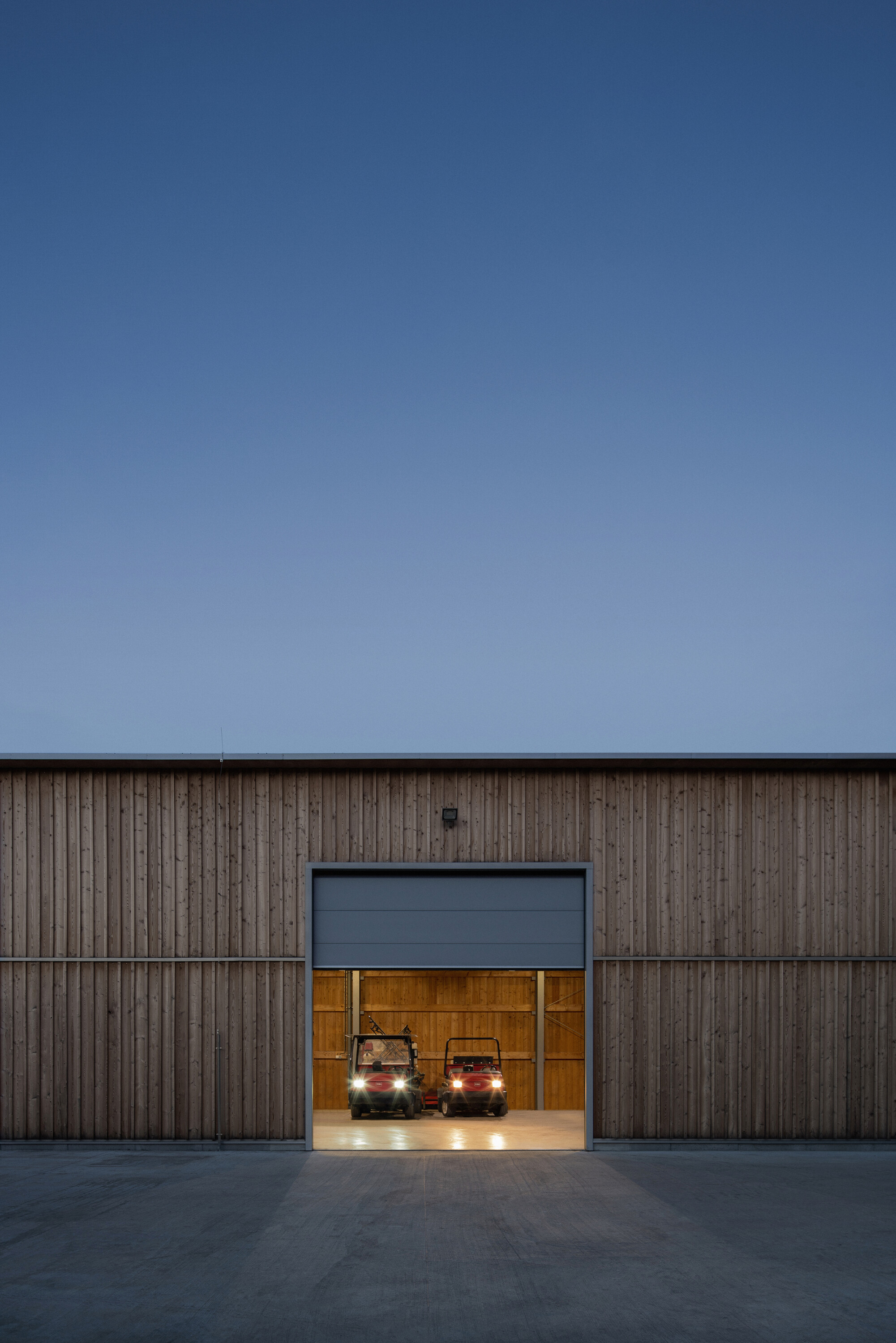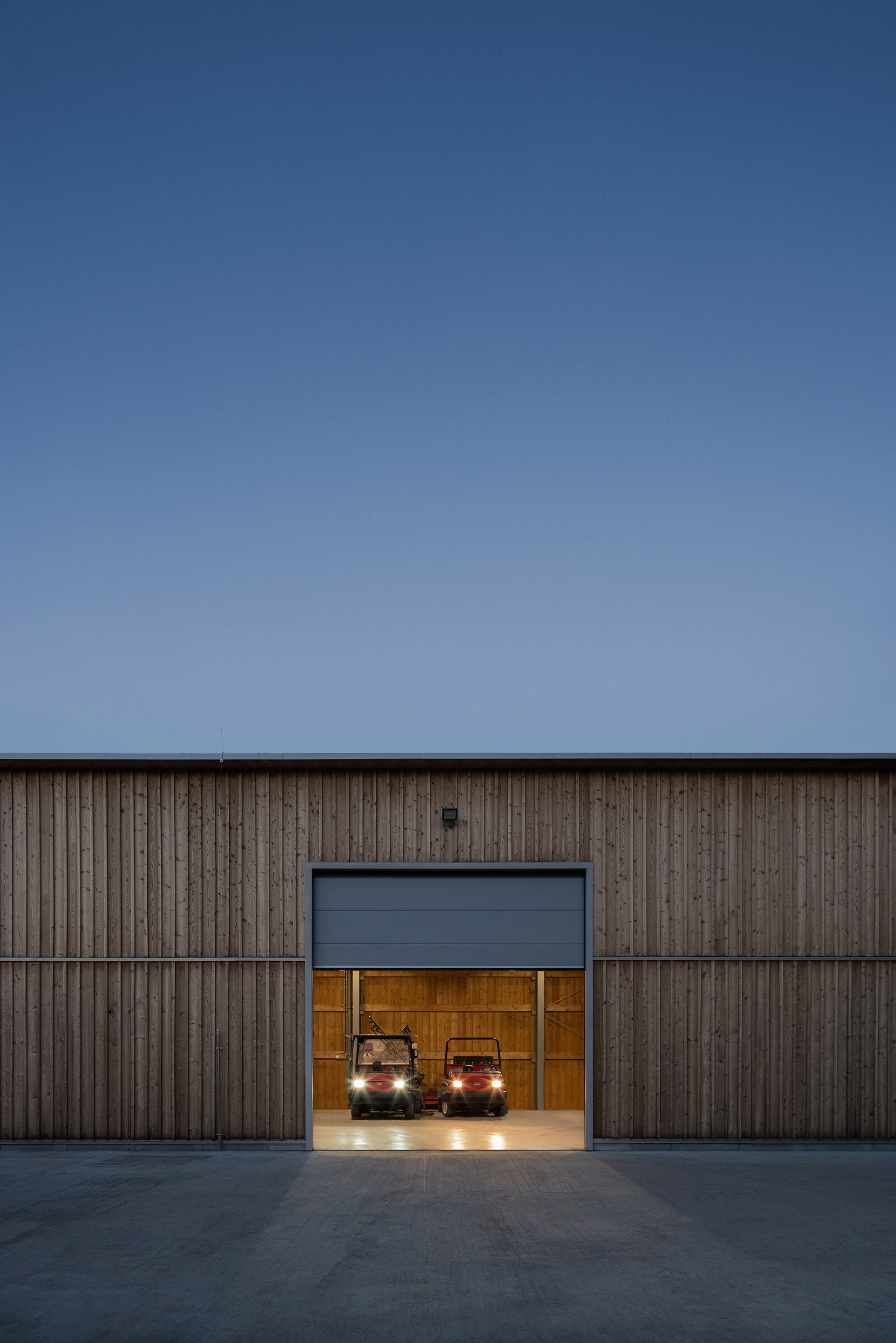 Prízemná nevykurovaná budova je určená na parkovanie strojov starajúcich sa o celý golfový rezort. Utilitárny oceľový skelet opäť humanizuje smrekovcová fasáda.