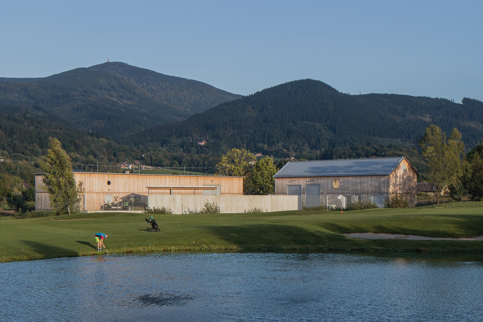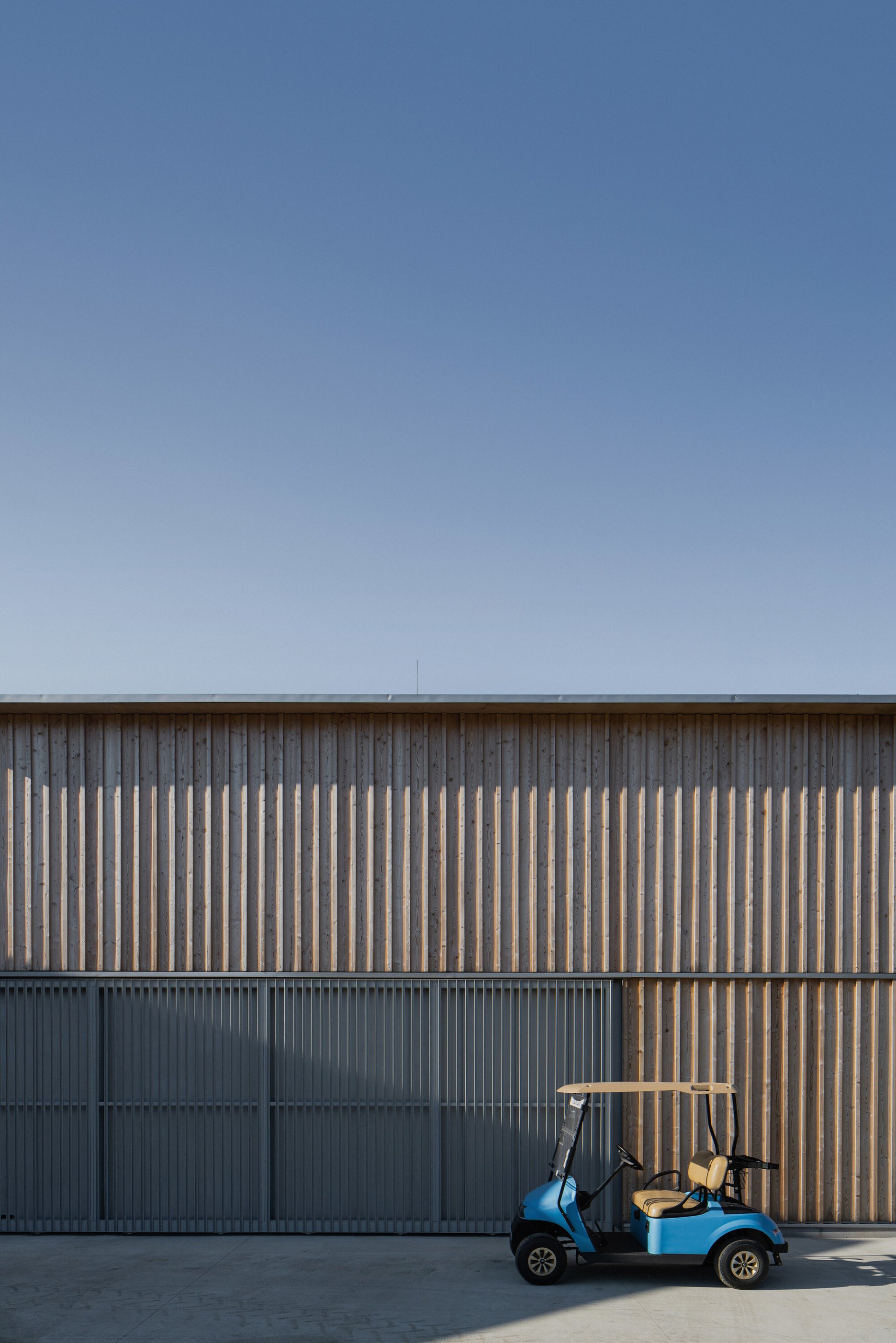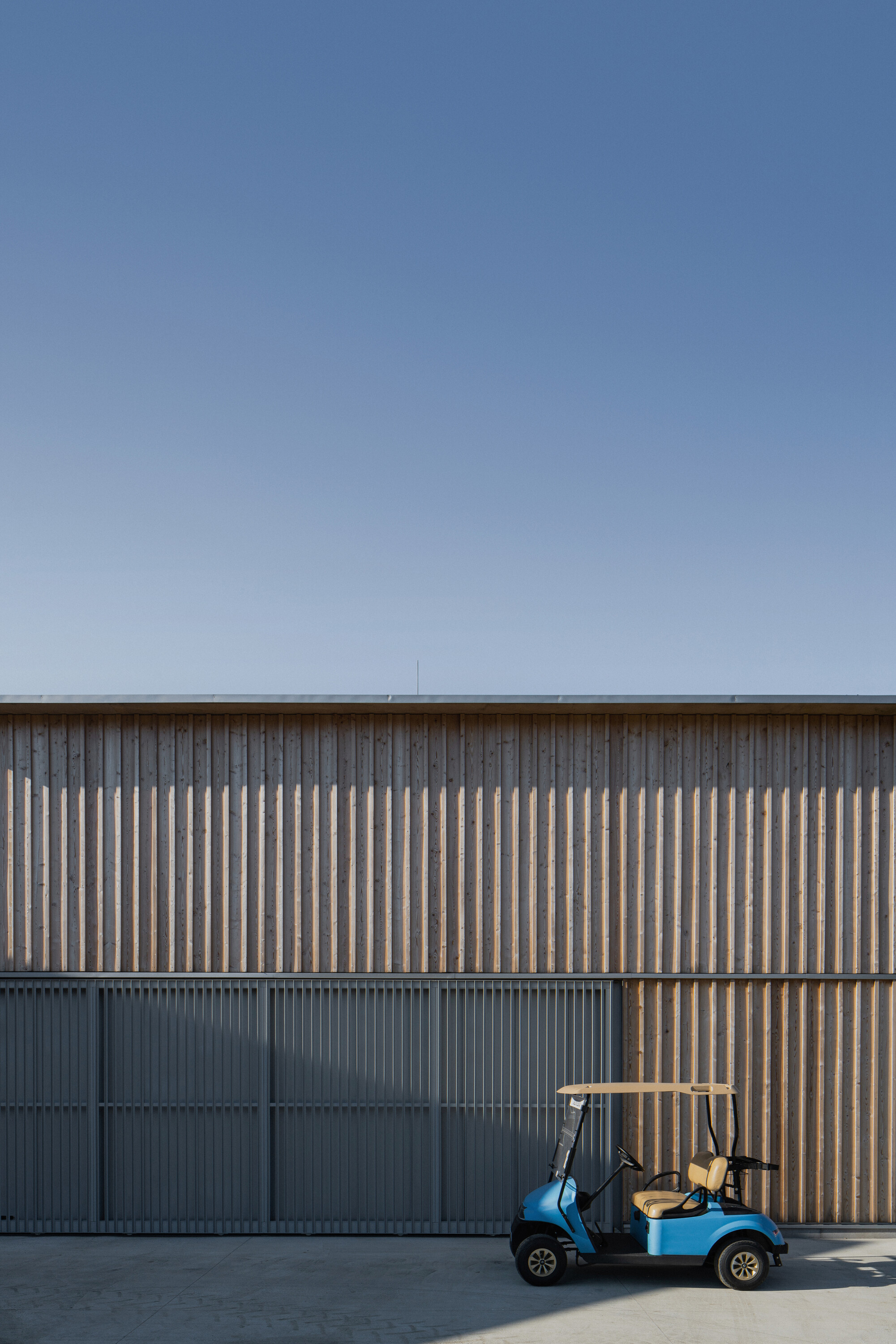 Prízemná nevykurovaná budova je určená na parkovanie strojov starajúcich sa o celý golfový rezort. Utilitárny oceľový skelet opäť humanizuje smrekovcová fasáda.