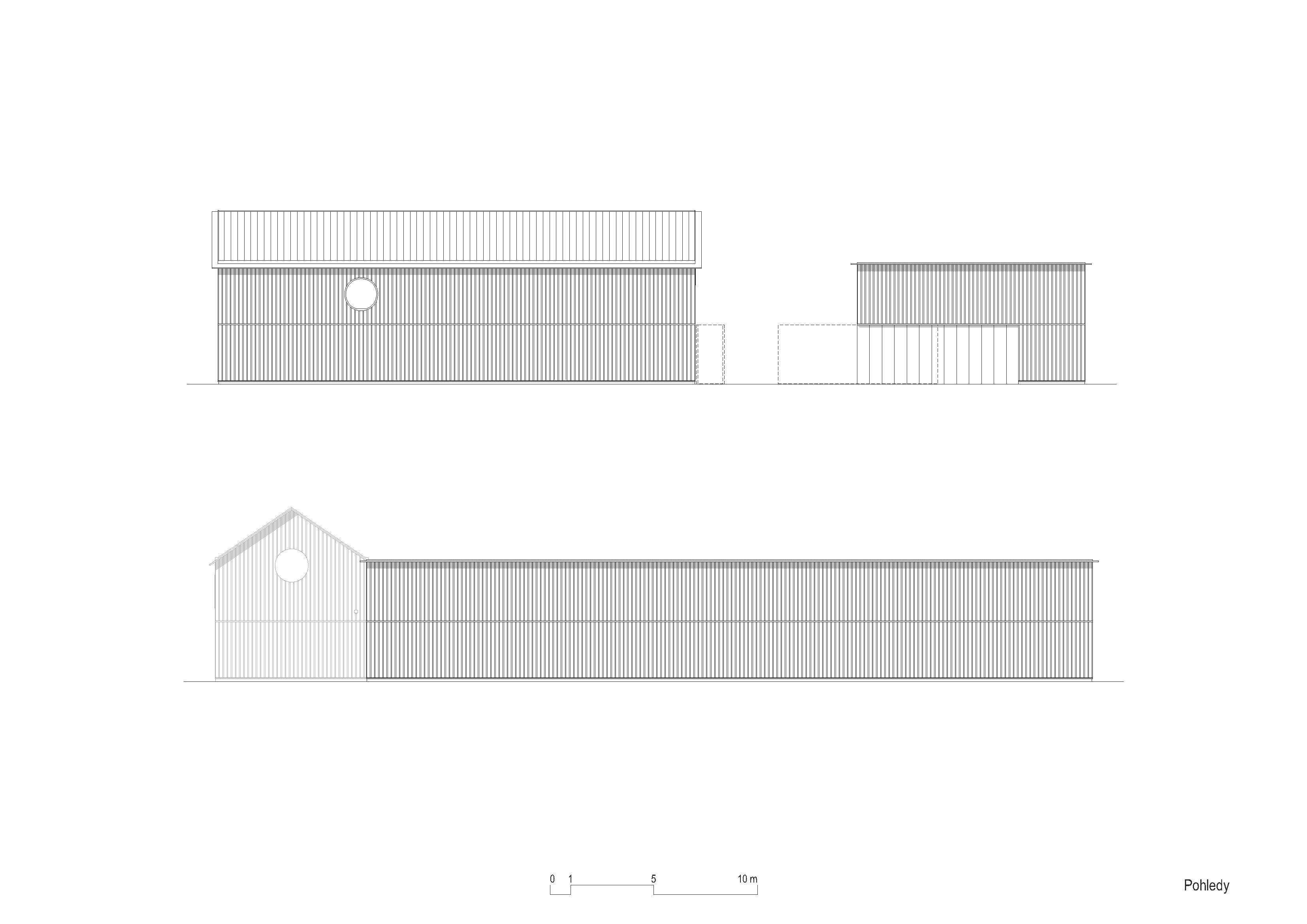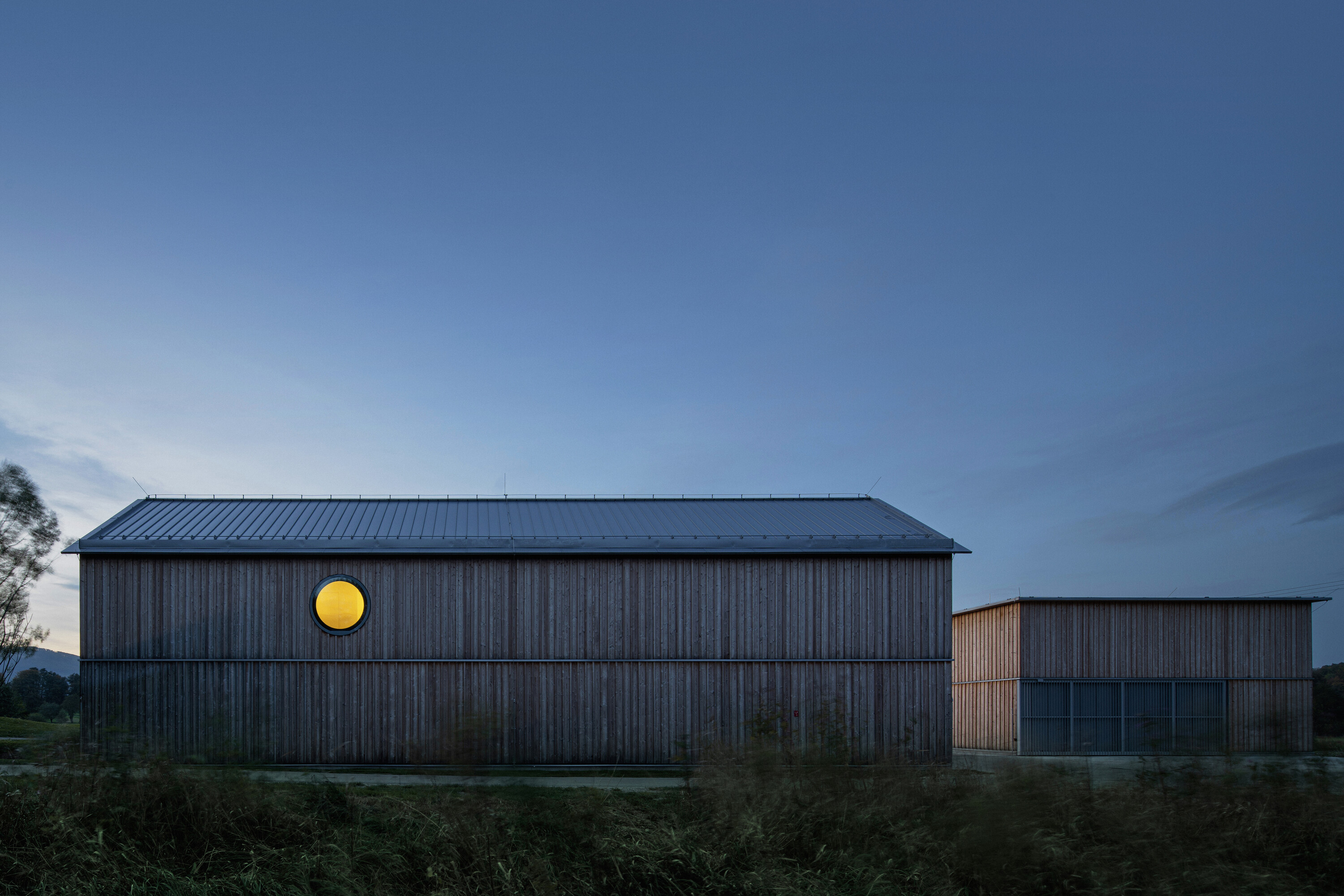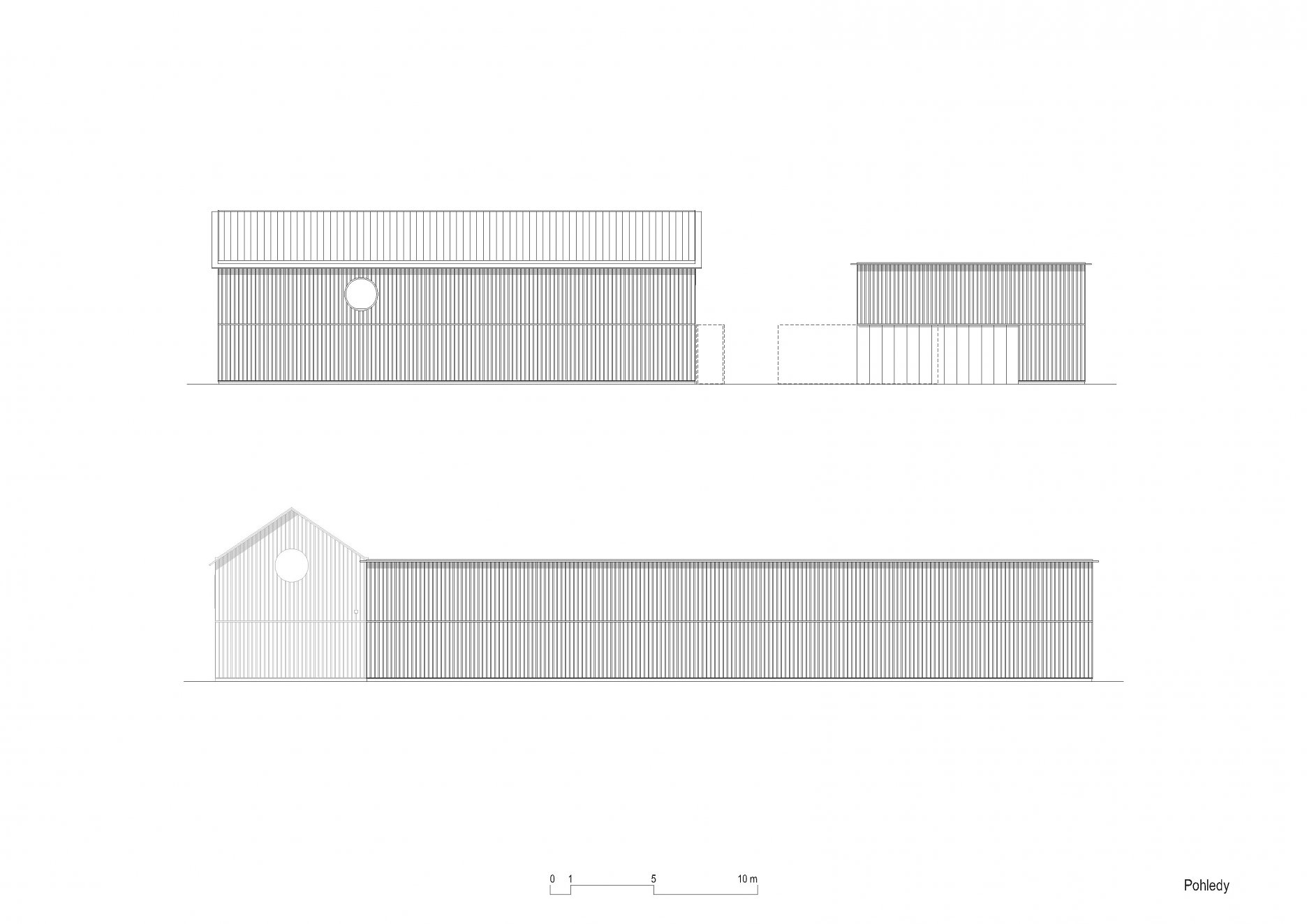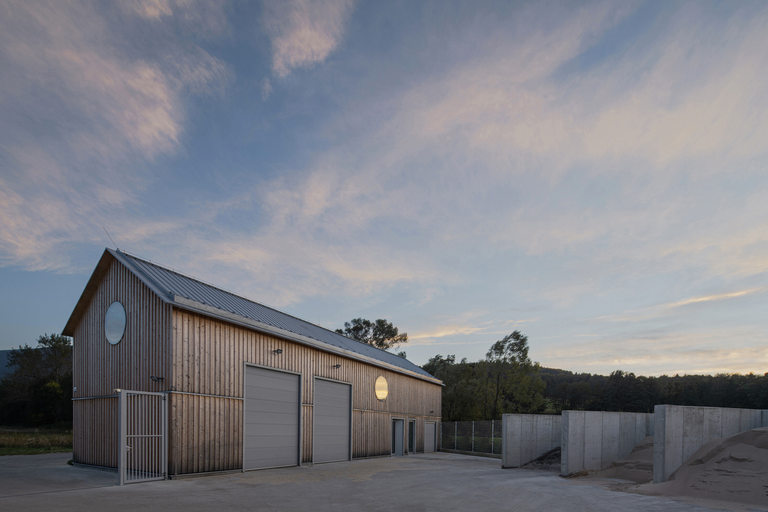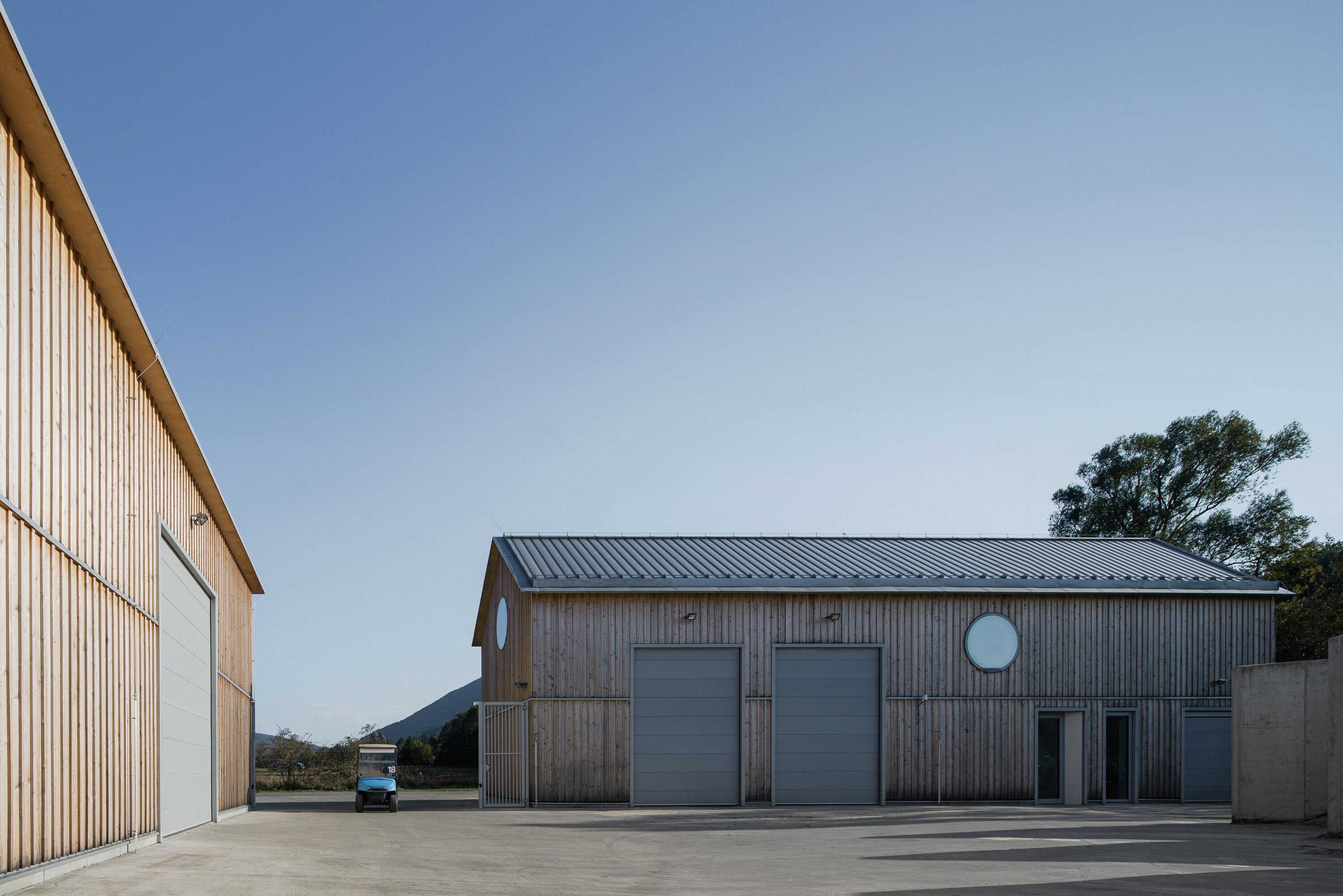 “Z původního očekávání hospodářského zázemí ve standardu plechové skladovací haly se tak úvahy o estetice stavby, jejím členění, a v neposlední řadě o vztahu k širšímu okolí začaly ubírat jiným směrem. Naším záměrem bylo přispět ke kultivaci výstavby v této krajině a to konkrétně použitím měřítka a estetiky, která z ní vychází,” približujú architekti svoj zámer a genézu projektu.