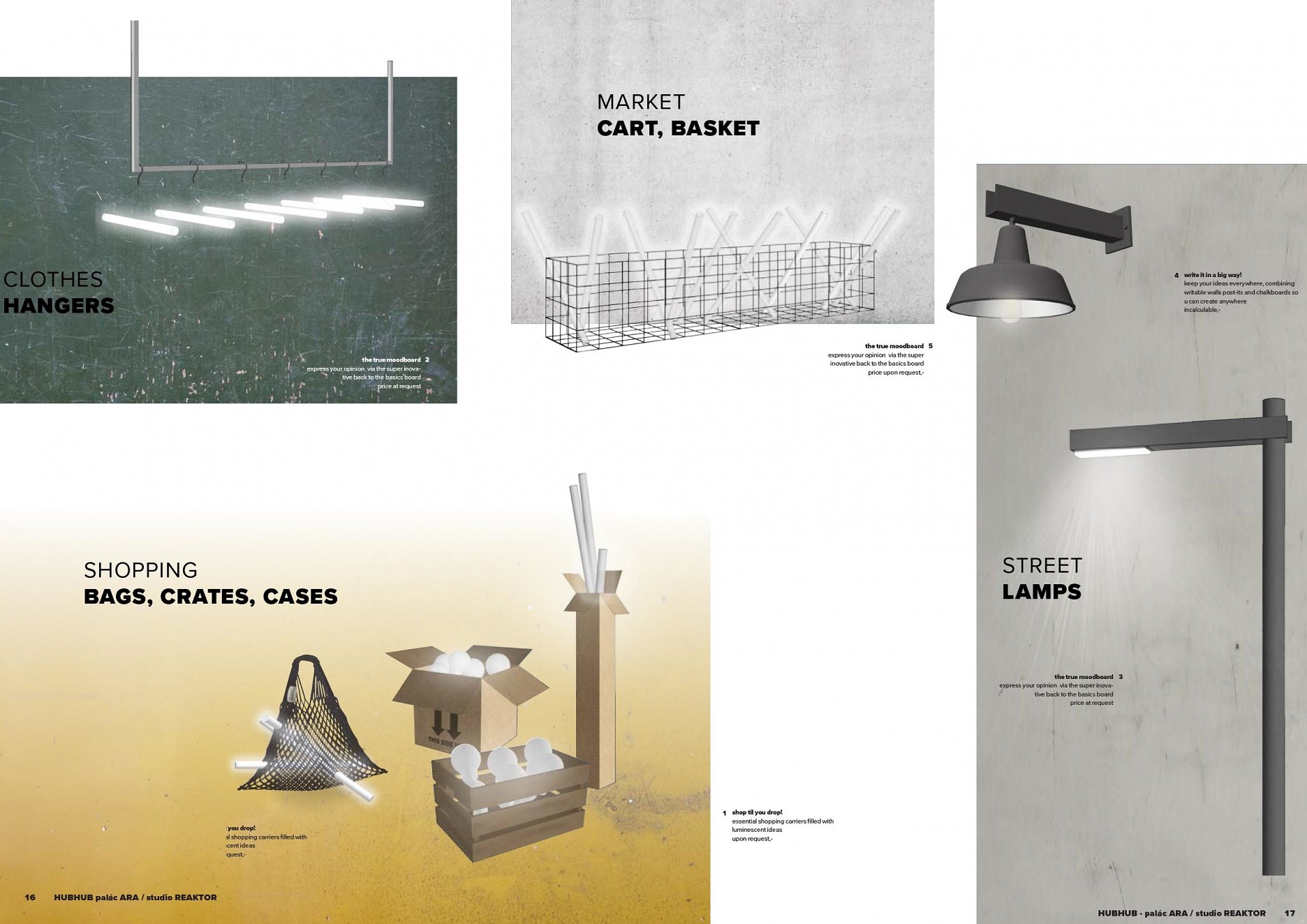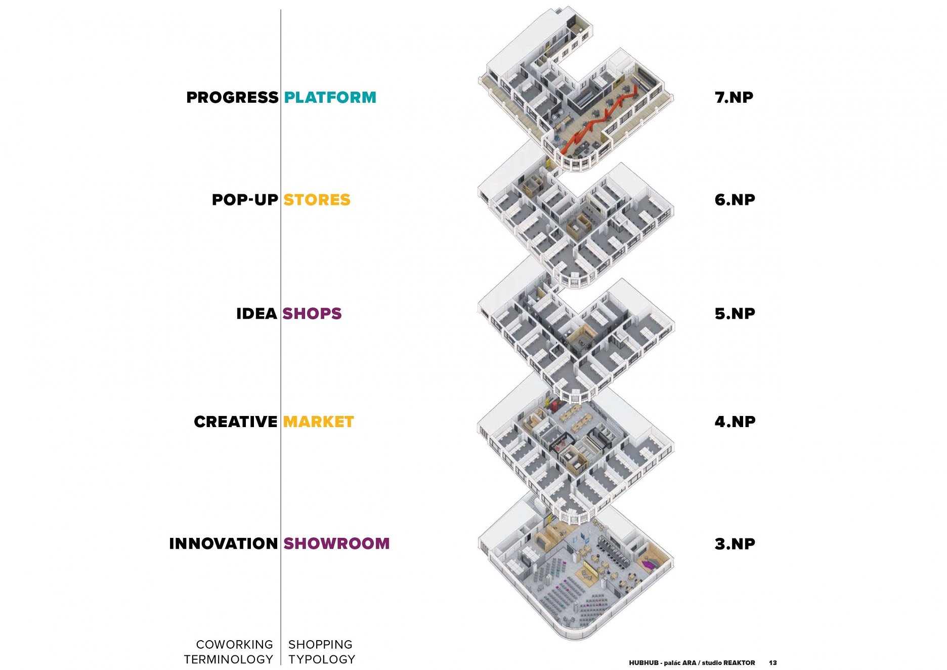 "Hlavním konceptem pro využití nového coworkingového prostoru paláce ARA se tak stalo navázání na typologii obchodního domu, takzvaného Mallu, ve kterém se jako hlavní artikl nabízejí moderní, nehmotné produkty - nápady, ideje, myšlenky, inovace, talent,” vysvetľujú architekti.