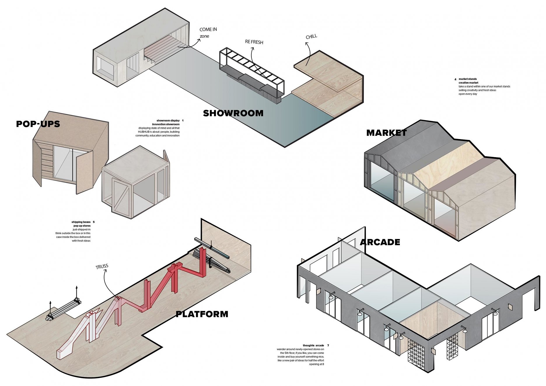Každé poschodie je preto pomenované podľa rozdielneho typu obchodnej prevádzky - showroom, trh, arkáda, “pop-ups”, obchody a platforma. Spomínané ústredné priestory tvoria rokovacie stoly, relax zóny a konferenčné miestnosti. Ostatné časti interiéru sú materiálovo a farebne zjednotené.