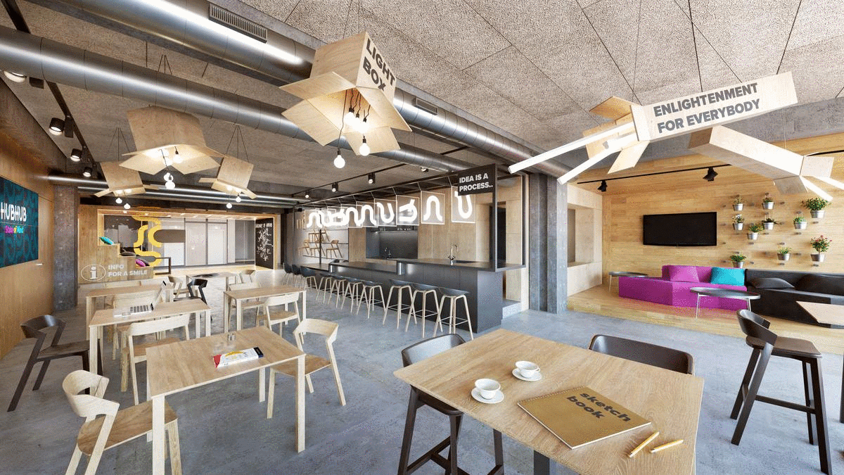 “Nároží, celoplošné stěny a místa setkávání jsou osvěžena drobnými hravými prvky jako popisovatelné stěny, popelnice s osvěžením a kancelářskými dopravními prostředky (skateboard, koloběžka). Volné stěny jsou věnovány místním umělcům, nápadům vycházejícím z řad členů Hubhub. V žádném obchodním domě nesmí chybět dětský koutek s kuličkami!” dopĺňajú na záver architekti.