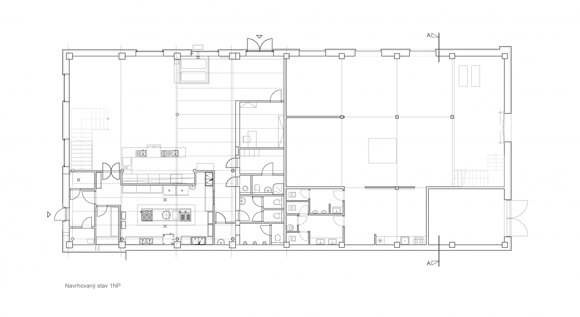 Rekonštrukcia nezasiahla do nosnej konštrukcie objektu. Pôvodné nosné murivo - murované piliere v obvodových stenách - je zo strany interiéru priznané, rovnako ako oceľová väzníková sústava strešnej konštrukcie. Medzi zaujímavosti patrí zachovaný otvorený výťah, prechádzajúci v centrálnej polohe vloženým podlažím. Z bočnej strany priestor presvetľujú zachované okenné výplne, prechádzajúce cez obe podlažia.