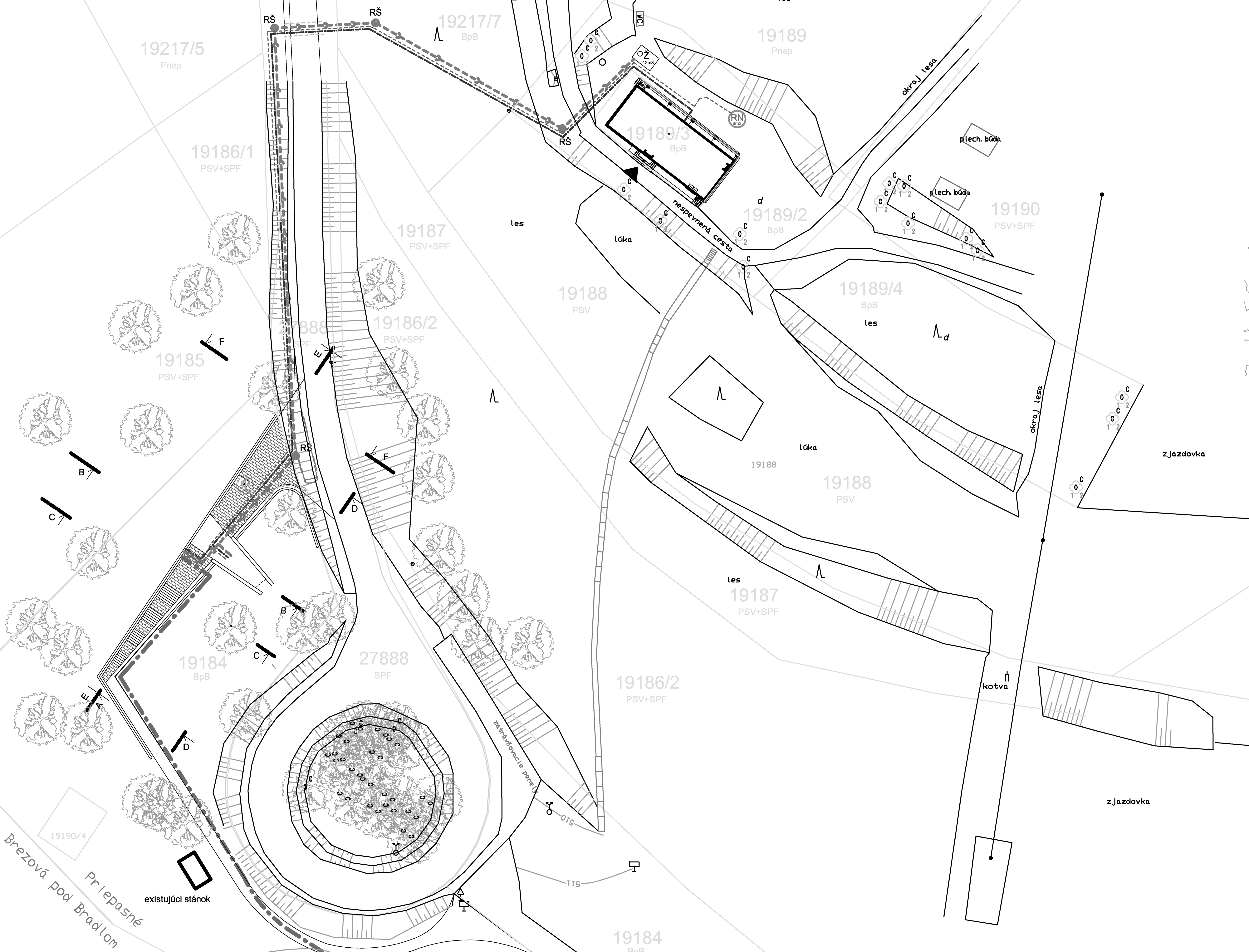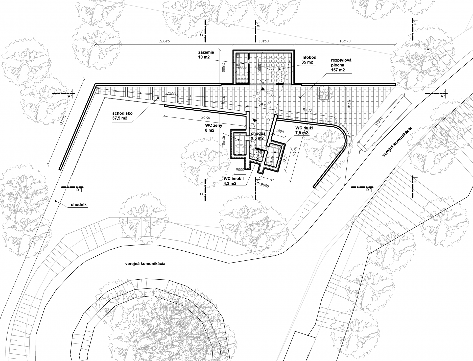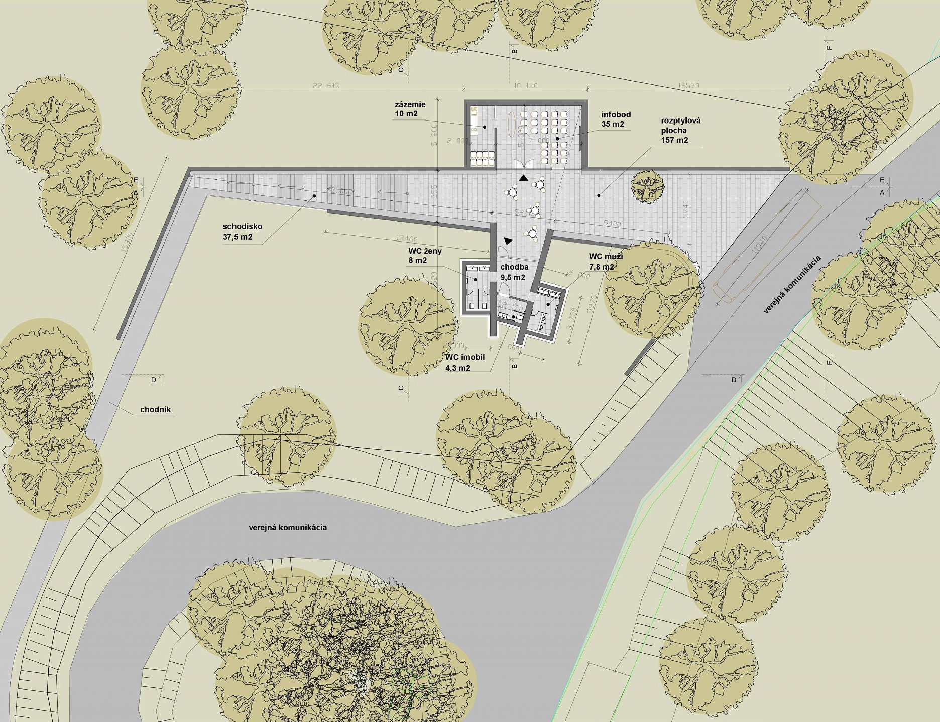 Podzemná stavba, s dvoma k sebe navzájom orientovanými fasádami, je osadená v komplikovanom svahovitom teréne. Objekt s maximálnymi vonkajšími rozmermi 37,25 x 19,8 m je z východnej, južnej a západnej strany kompletne zapustený v zemi. Jediným viditeľným prvkom je betónové zábradlie ako súčasť východnej fasády a dve betónové steny, ohraničujúce vstup do WC. Všetky vyčnievajúce konštrukcie budú v budúcnosti prekryté popínavou zeleňou tak, aby objekt splynul s okolitým terénom a zeleňou.