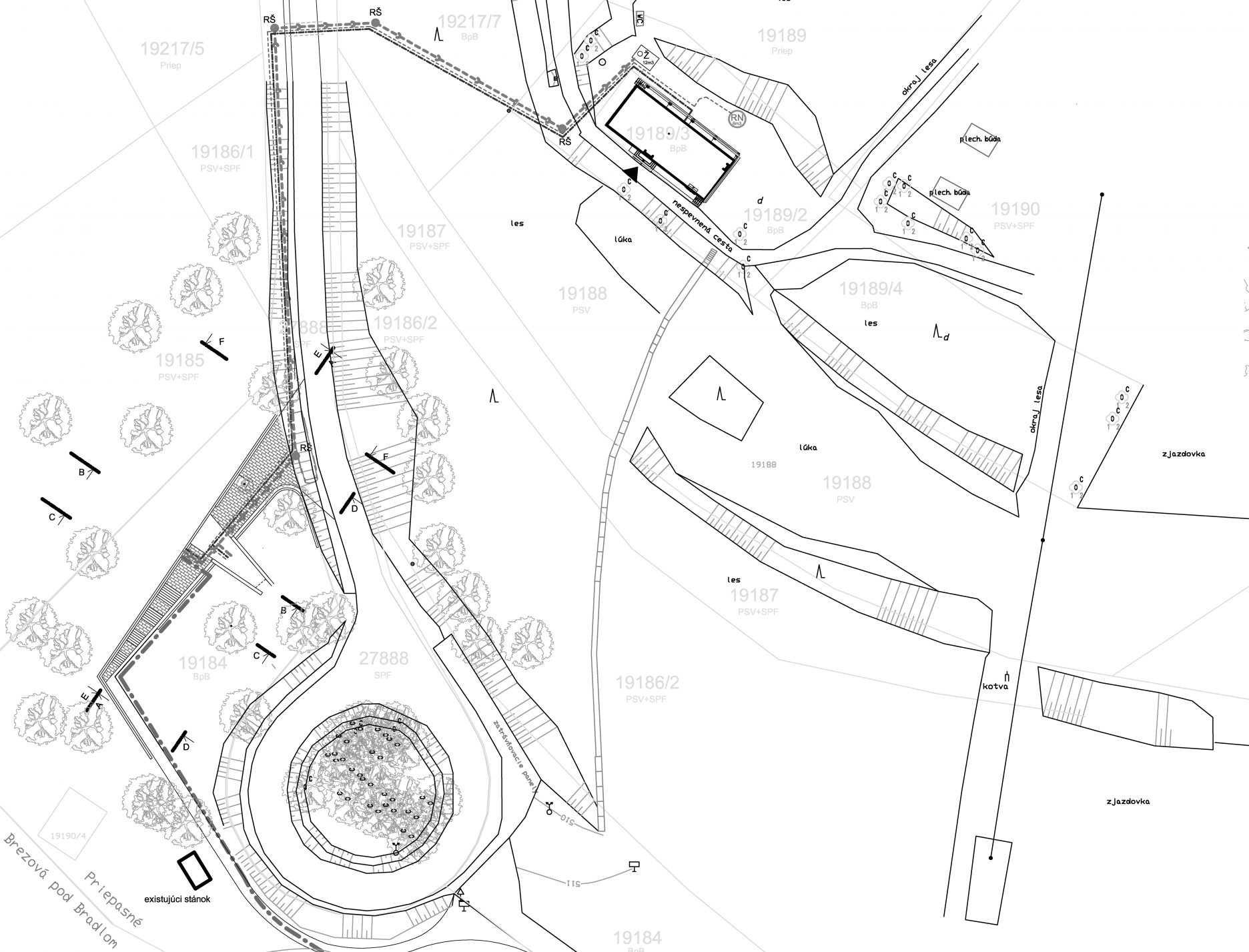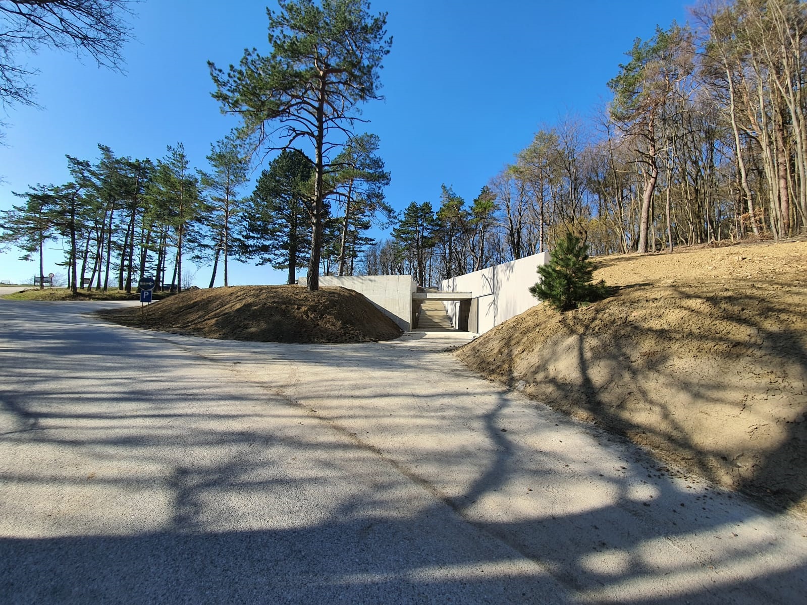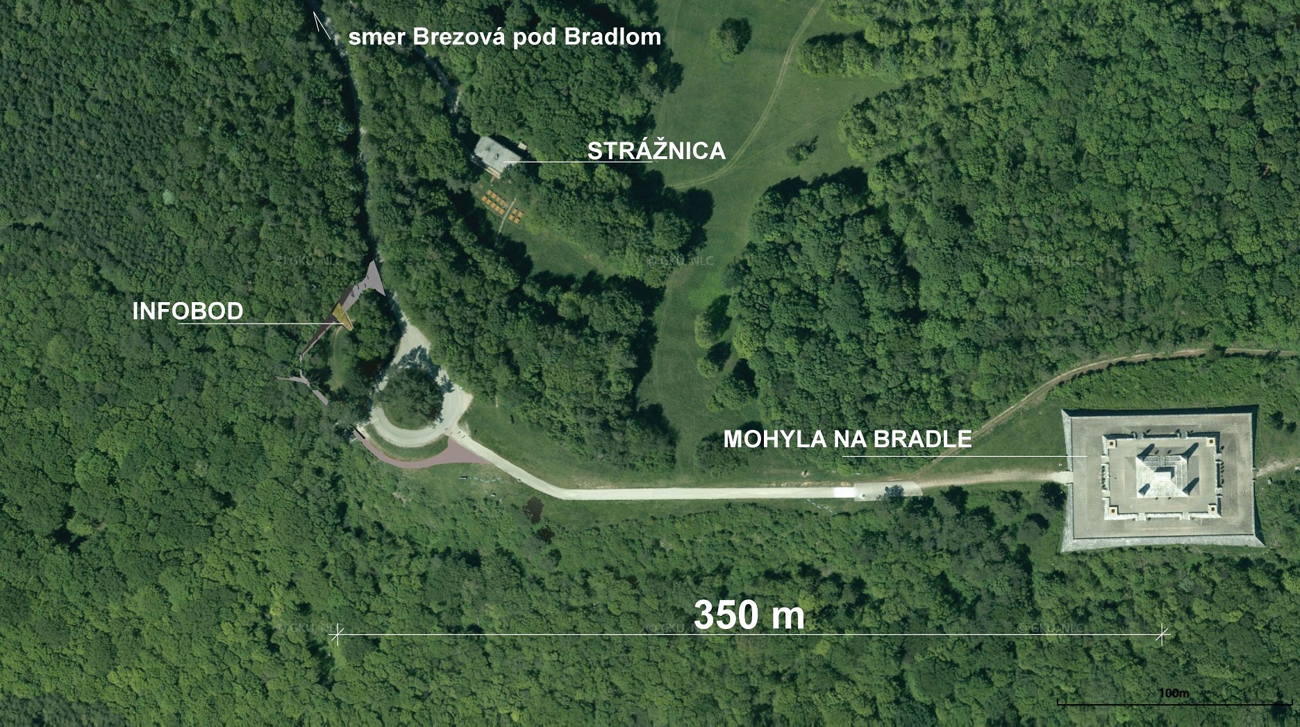 Vstup zo severnej strany je orientovaný do rozptylového priestoru infobodu. Je to jediná pohľadová os, z ktorej je objekt vnímateľný a čitateľný. Mlatovú pochôdznu plochu rozptylového priestoru dopĺňa dlažba z prírodného vibrovaného betónu s formátom 300 x 600 mm. Na ňu nadväzuje schodisko z monolitického betónu, prepájajúce výškovú úroveň príjazdovej cesty a infobodu s mlatovým chodníkom nadväzujúcim na samotnú prístupovú cestu k pamätníku. Infobod bude dopravne napojený na príjazdovú komunikáciu k areálu Bradla.