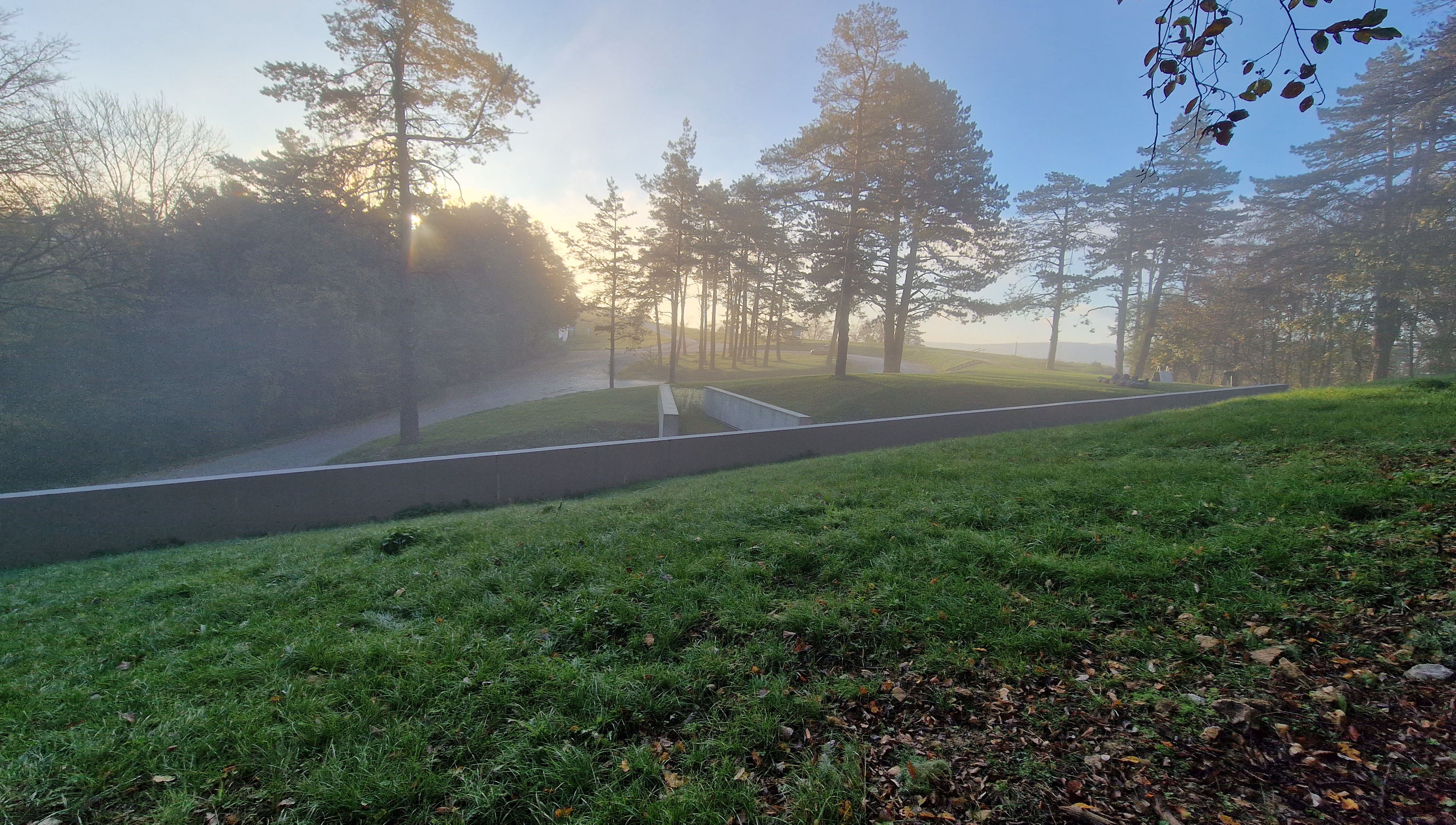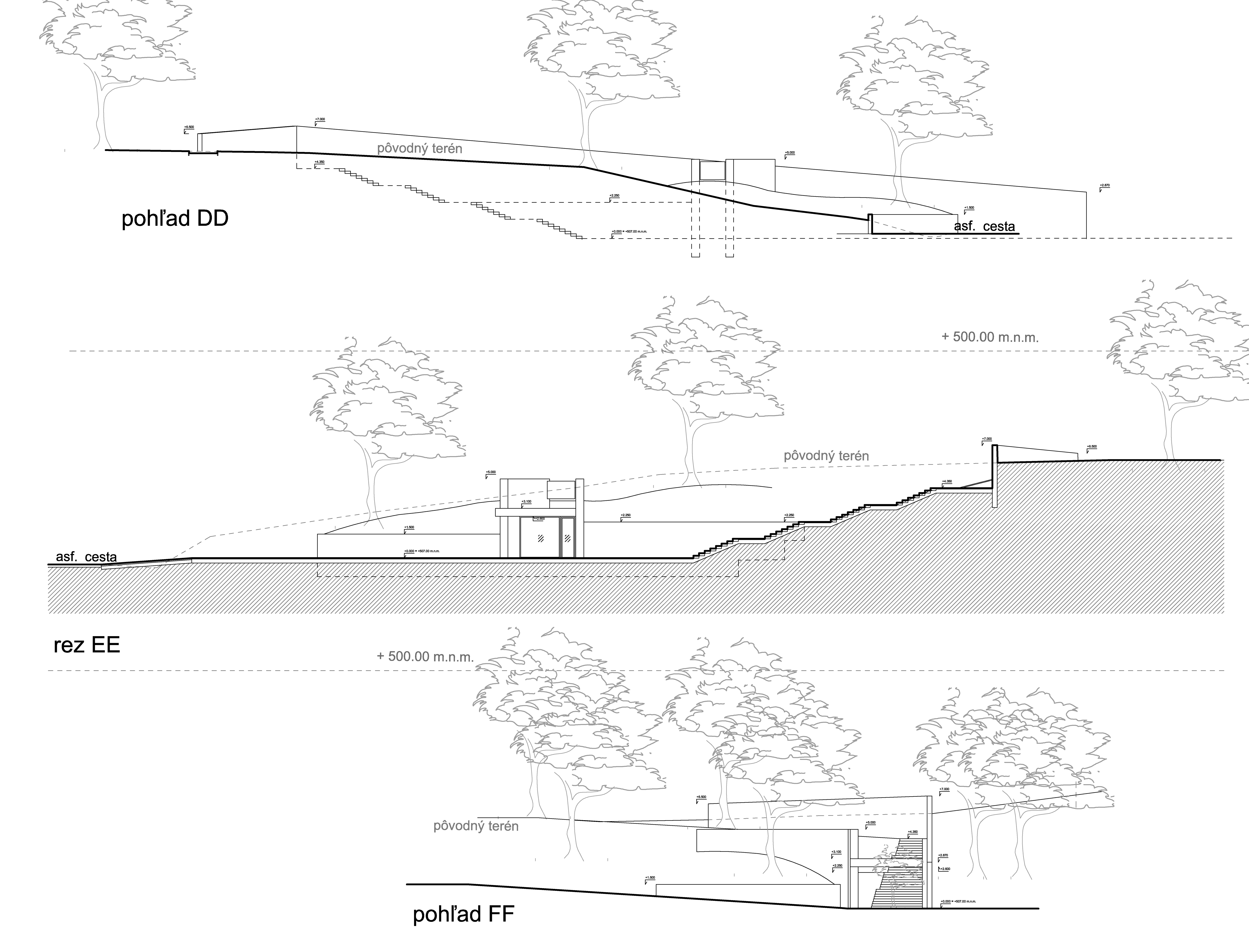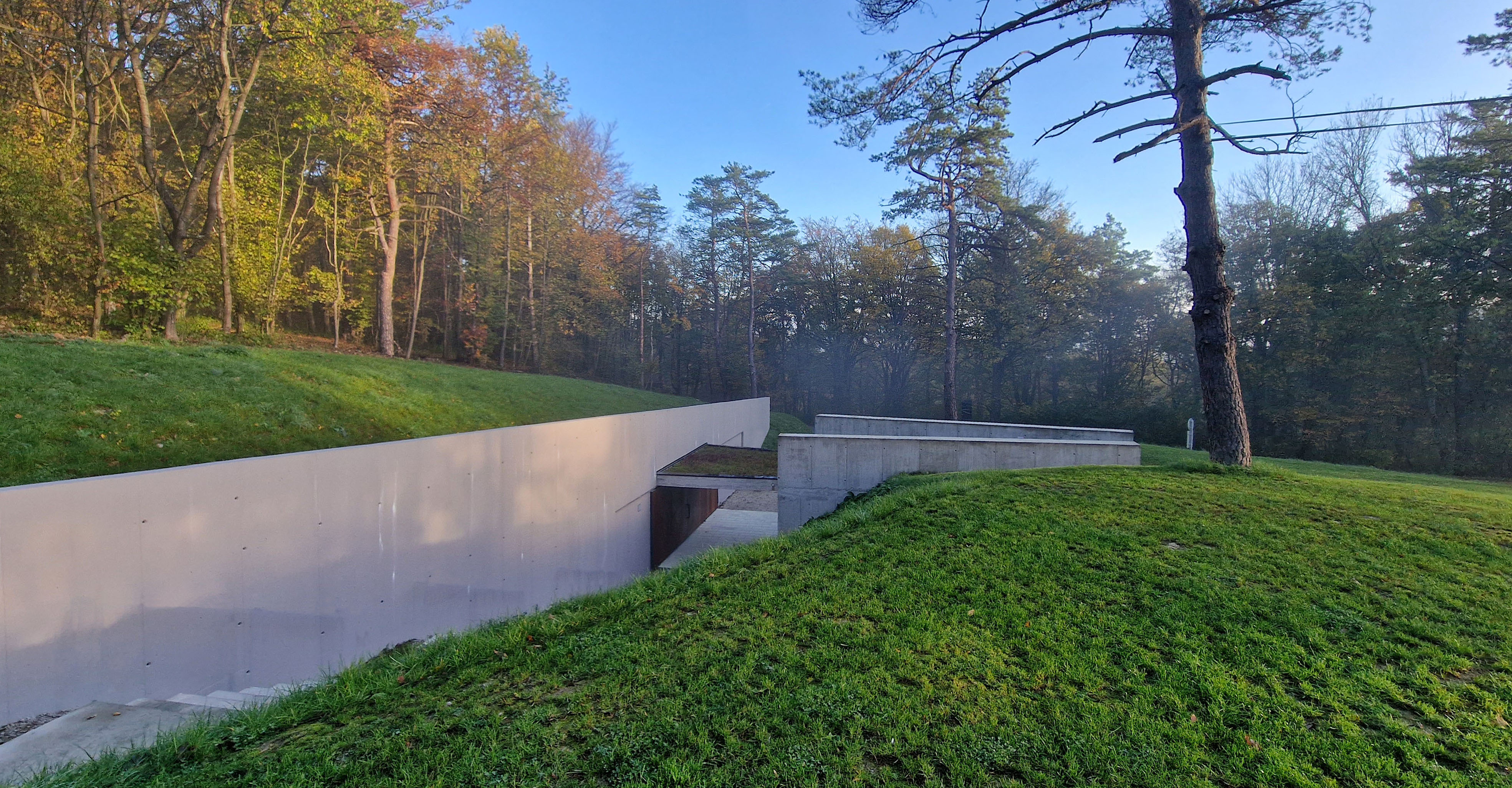 Z tohto pohľadu stavba nie je hotová. Finálne dokorodovanie cortenových prvkov, prirodzeného vplyvu prírody a času na liate betónové steny a hlavne dorastenie popínavej zelene padajúcej cez východnú fasádu naplní pôvodnú filozofiu stavby, ktorou je splynutie stavby s okolitým lesom.