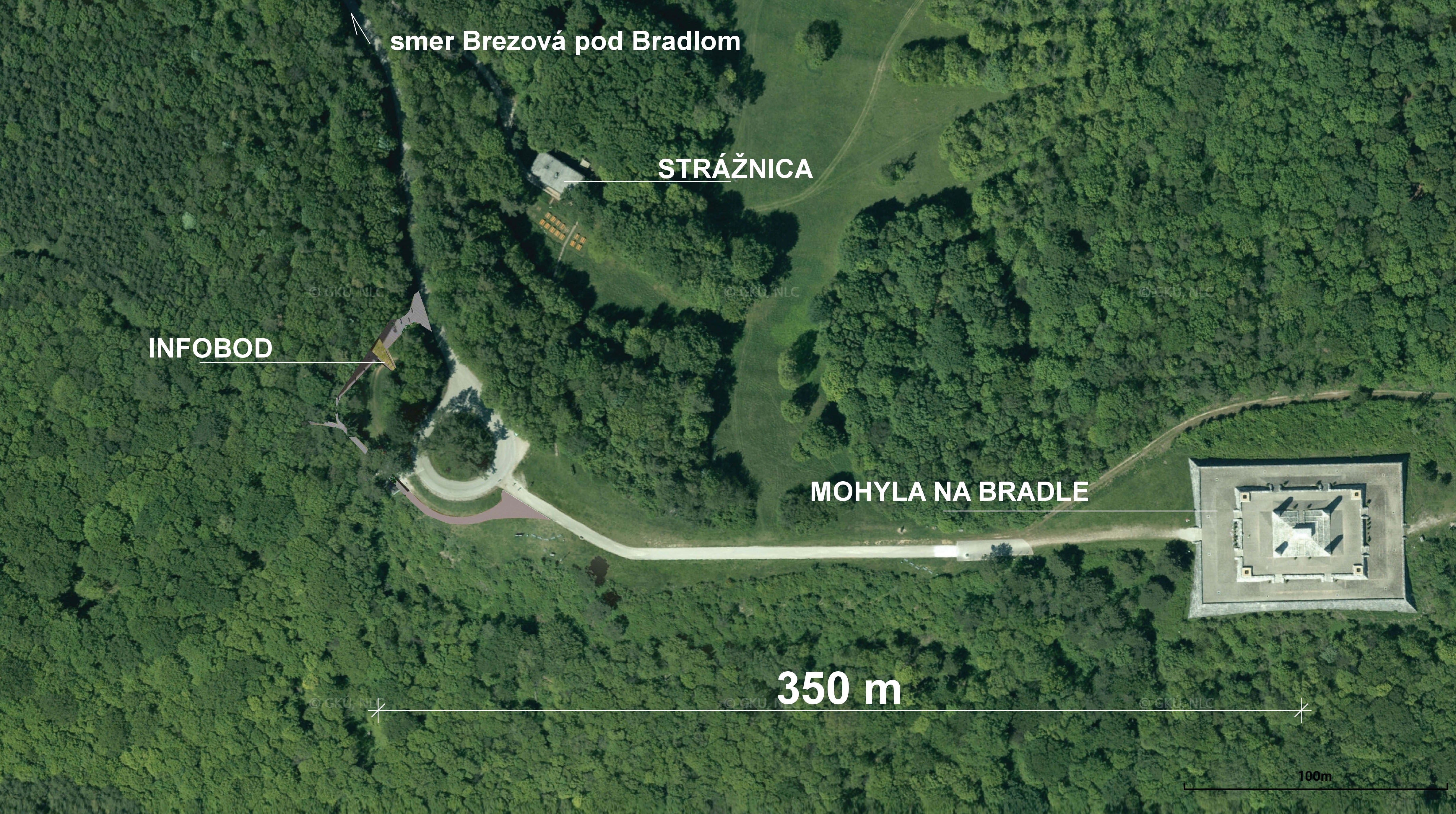 Infobod na Bradle je situovaný v zalesnenom svahu masívu Bradla. Objekt plní v rámci areálu úlohu zázemia na úrovni zodpovedajúcej významu pamätníka. Súčasťou stavby je priestor infostánku so zázemím (predaj suvenírov, výstavný priestor, prípadná prednášková miestnosť pre cca 25 ľudí) a samostatný priestor verejných WC. Obe funkcie sú navzájom prepojené prístreškom s plochou vegetačnou strechou. Minimalistická architektúra, zasadená do svahu masívu Bradla, rešpektuje nielen okolitý terén a dominantné umiestnenie pamätníka v krajine.