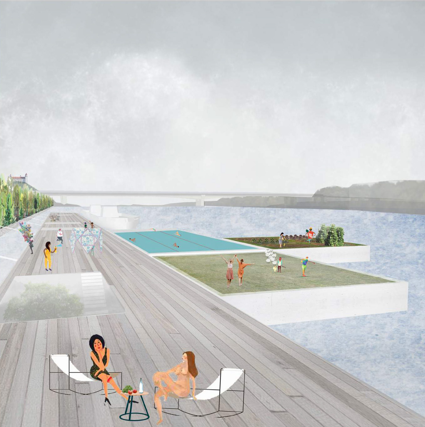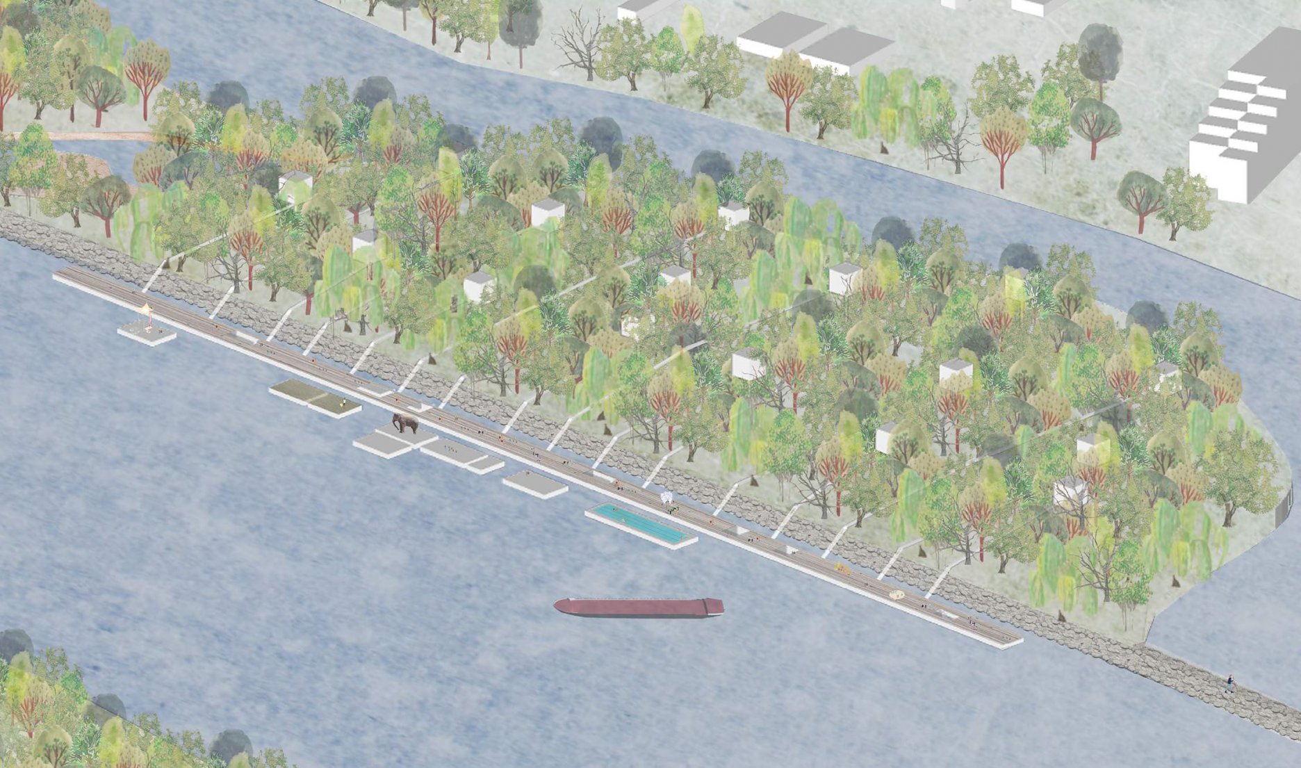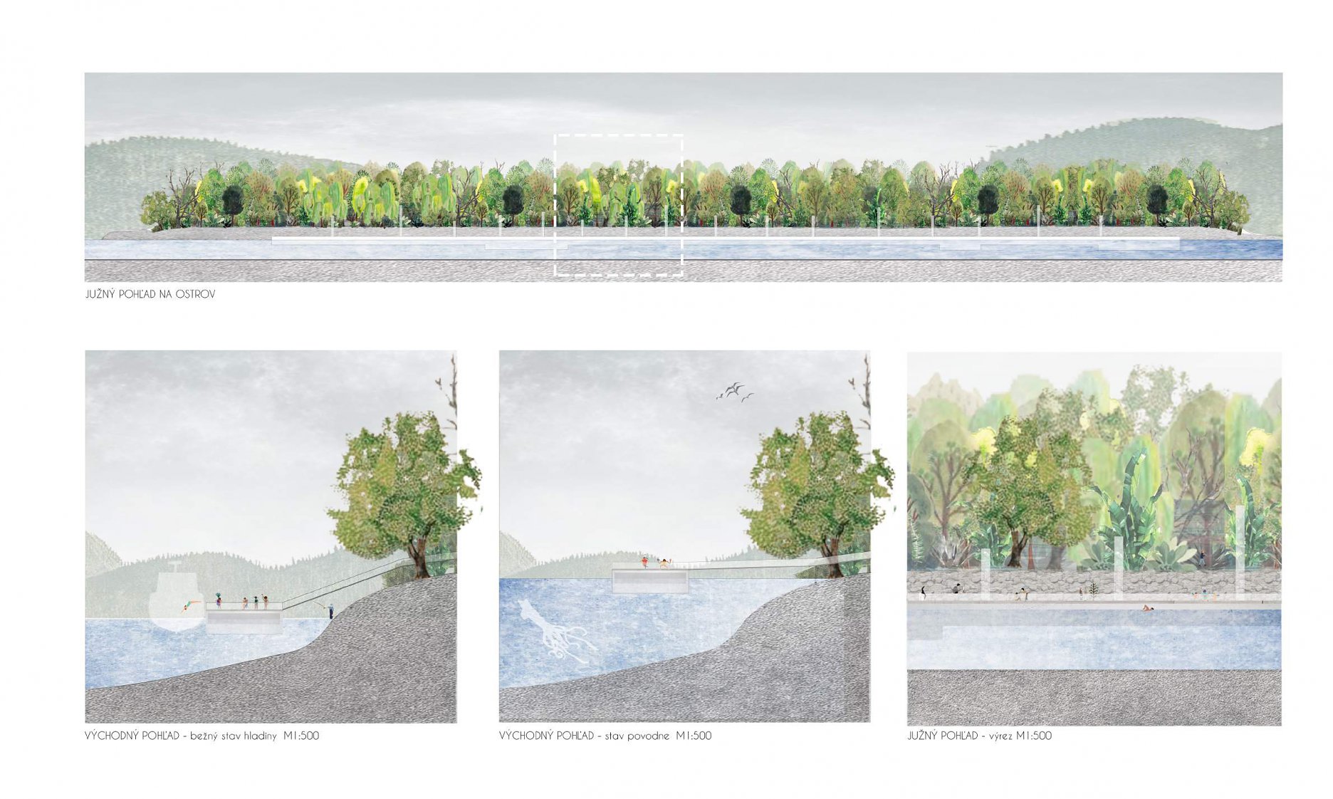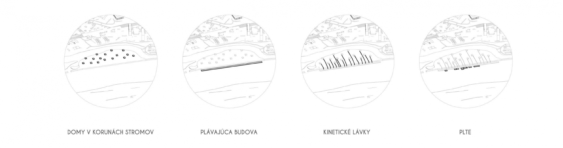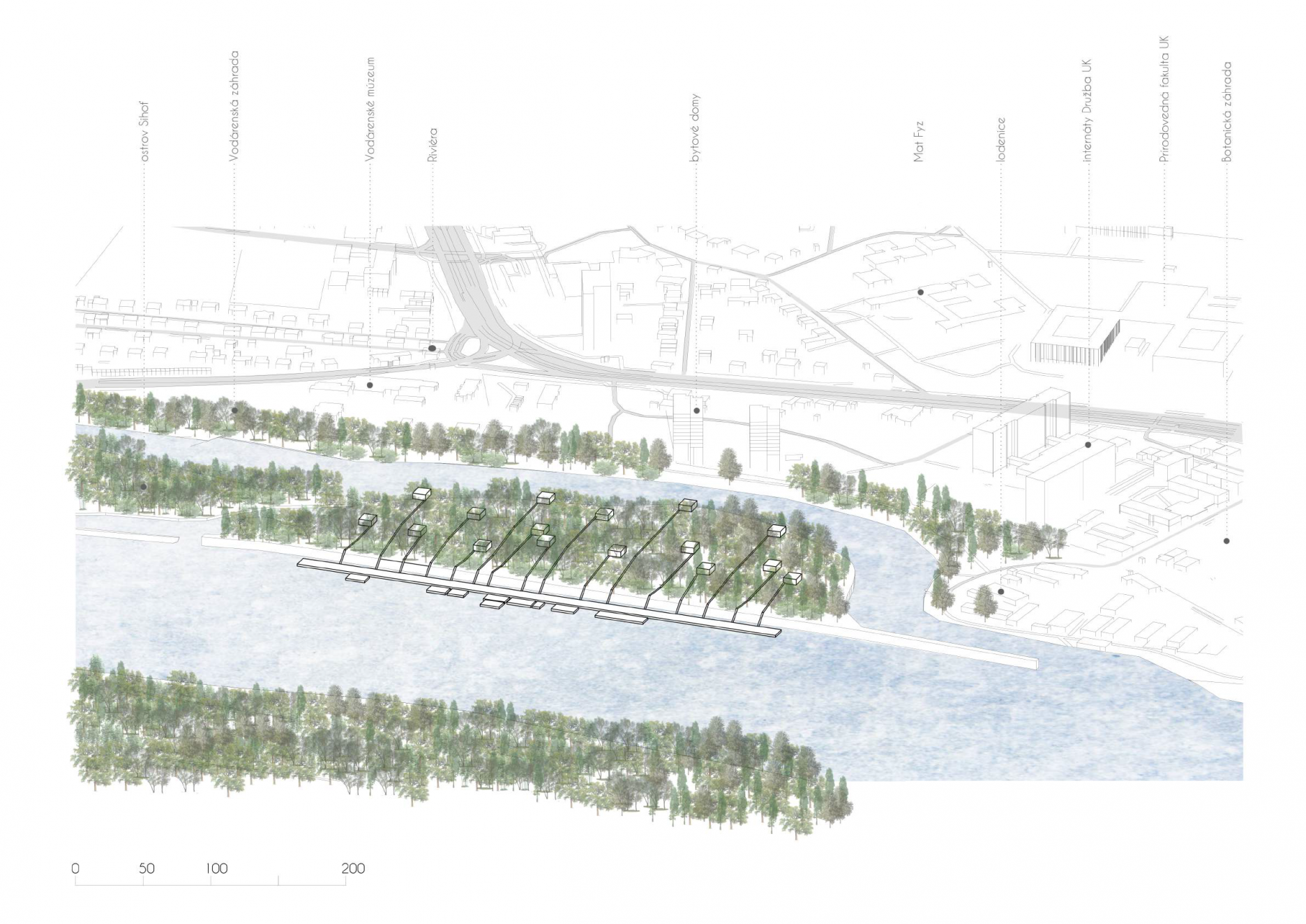 Nakoniec som sa rozhodla pre lodnú dopravu, ktorá je vhodná aj pri zásobovaní. Časť budov sa nachádza v korunách stromov a časť pláva na Dunaji. V mojom návrhu sa budovy dištancujú od výhľadu a komunikácie s Karloveský ramenom, kedže atmosféra tam je narušená intenzívnou zástavbou. Výhľady sú orientované na rieku a jej divoké brehy.
