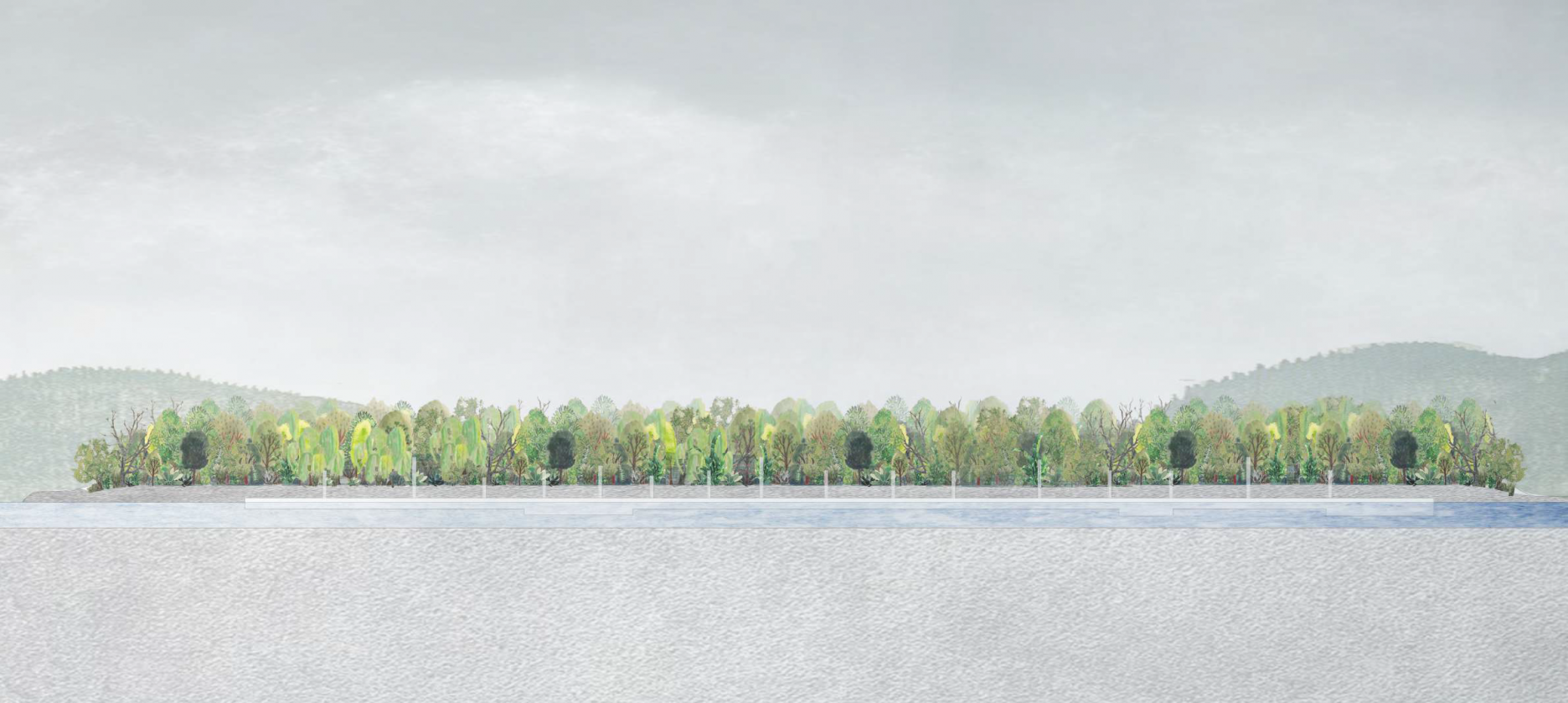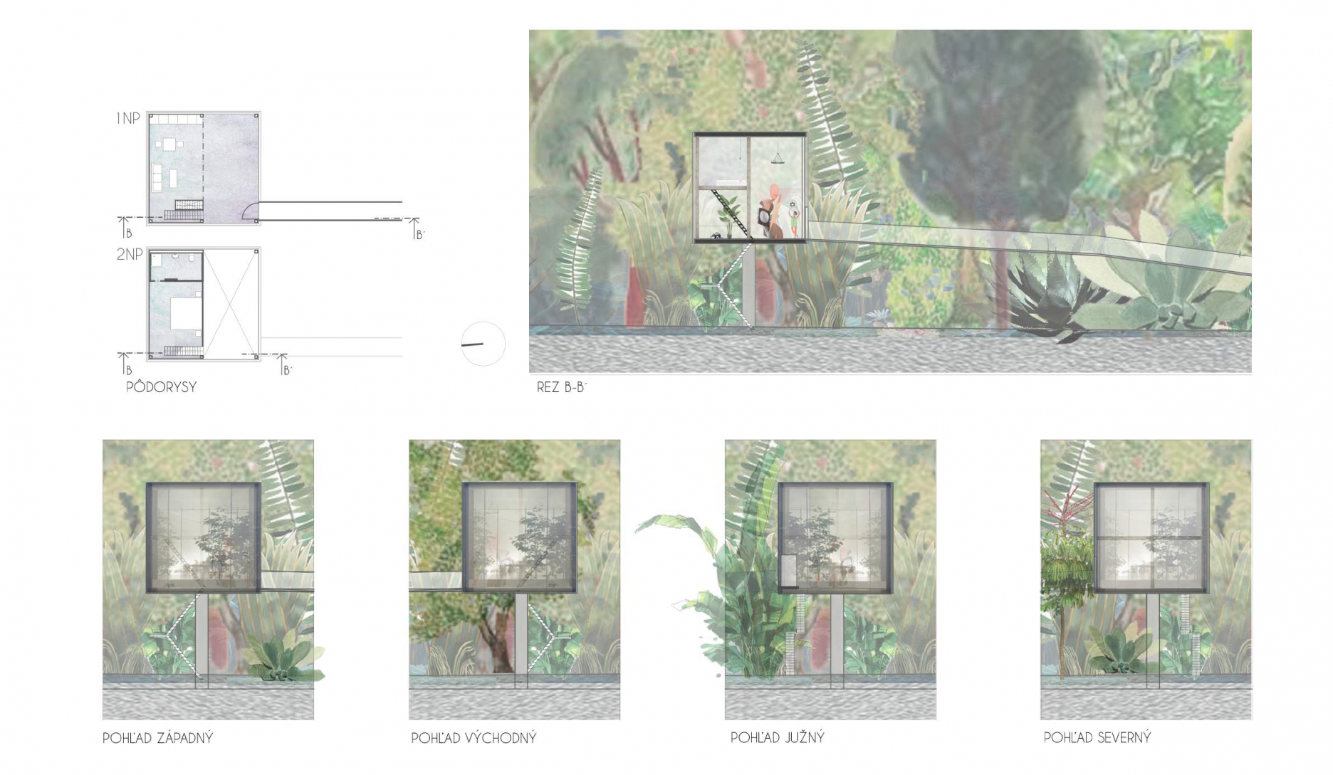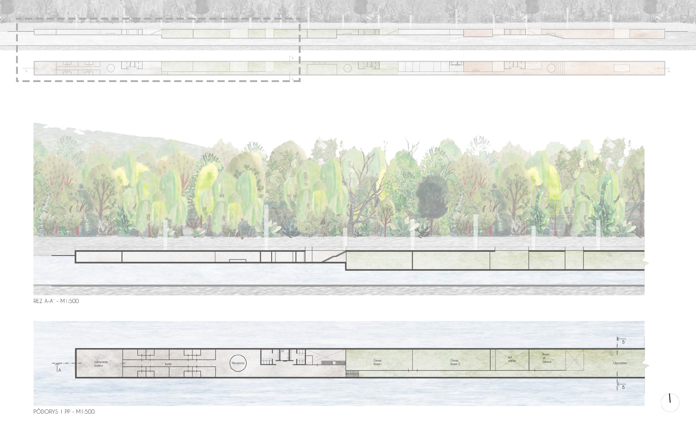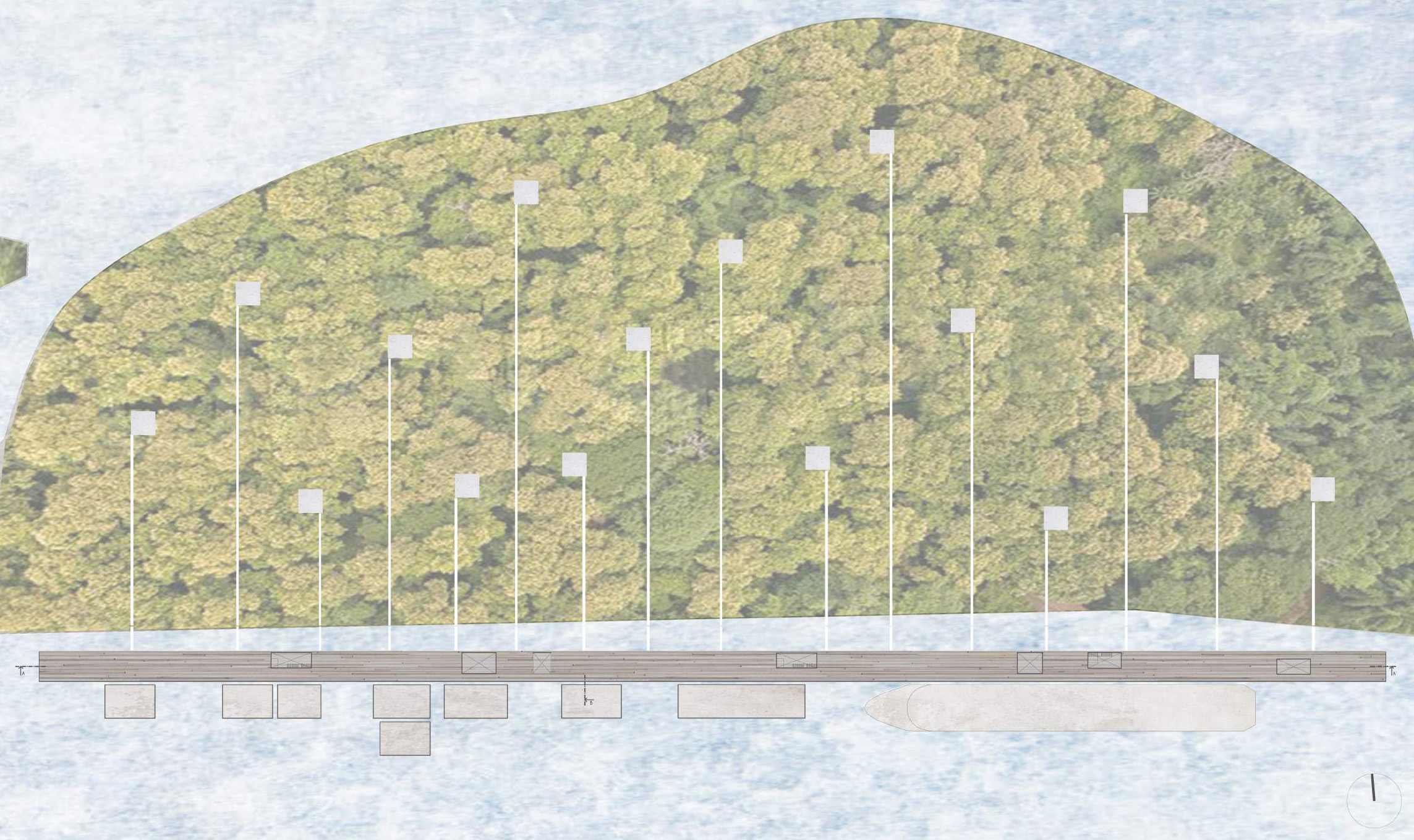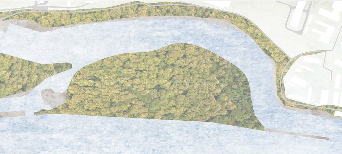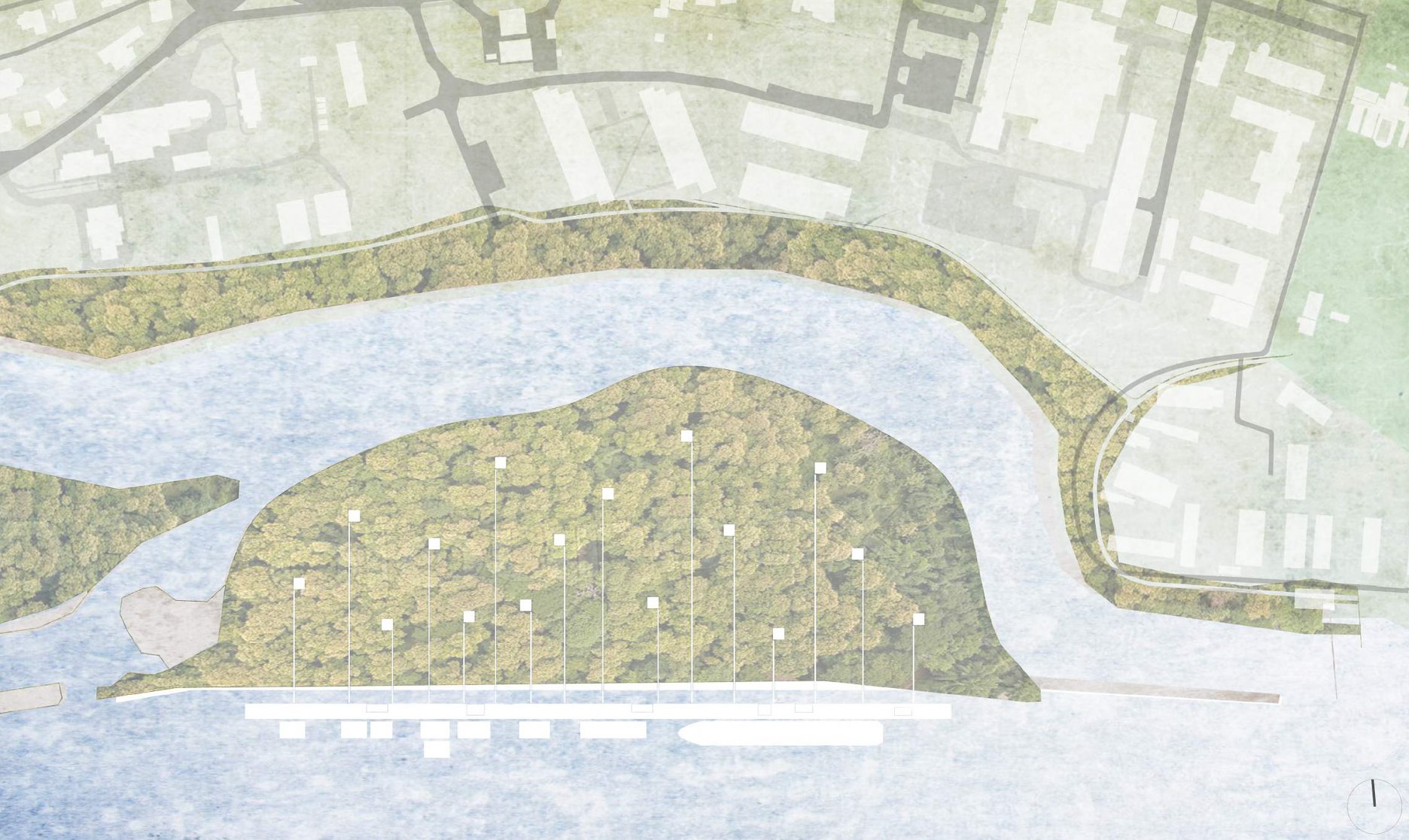 Nakoniec som sa rozhodla pre lodnú dopravu, ktorá je vhodná aj pri zásobovaní. Časť budov sa nachádza v korunách stromov a časť pláva na Dunaji. V mojom návrhu sa budovy dištancujú od výhľadu a komunikácie s Karloveský ramenom, kedže atmosféra tam je narušená intenzívnou zástavbou. Výhľady sú orientované na rieku a jej divoké brehy.