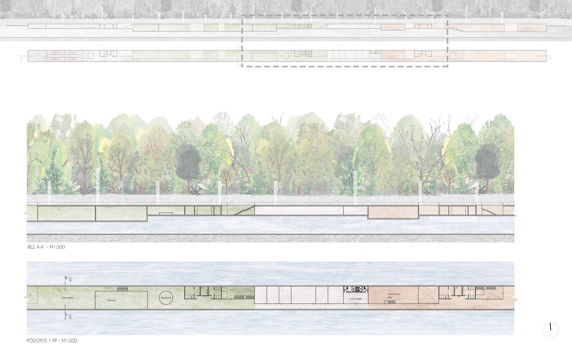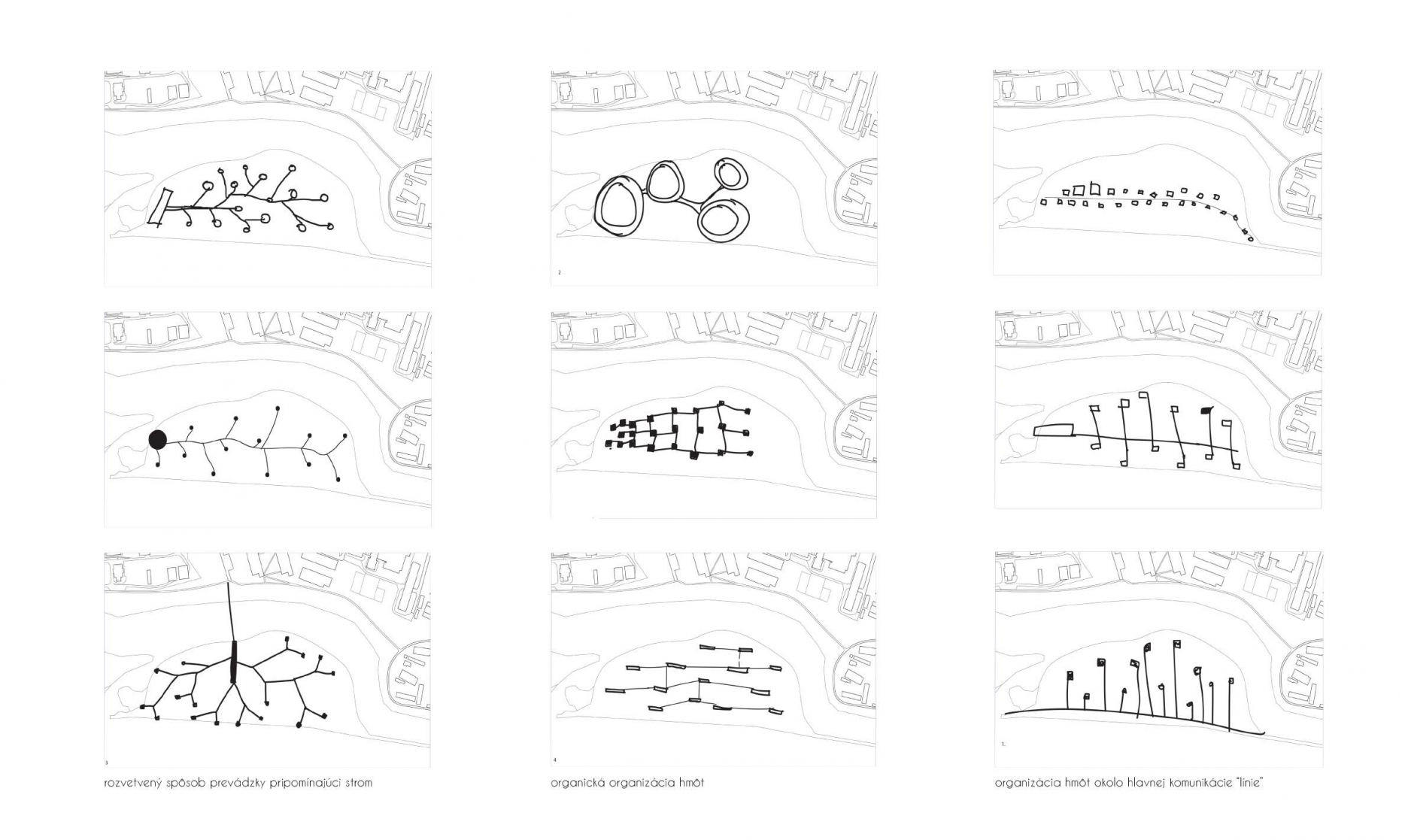 K navrhovaniu tvaru a prevádzky budovy bolo možné pristupovať rôznymi spôsobmi. V rozľahlej prírodnej lokalite bolo prirodzené funkcie rozdeliť do viacerých menších objektov. Komunikácie sa mohli rozvetvovať rôznymi spôsobmi, budovy bolo možné kvôli možným záplavám situovať na teréne, pod zemou, na hladine rieky, alebo v korunách stromov. Pri doprave na samotný ostrov som uvažovala nad prepojením pešej lávky s miestnymi komunikáciami