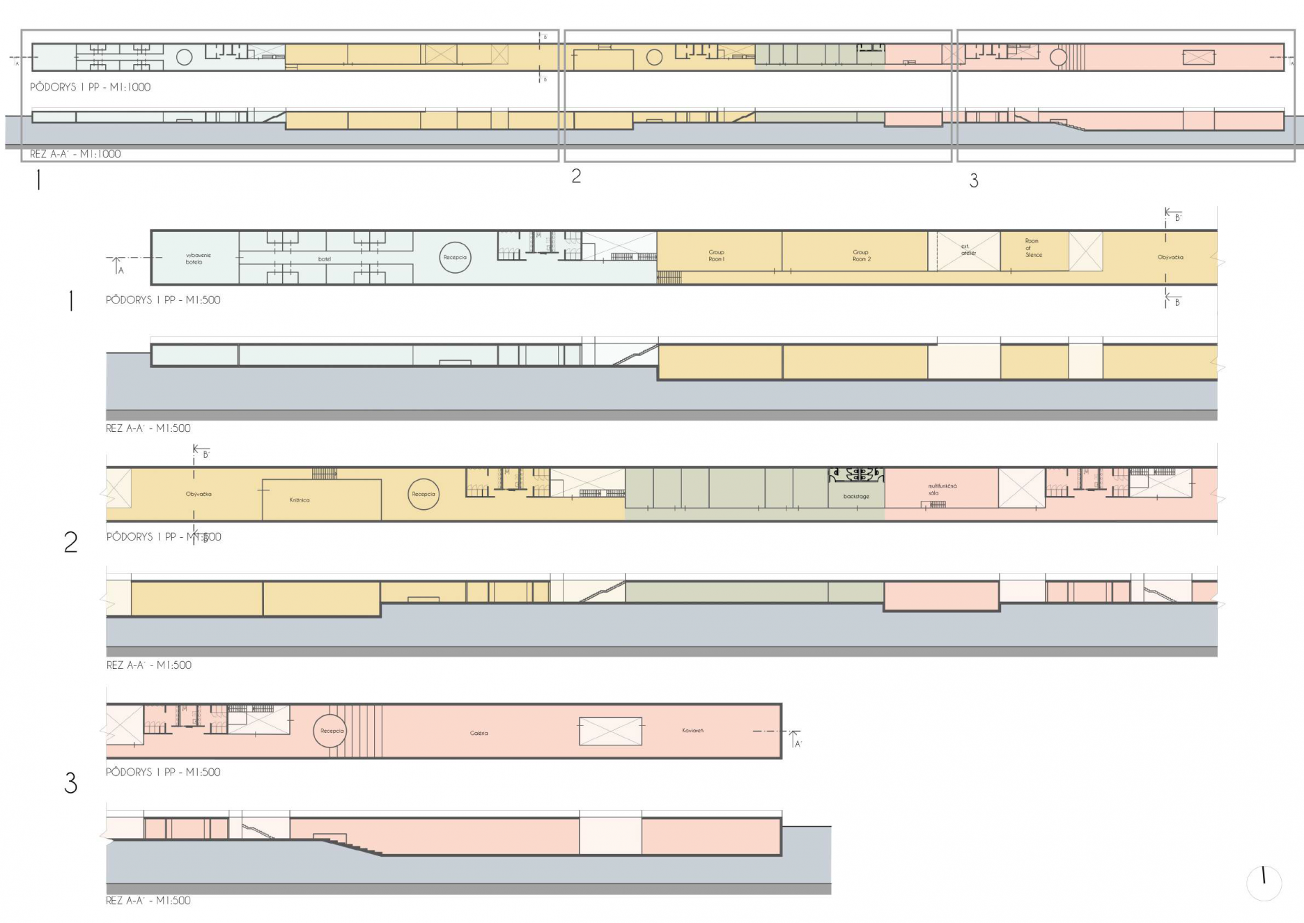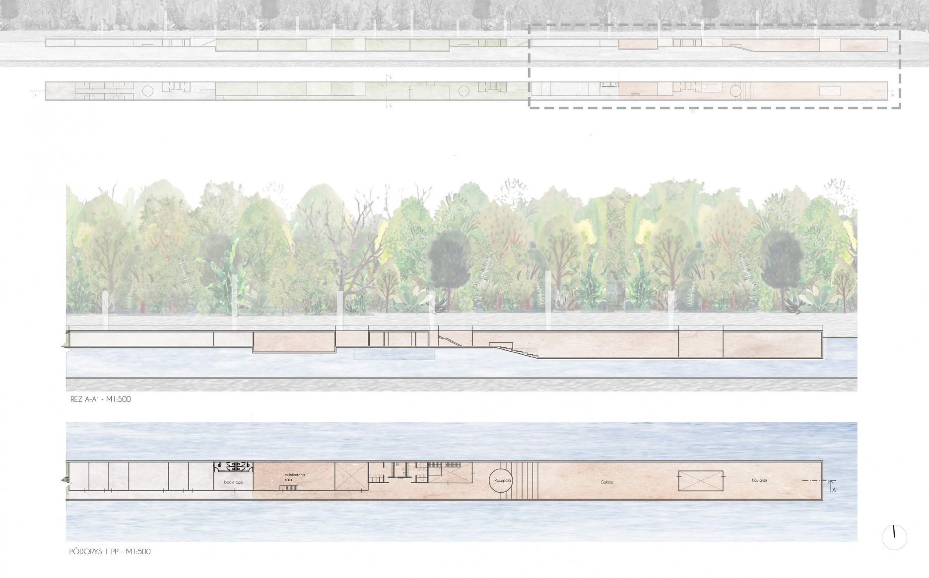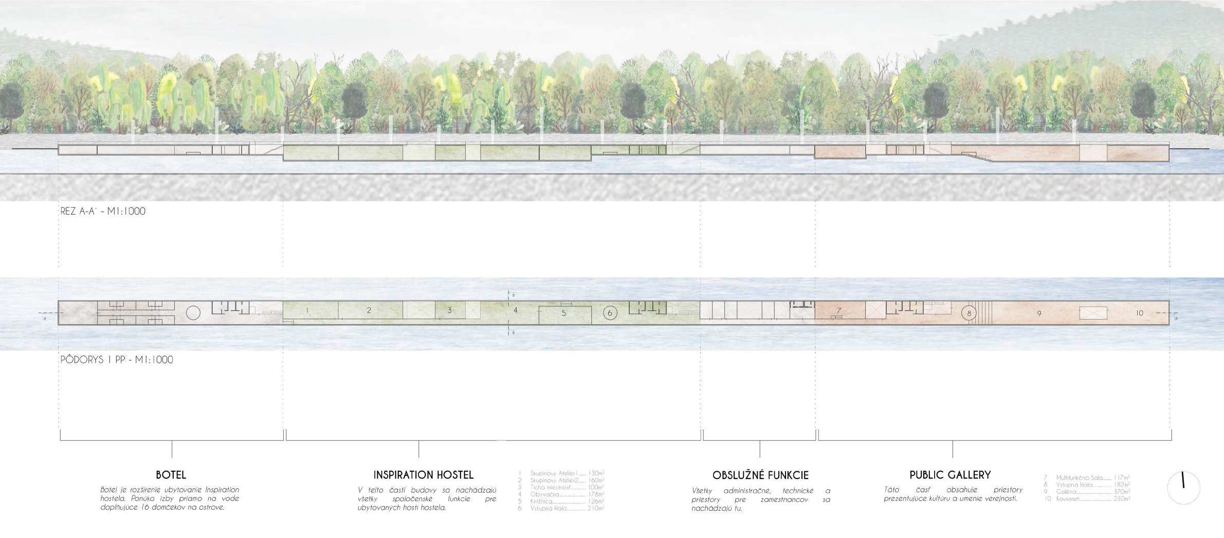 Na Dunaji pri regulovanom brehu ostrova pláva lineárna budova správajúca sa ako pontón Všetky funkcie sa nachádzajú pod vodou a strecha slúži ako komunikácia. Na "lodi" sa nachádzajú spoločenské zázemie umeleckého hostela, botel (ako iný spôsob ubytovania pre návštevy a kultúrna časť s galériou, kaviarňou a multifunkčnou sálou.