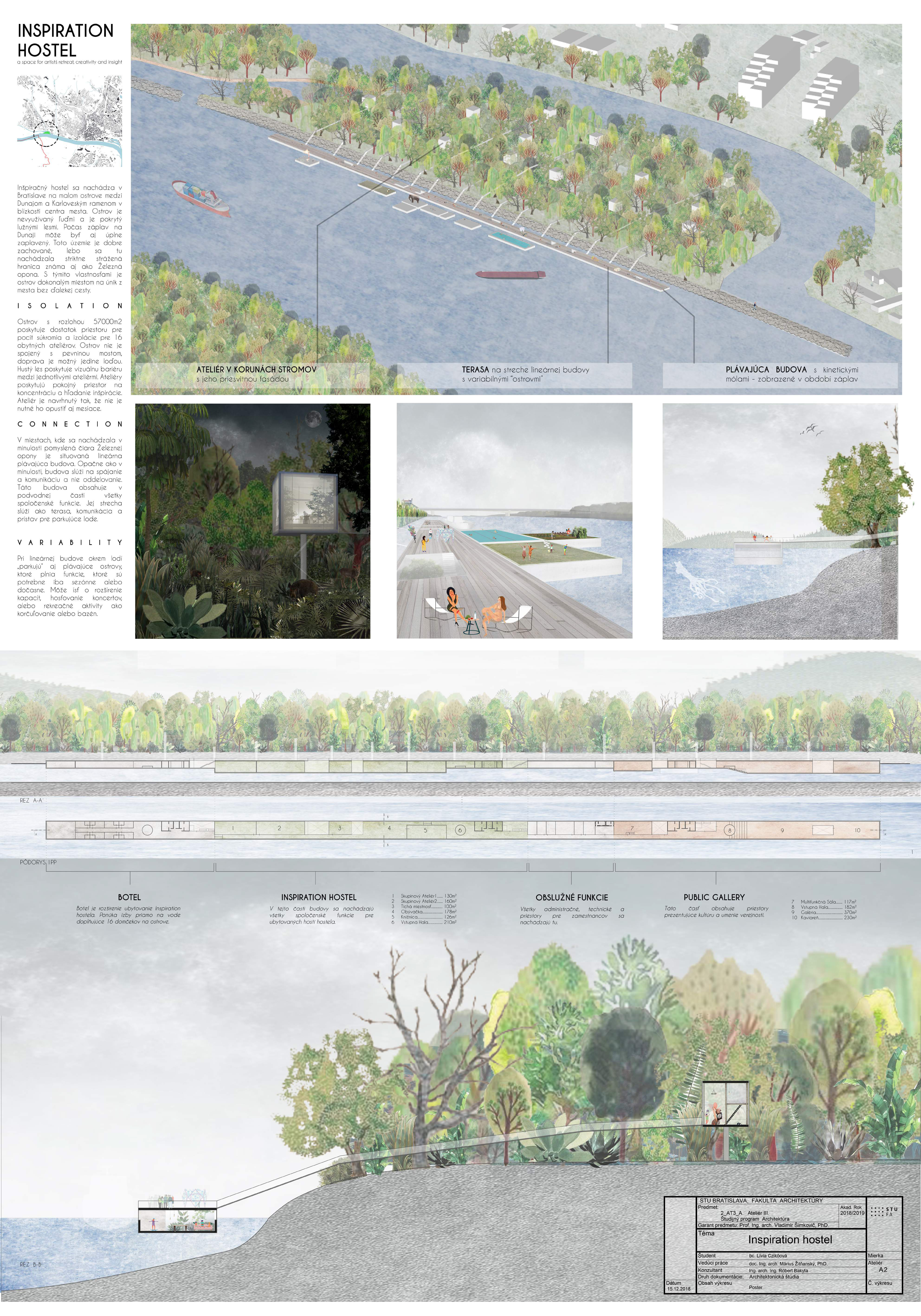 Vstup do medznárodnej ideovej súťaže. Návrh hostela - miesta určeného pre umelcov. Pávajúci hotel s ubytovaním a zázemím je prepojený s bunkami ateliérov roztrúsenými na ostrove Karloveského ramena. Porota ocenila atmosféru ateliérov v korunách stromov a koncept prepojenia plávajúcej budovy prostredníctvom kinetických lávok.