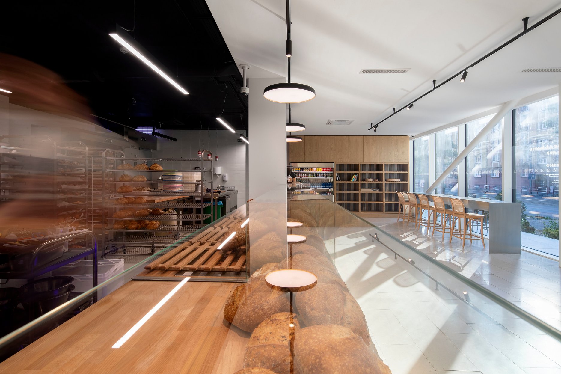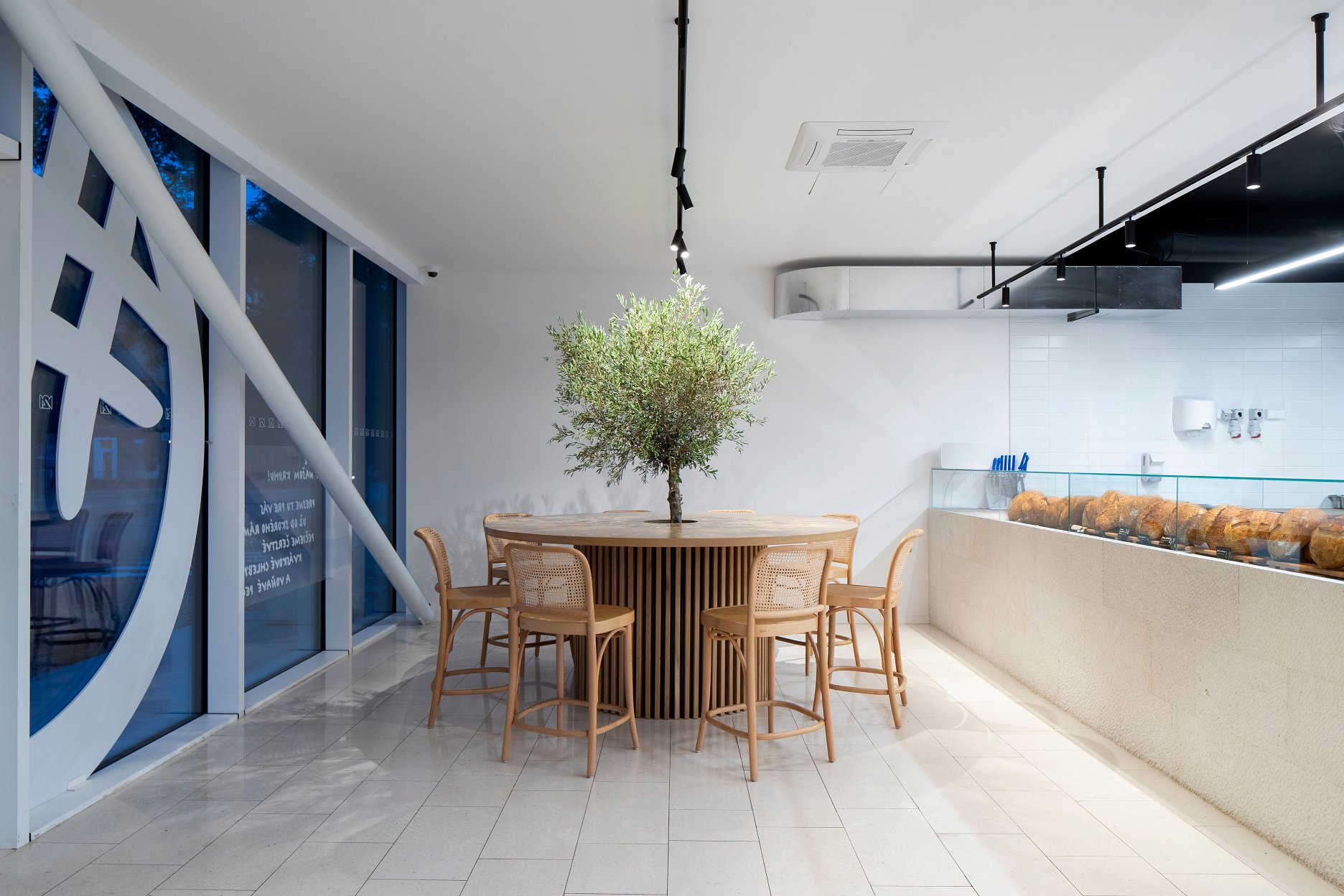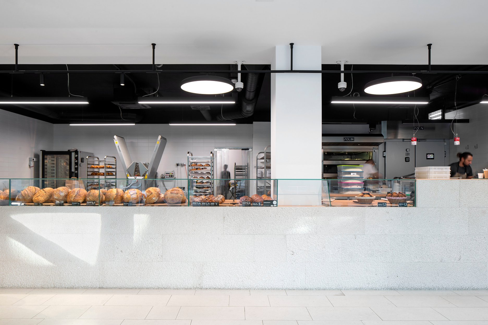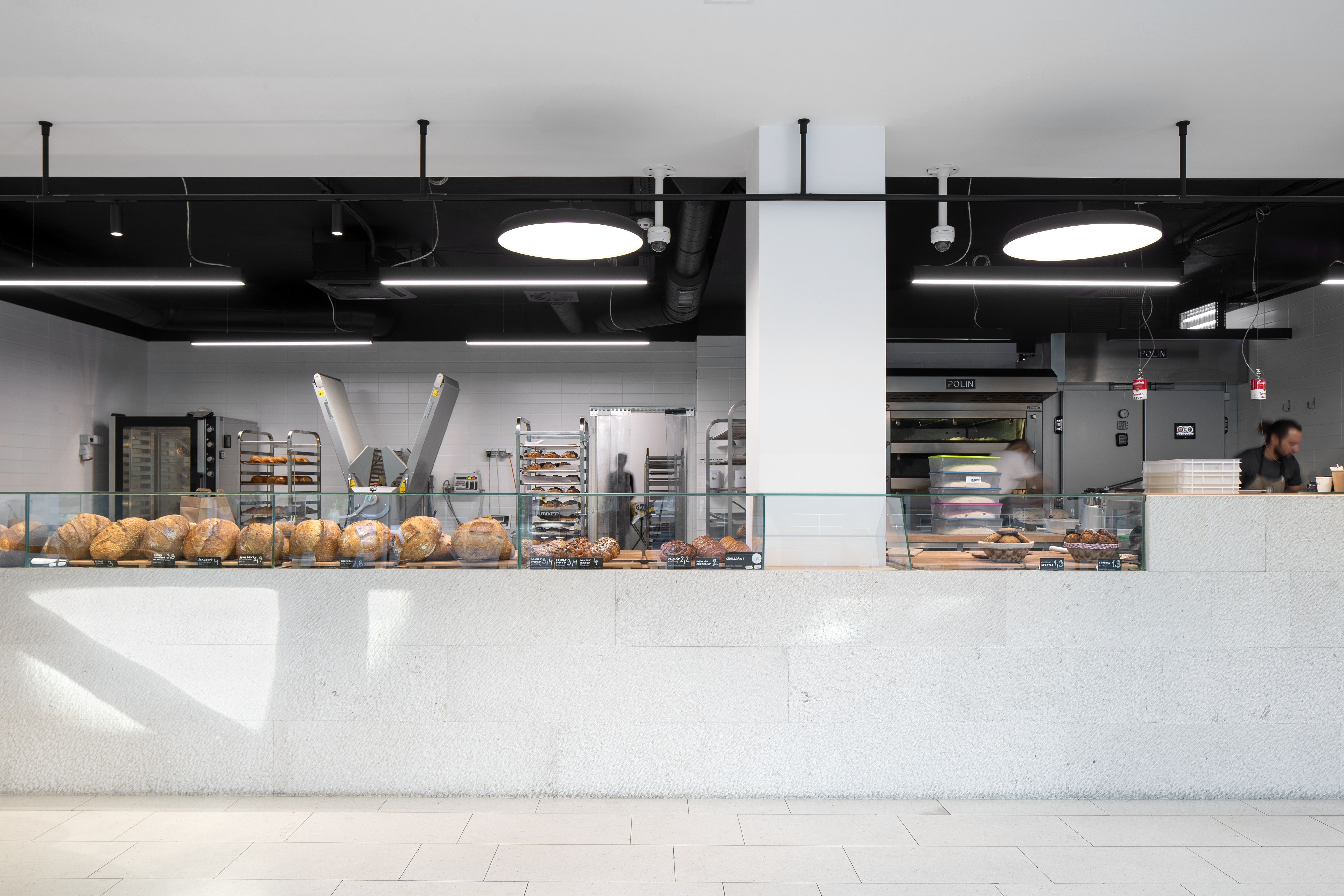 Pečivo je vystavené za sklom hneď oproti vstupu ako hlavné lákadlo prevádzky. Odbytová časť pekárne je podľa slov autorov z ateliéru GRUP architects poňatá neutrálne, necháva vyniknúť produkt a upriamuje pozornosť na výrobu.
