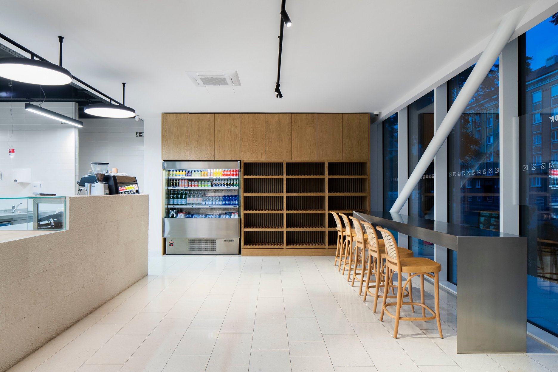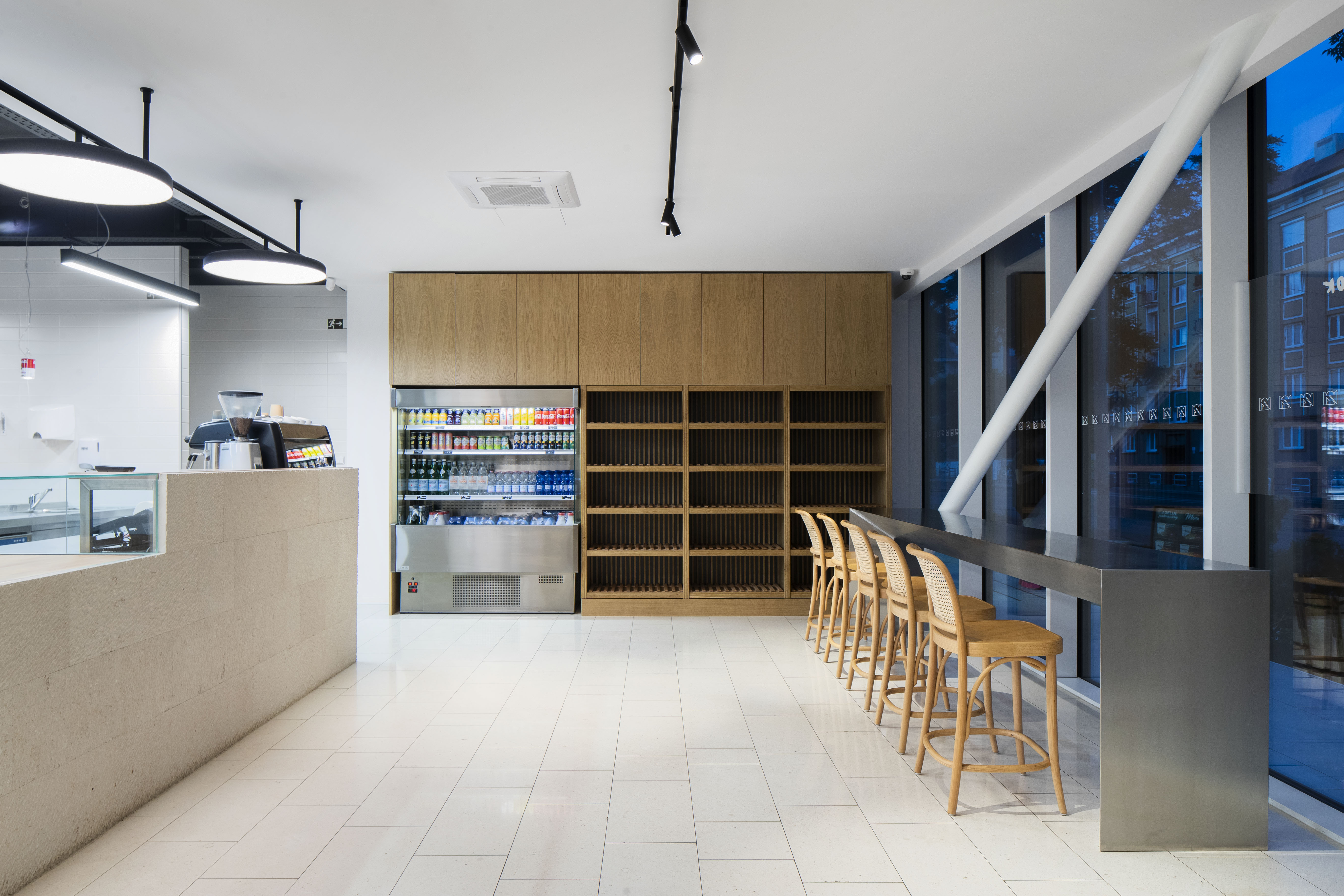 Krátkodobé sedenie architekti sústredili okolo kruhového stola s olivovým stromčekom a pozdĺž nerezového pultu s výhľadom do ulice.