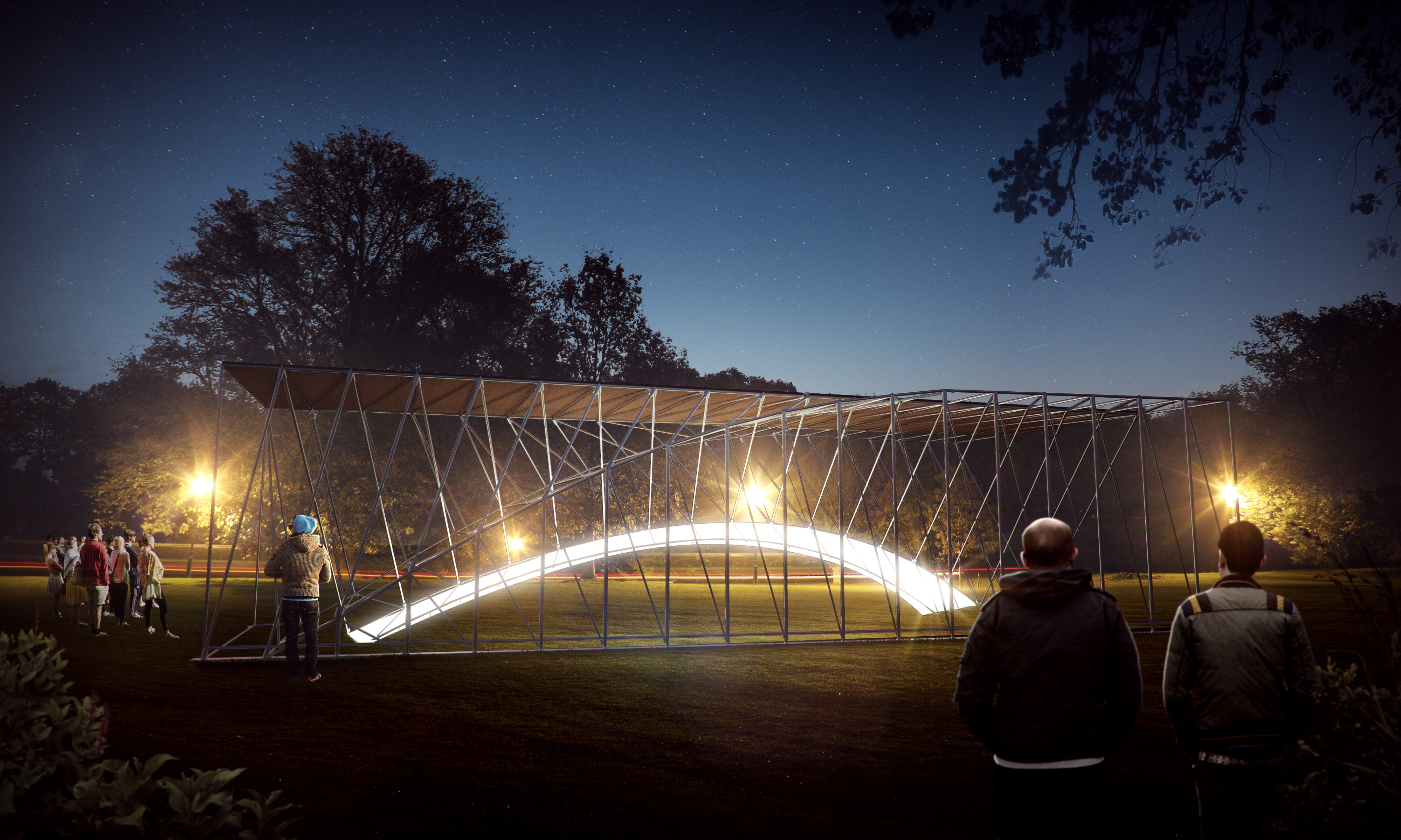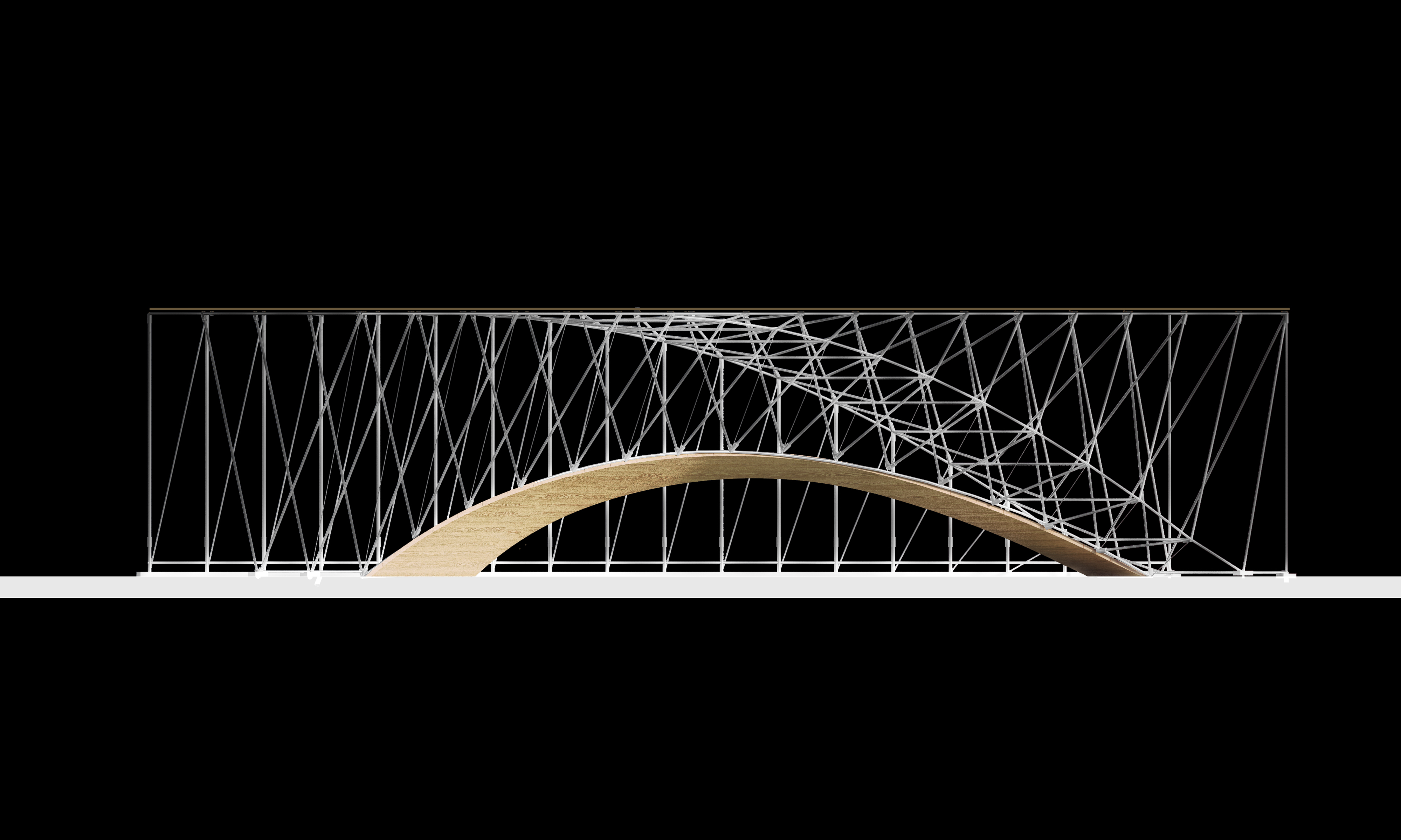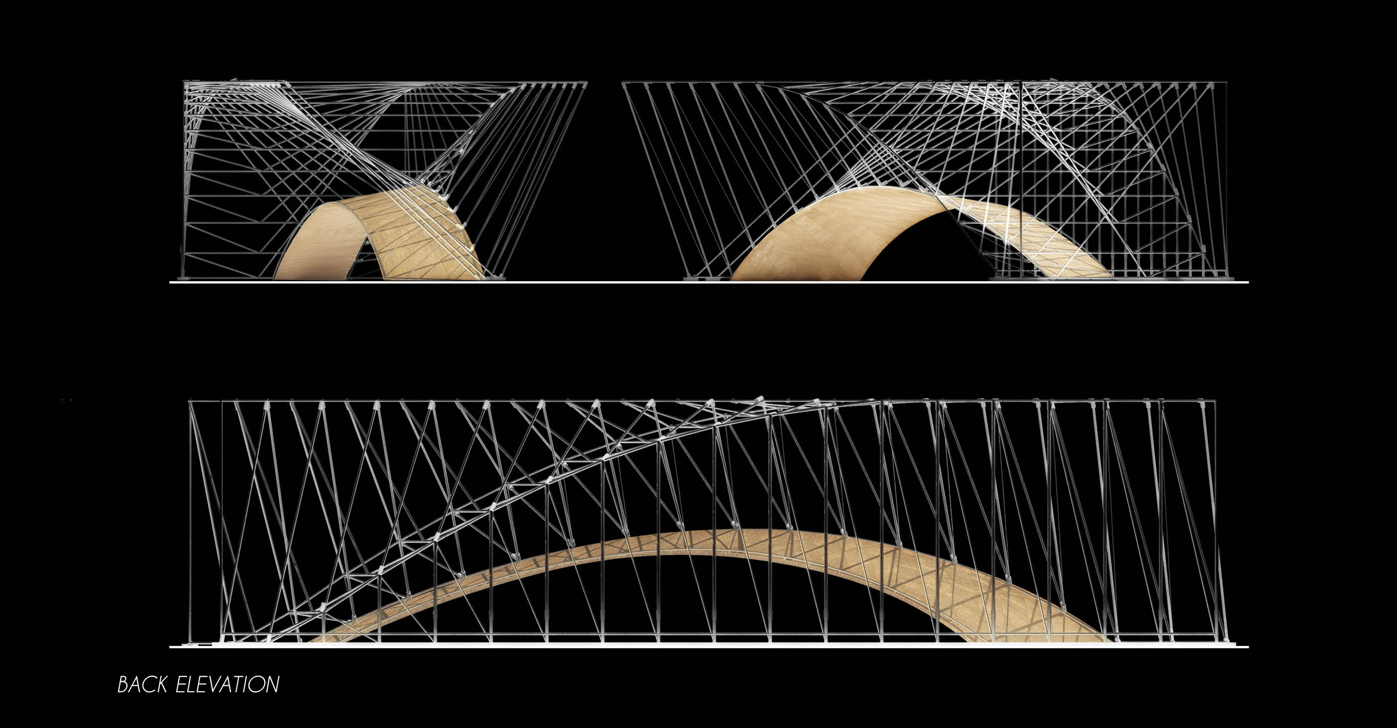 The pavilion consist of several features, firstly is the reading of lines (in the structural system), secondly is the creation of imaginary surfaces, and thirdly the volume (most present in the overall external view of the pavilion) . What begins as a reading of volume ultimately reveals a system of beams assembled in revolution throughout space that comes in and out of view. In addition, these qualities are accentuated further by both natural and artificial lighting effects.