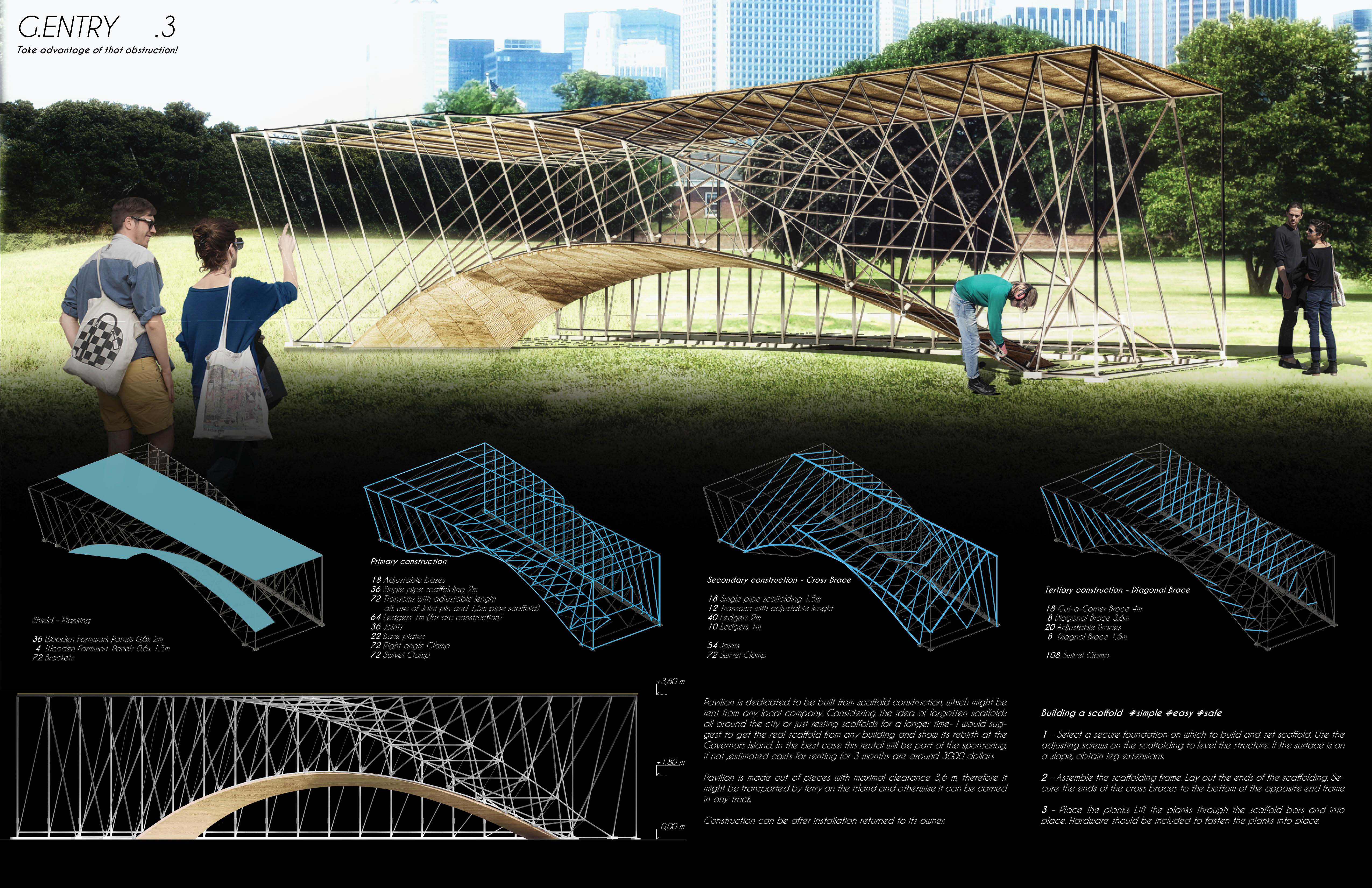 The pavilion is to be created out of recycled scaffolding that remains along the streets of New York City. By giving the scaffolds a new purpose the seemingly regular obstruction transitions from waste to architecture, creating a new purpose for an otherwise wasted material.
