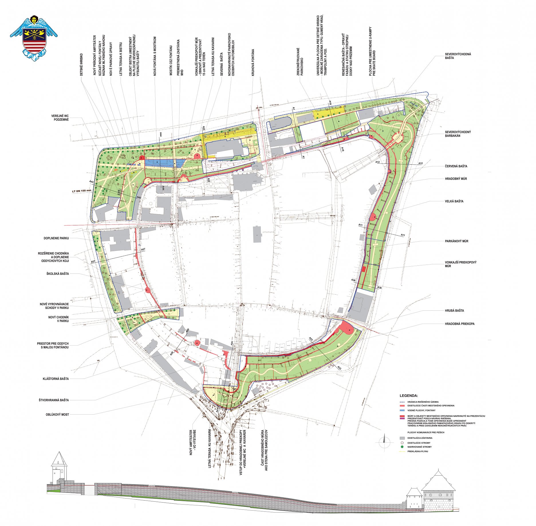 V hradobnej priekope sme umiestnili rôzne funkcie, ako detské ihrisko, interaktívnu fontánu, náučný chodník - galériu významných historických osobnosti, malý amfiteáter, exteriérovú galériu plastík... Podstatnú časť plôch tvoria parkové úpravy. Jednotlivé segmenty hradobnej priekopy sú prepojené systémom chodníkov, čím vznikla pre obyvateľov príležitosť na prechádzky a oddych. Priestory v objektoch bášt sú navrhnuté pre rôzne funkcie služieb ako sú predajne, kaviarne, alebo galérie. Nová náplň by mala prispieť k oživeniu stavieb, ktoré sa zapoja do života mesta, čo je nakoniec najlepšia forma ich ochrany.