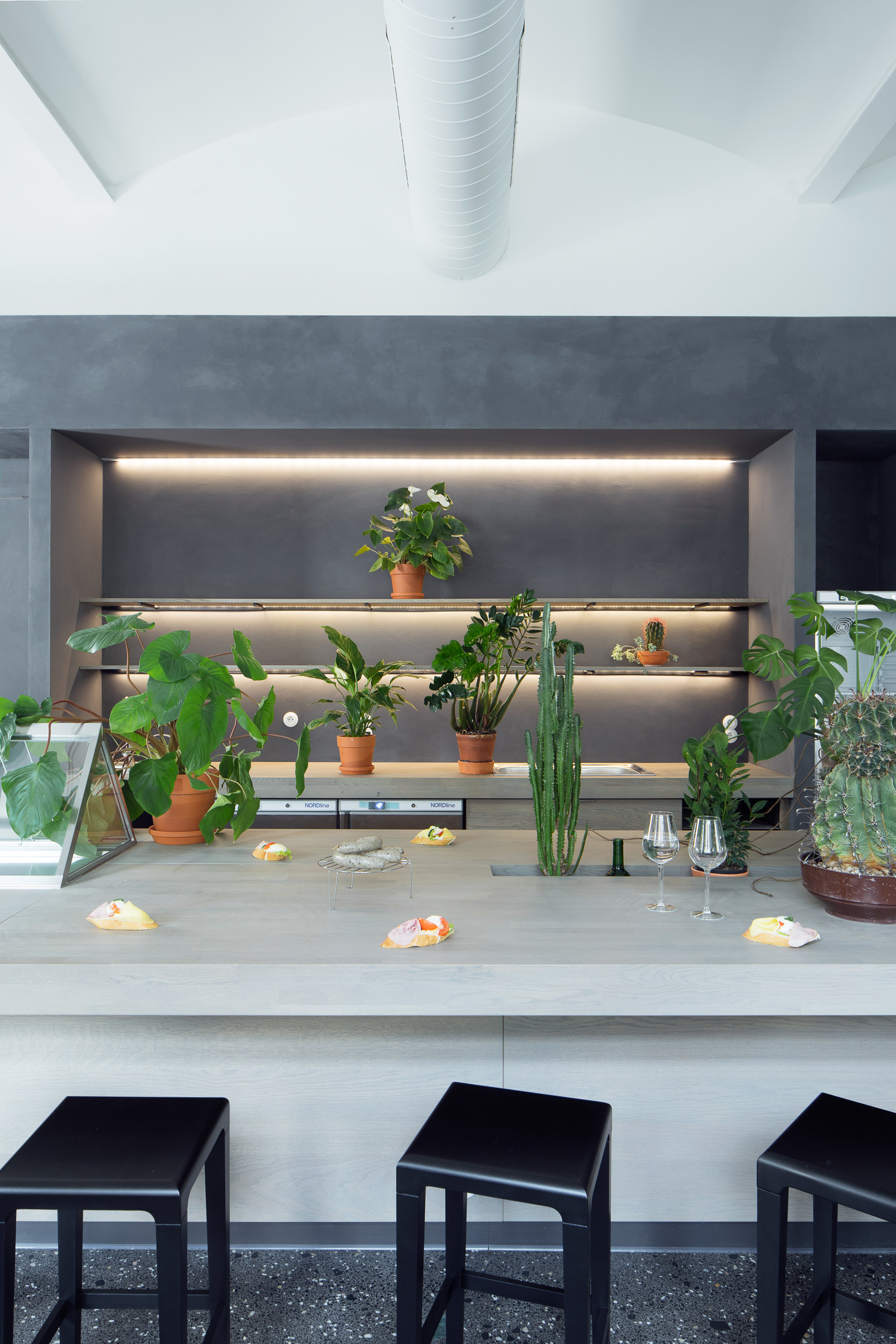 Odkaz na dnes neexistující průchod mezi domem a kostelem sv. Mikuláše je vepsán do nové arkády, procházející skrze celý parter v místě původní obvodové zdi. Arkáda přetíná hlavní prostor přízemí - kavárny, navádí ke schodišti, k vnitřnímu dvorku a zadním místnostem. Centrálním prvkem kavárny je bar z masivního dřevěného bloku. Jeho hmota zastřešuje všechny aktivity s barem spojené – zákazník je vtažen do procesu přípravy.
