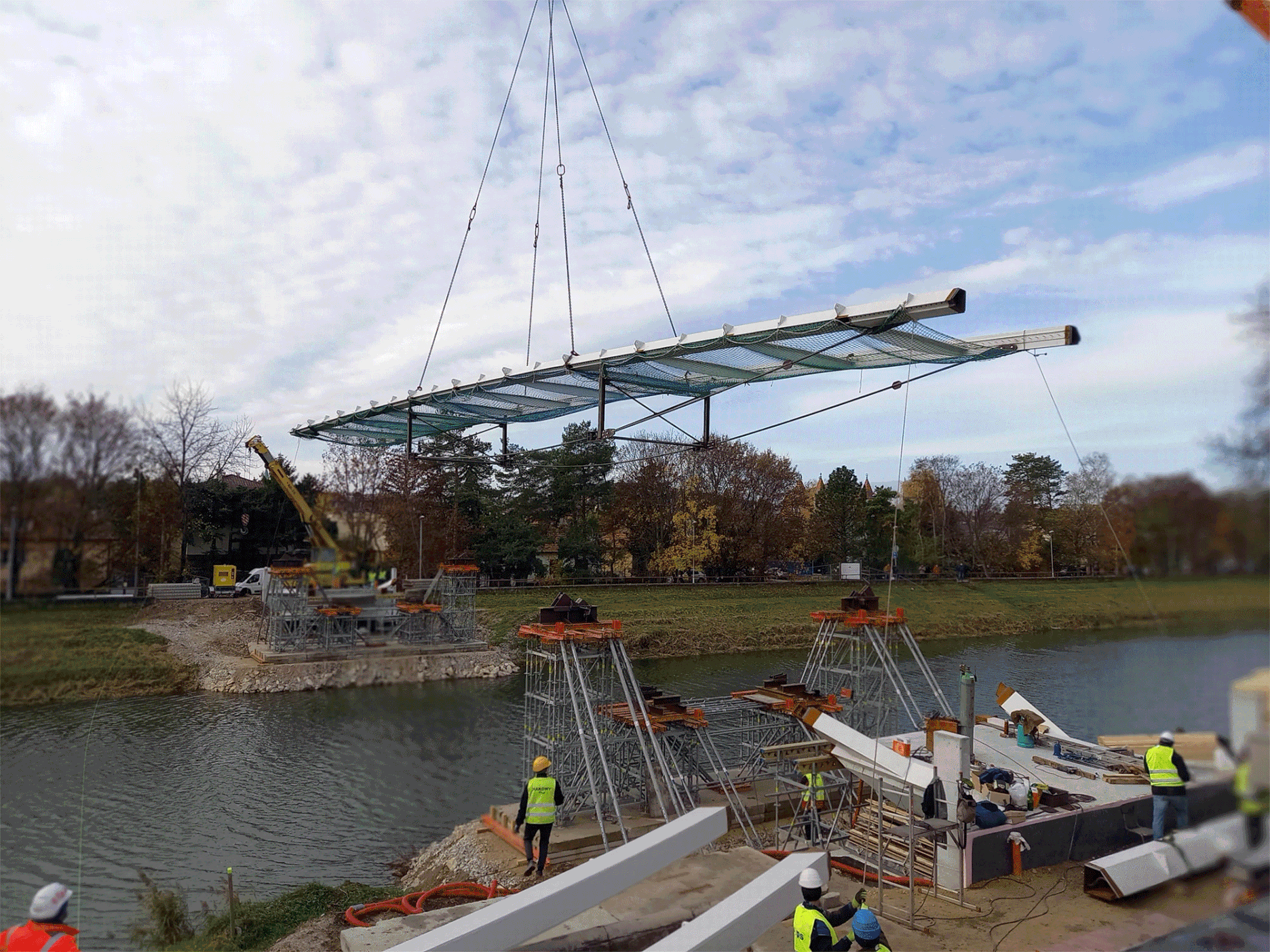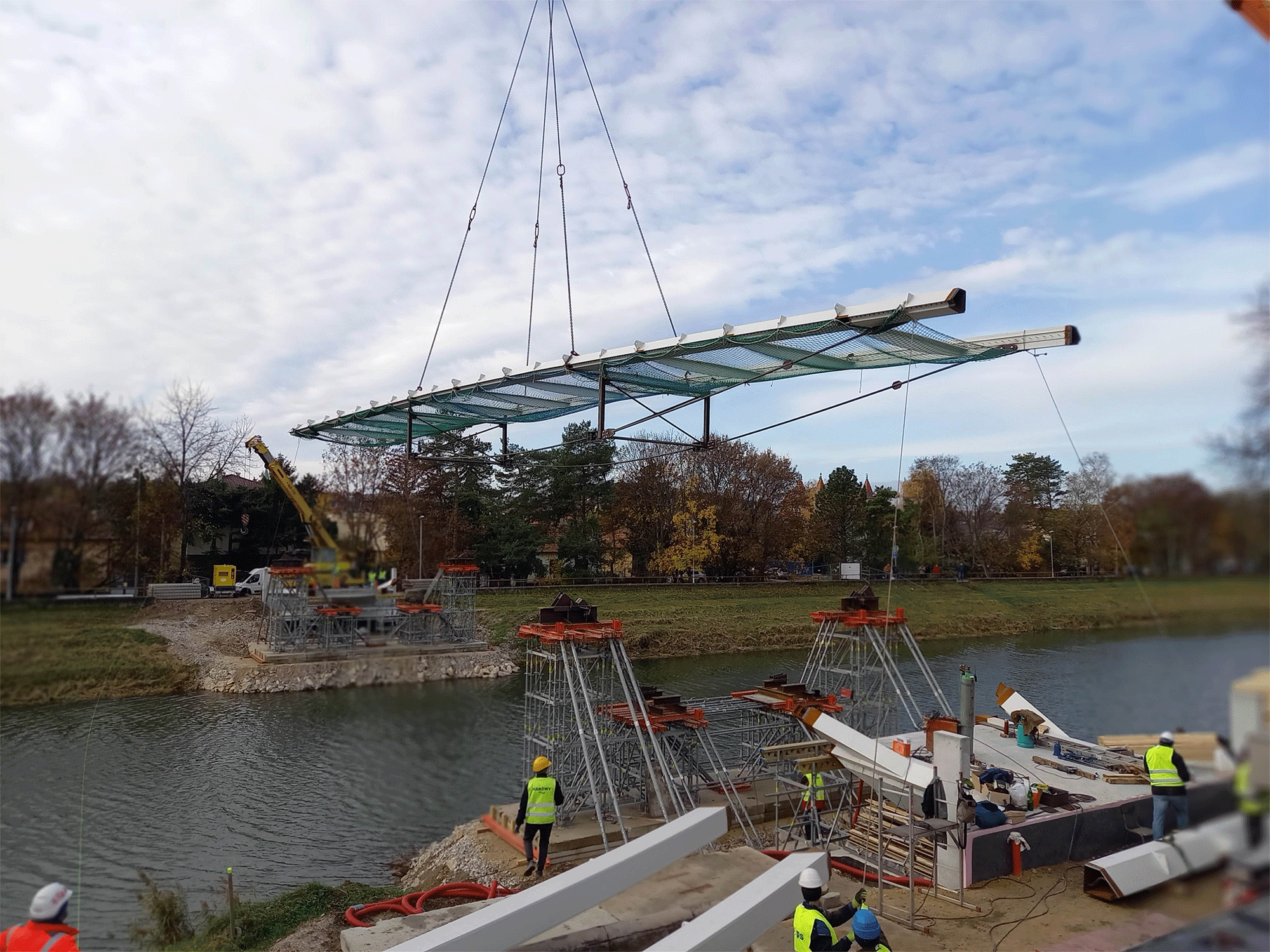 Technológia výstavby bola navrhnutá tak, aby stavba minimálne ovplyvnila život v priľahlom okolí, a aby nezasahovala do koryta rieky. Po realizácii pilót bola osadená betonárska výstuž opier a zárodky pozdĺžnych oceľových nosníkov a oblúkov. Potom boli podpery vybetónované. Aby nebolo nutné stavať montážne podpery v rieke, bola oceľová mostovka zostavená z pozdĺžnych krajných nosníkov a priečnikov montážne stužená káblami situovanými pod nosníkmi. To umožnilo naraz zmontovať celú mostovku a podoprieť ju len montážnymi podperami situovanými pri krajných opierkach.