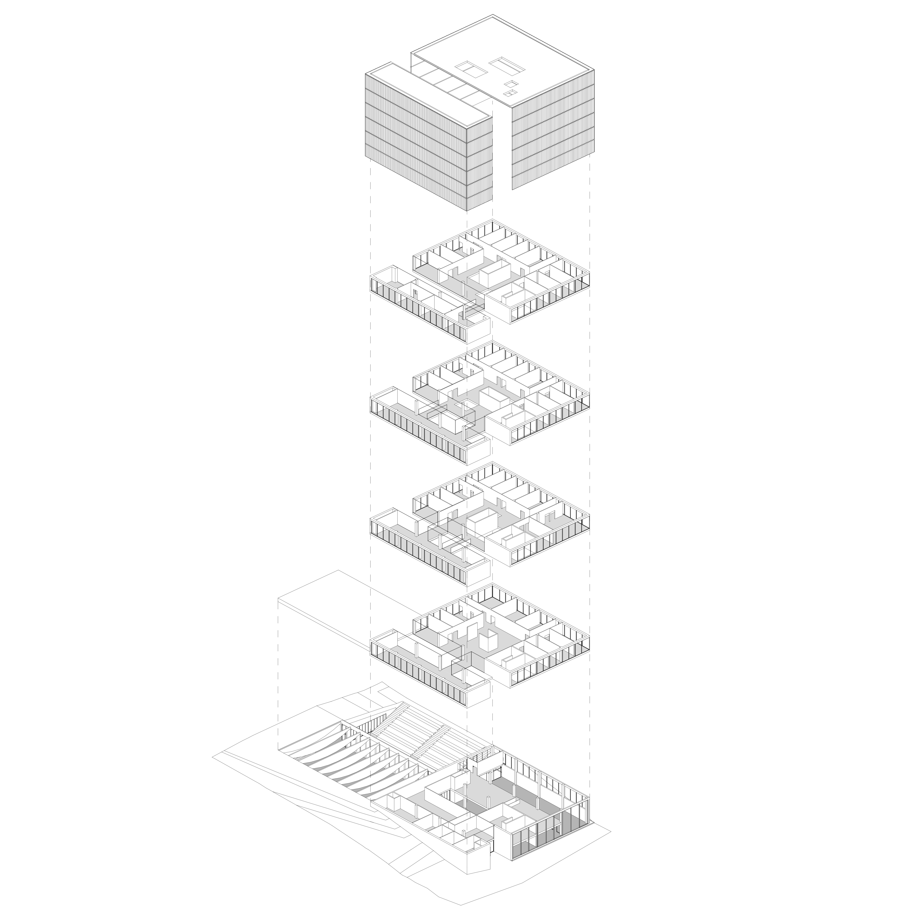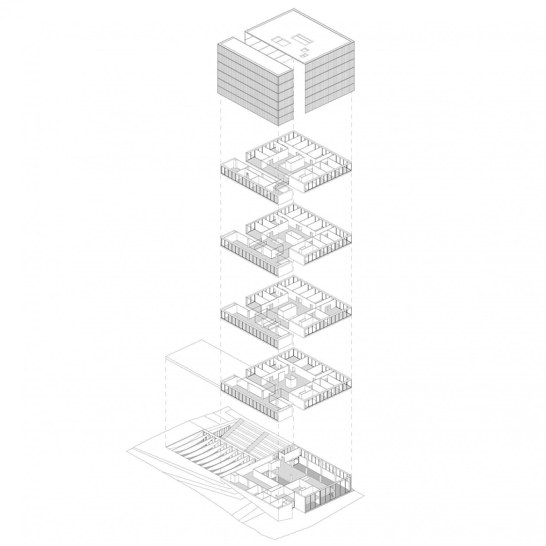 V najvyššom bode hlavnej osi leží budova "BASE" pre študentov bakalárskeho programu, s neobvyklou zavesenou konštrukciou. Tri betónové jadrá nesú predpätú monolitickú konštrukciu pod strechou, ktorá distribuuje zaťaženie zavesených podláh. Zvolené riešenie umožnilo vizuálne otvoriť prízemie, bez akýchkoľvek dodatočných konštrukcií.